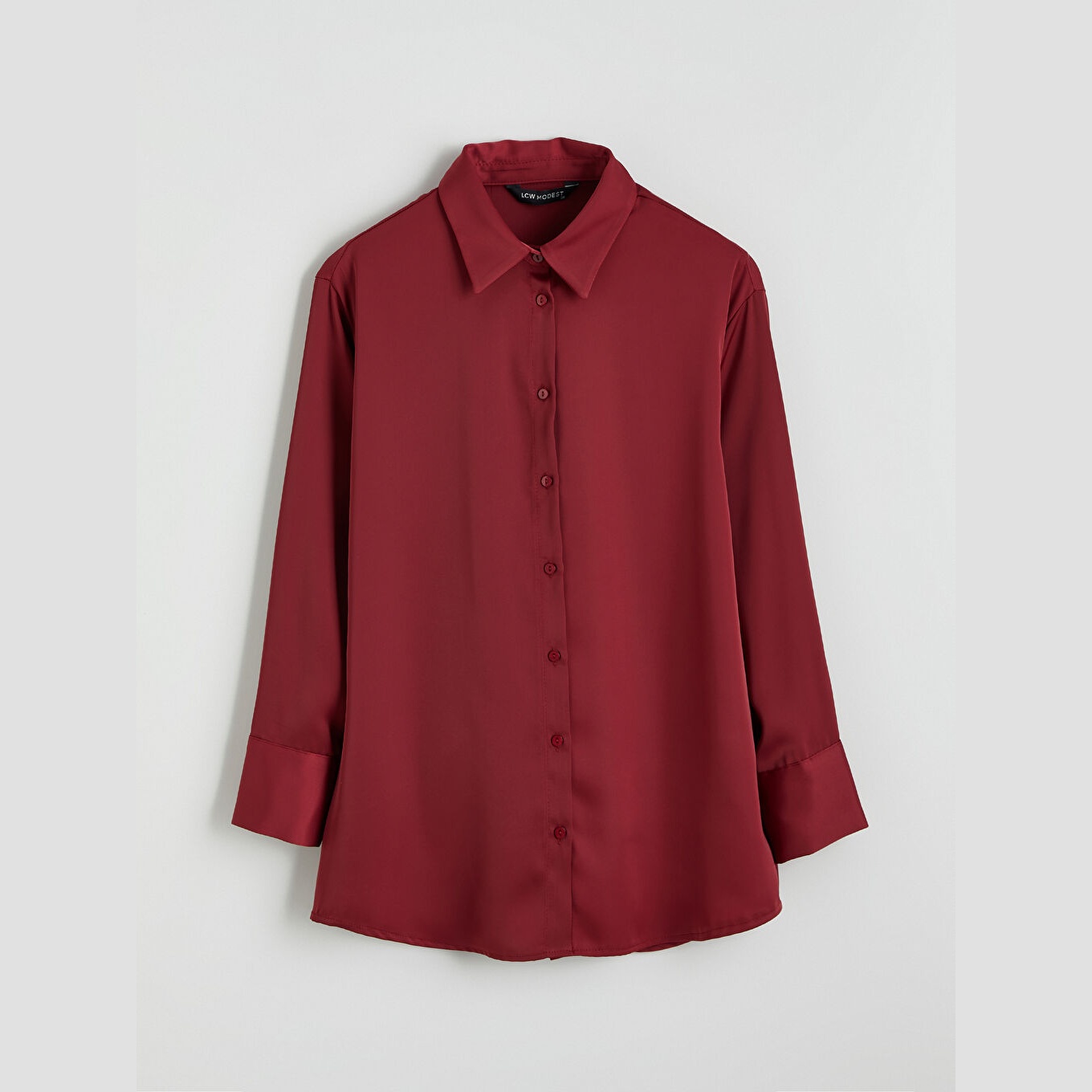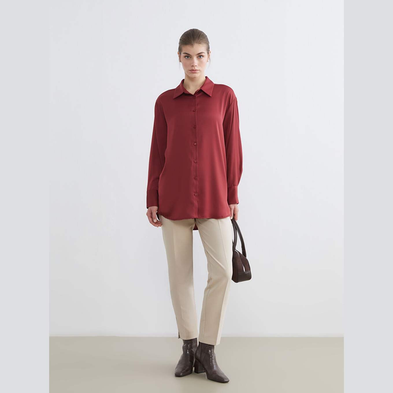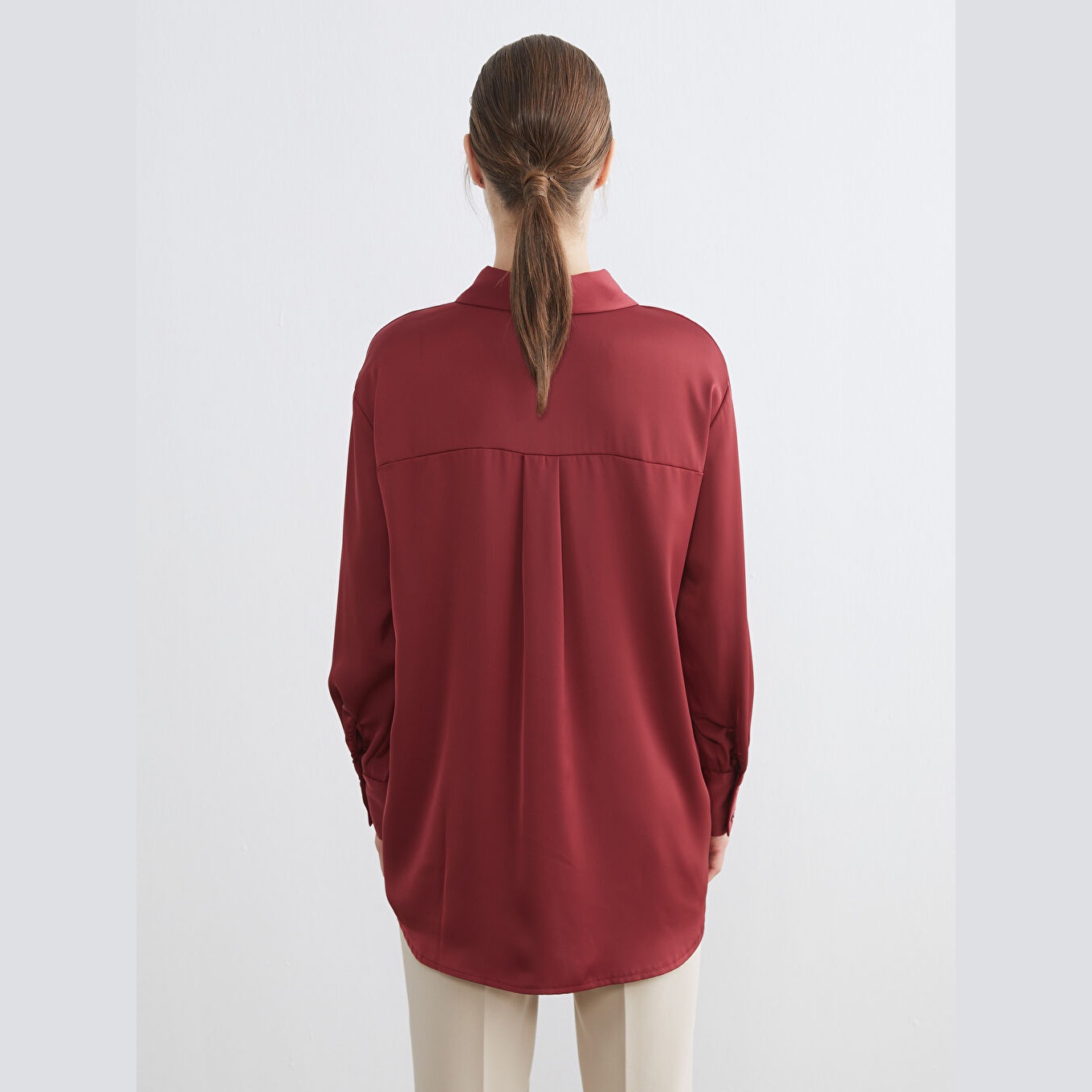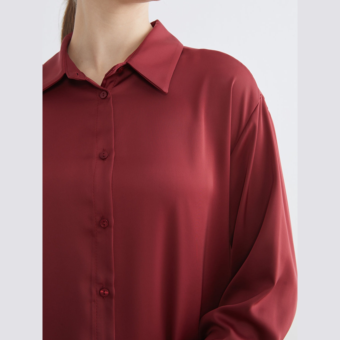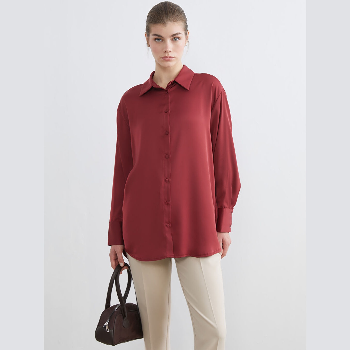 تونيك قميص نسائي ساتان – بوردو (ياقة قميص، خامة ساتان، قصة فضفاضة، تصميم عملي بأزرار، بطول الورك)