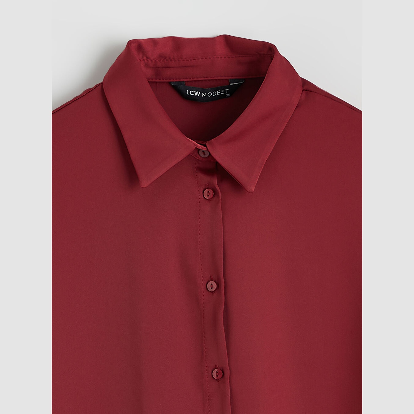تونيك أنيق بلون بوردو سادة من مجموعة LCW Modest – المقاسات الكبيرة، يتميز بياقة قميص تقليدية تضيف لمسة رسمية ناعمة، وقصة فضفاضة (Loose Fit) تمنحك مظهرًا مريحًا وانسيابيًا. مصنوع من خامة ساتان بوليستر ناعمة ولامعة بتركيبة %100 بوليستر، بأكمام طويلة، بسماكة خفيفة، بطول يصل إلى الورك، ويُغلق بأزرار أمامية، مثالي للتنسيق مع البنطال القماشي أو الجينز في الإطلالات اليومية أو العملية.