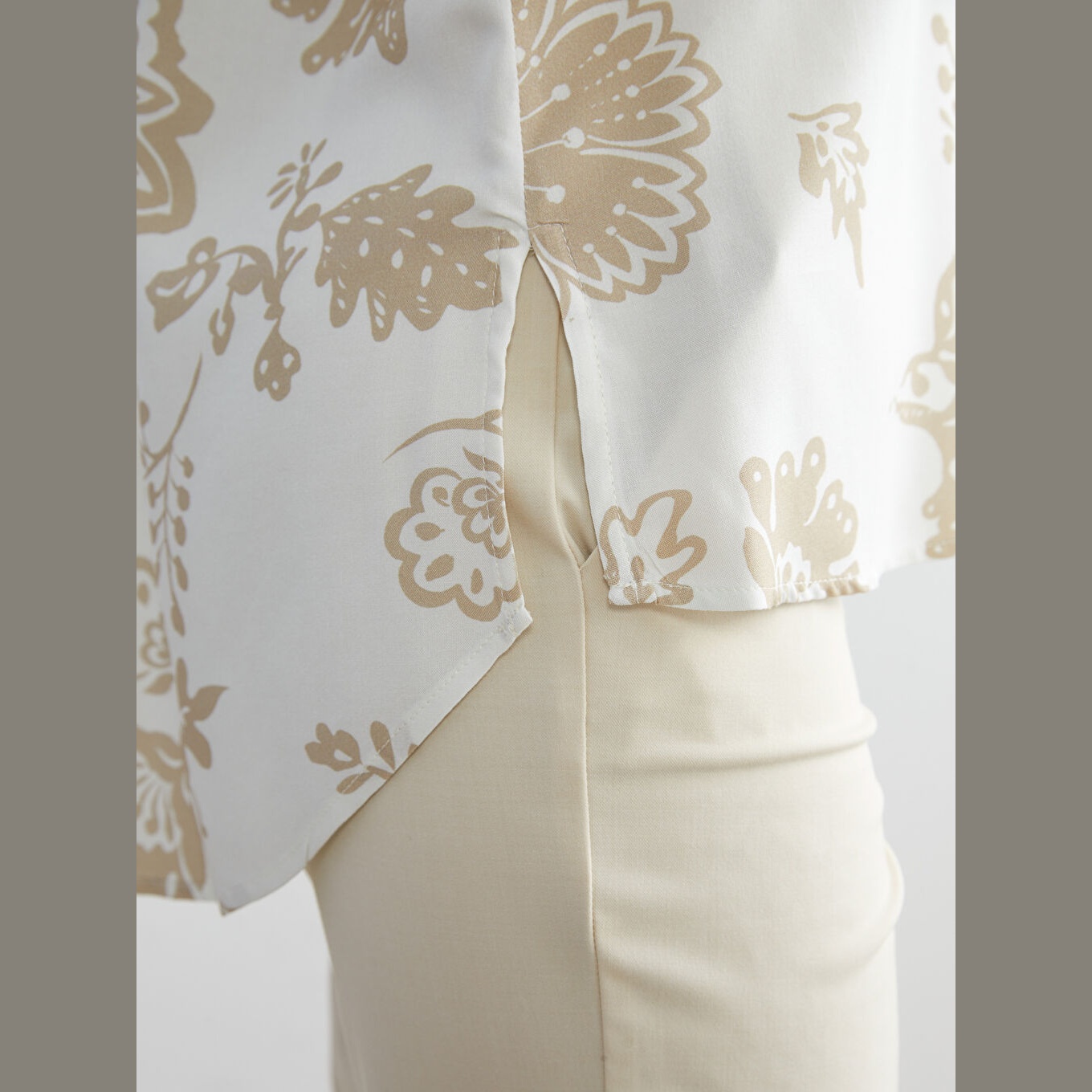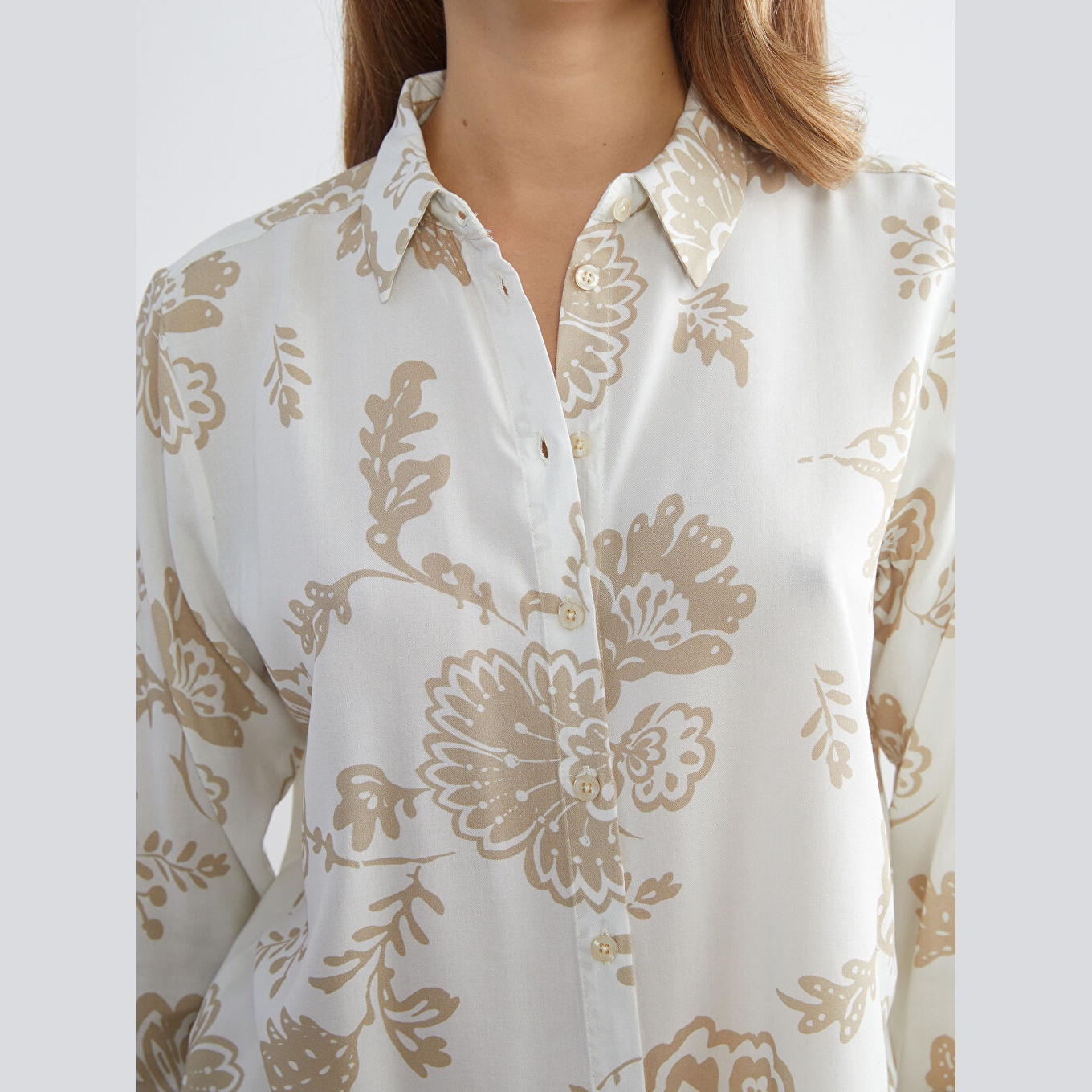 قميص نسائي واسع مزخرف – بيج (ياقة قميص، خامة فيسكوز، قصة فضفاضة، تصميم عملي بأزرار، بطول الورك)