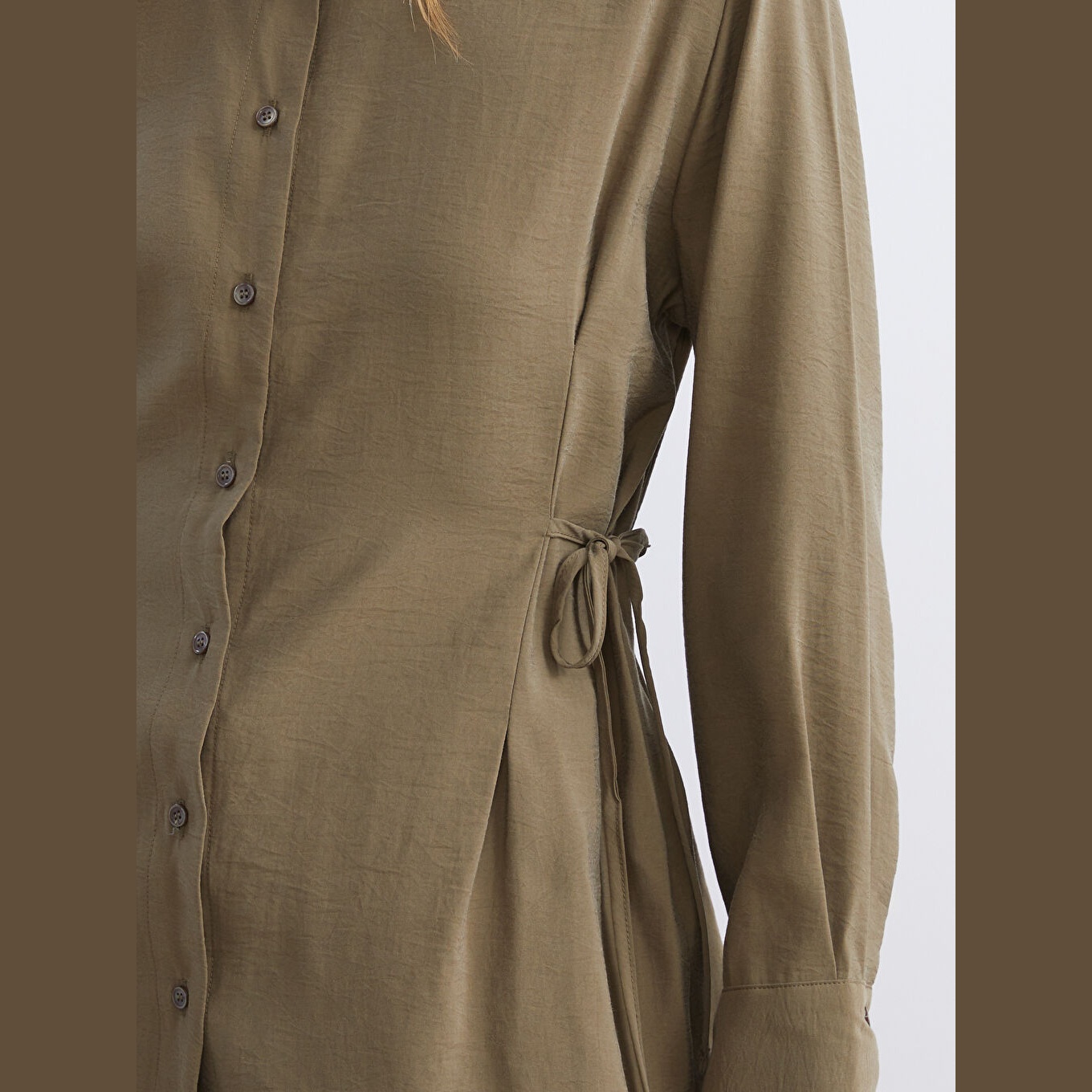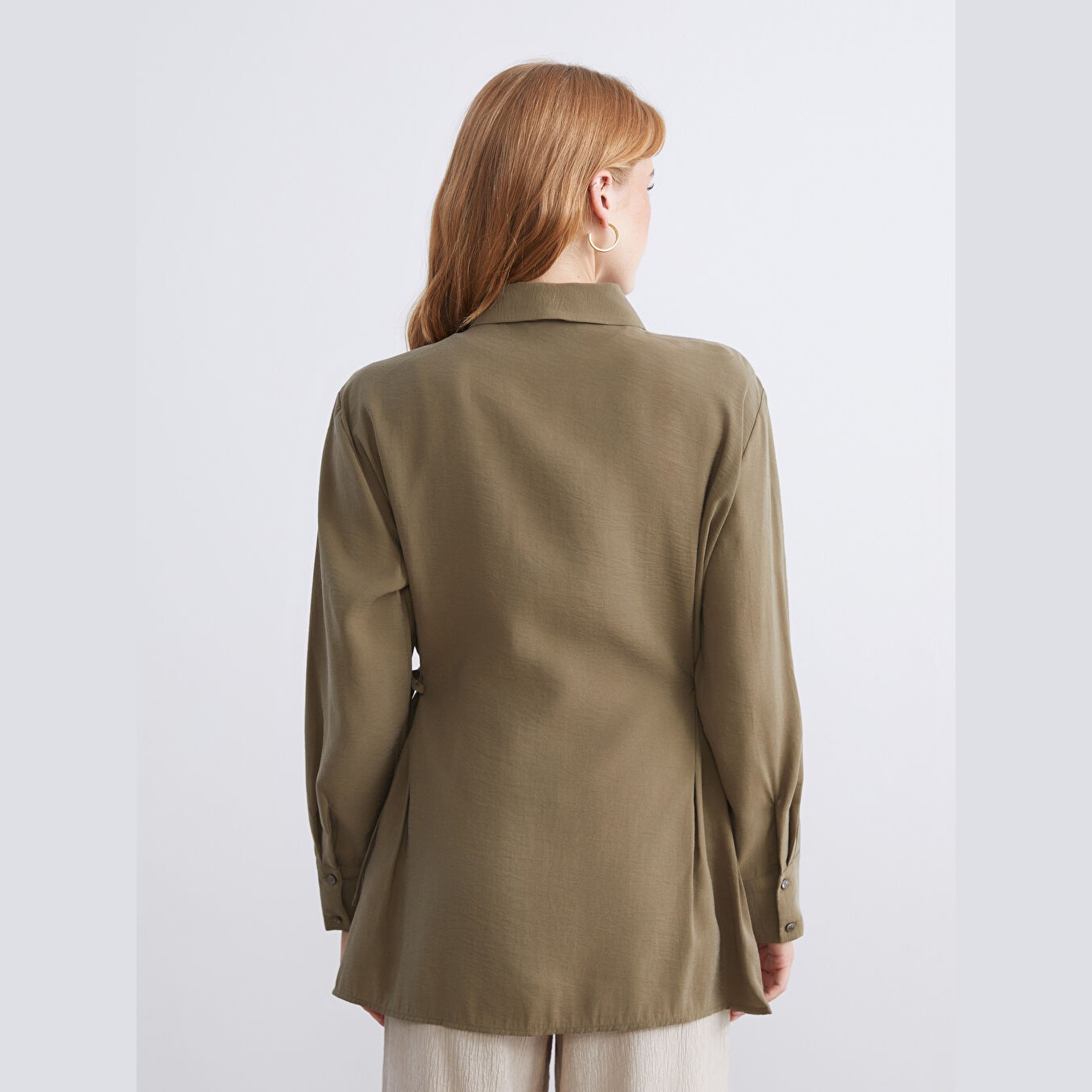 تونيك قميص نسائي واسع – أخضر سادة (ياقة قميص، خامة كرينكل، قصة فضفاضة، تصميم عملي بأزرار، بطول الورك)