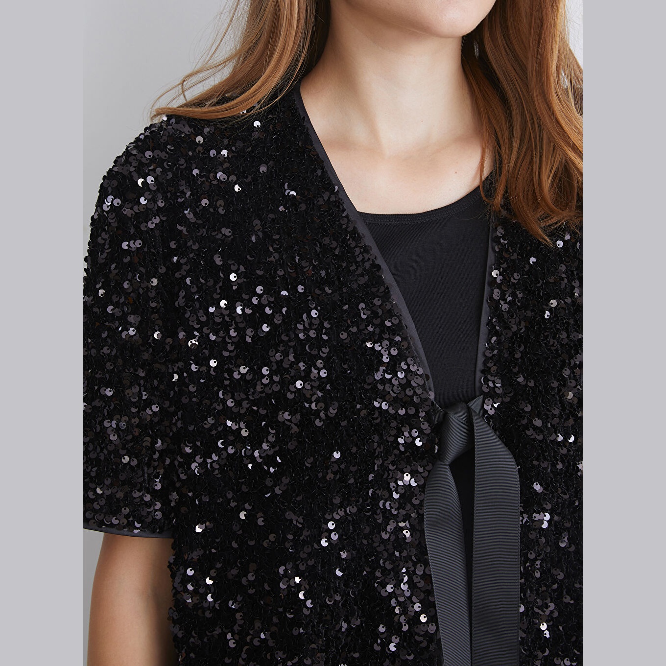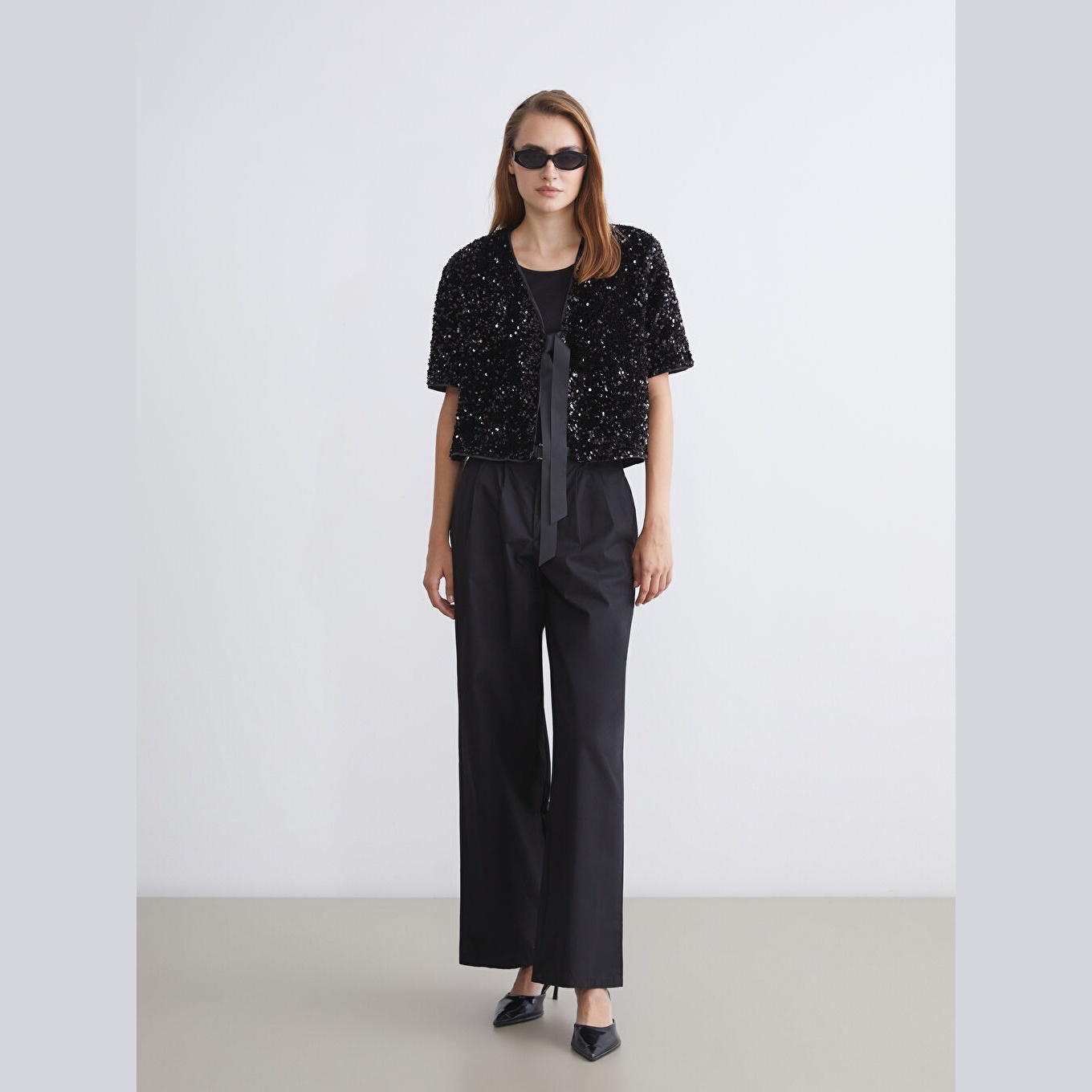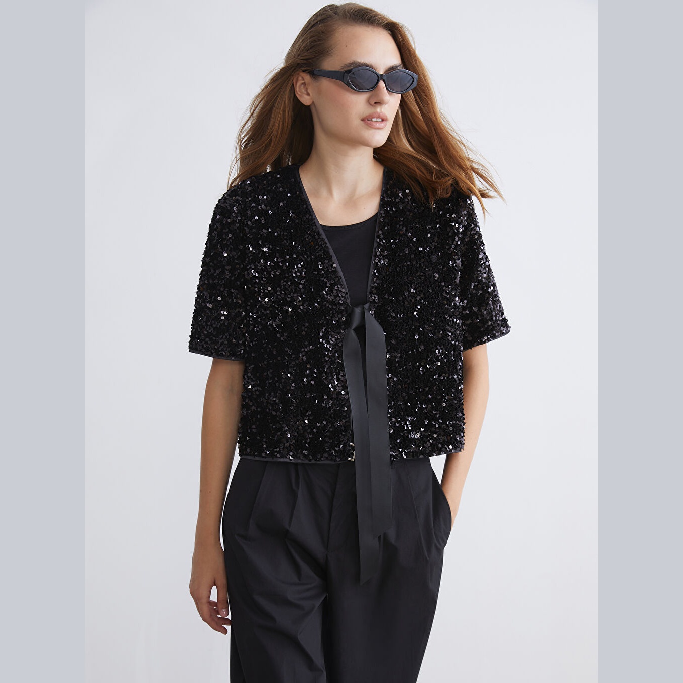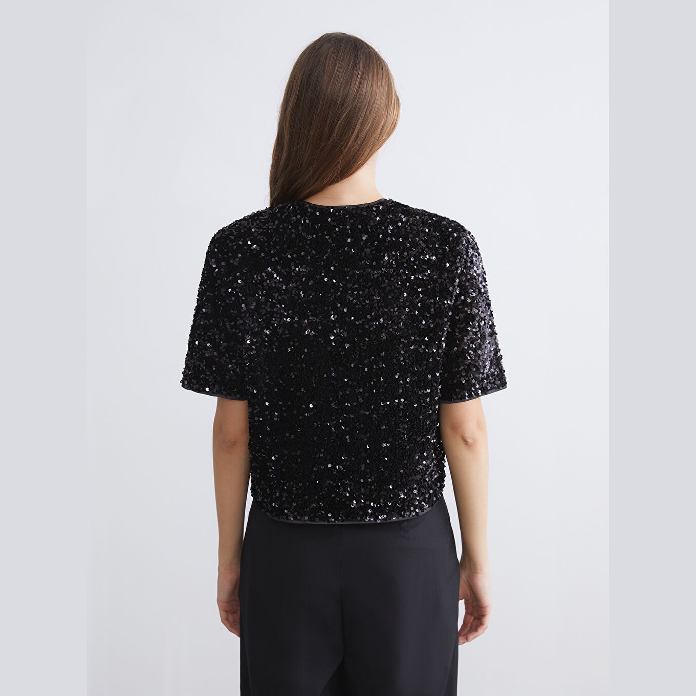 بلوز أنيق بلون أسود سادة مزين بترتر لامع من مجموعة LC Waikiki Şık – الأزياء الكلاسيكية، يتميز بياقة V أنثوية تضيف لمسة ناعمة وعصرية، وقصة كلاسيكية (Regular Fit) تمنحك مظهرًا متوازنًا ومناسبًا لمختلف الإطلالات. مصنوع من خامة ناعمة ومرنة بتركيبة %97 بوليستر، %3 إيلاستان مع بطانة بنفس التركيبة، بأكمام قصيرة، بسماكة خفيفة، بطول يصل إلى الورك، مثالي للتنسيق مع البنطال القماشي أو التنورة في الإطلالات المسائية أو الرسمية.