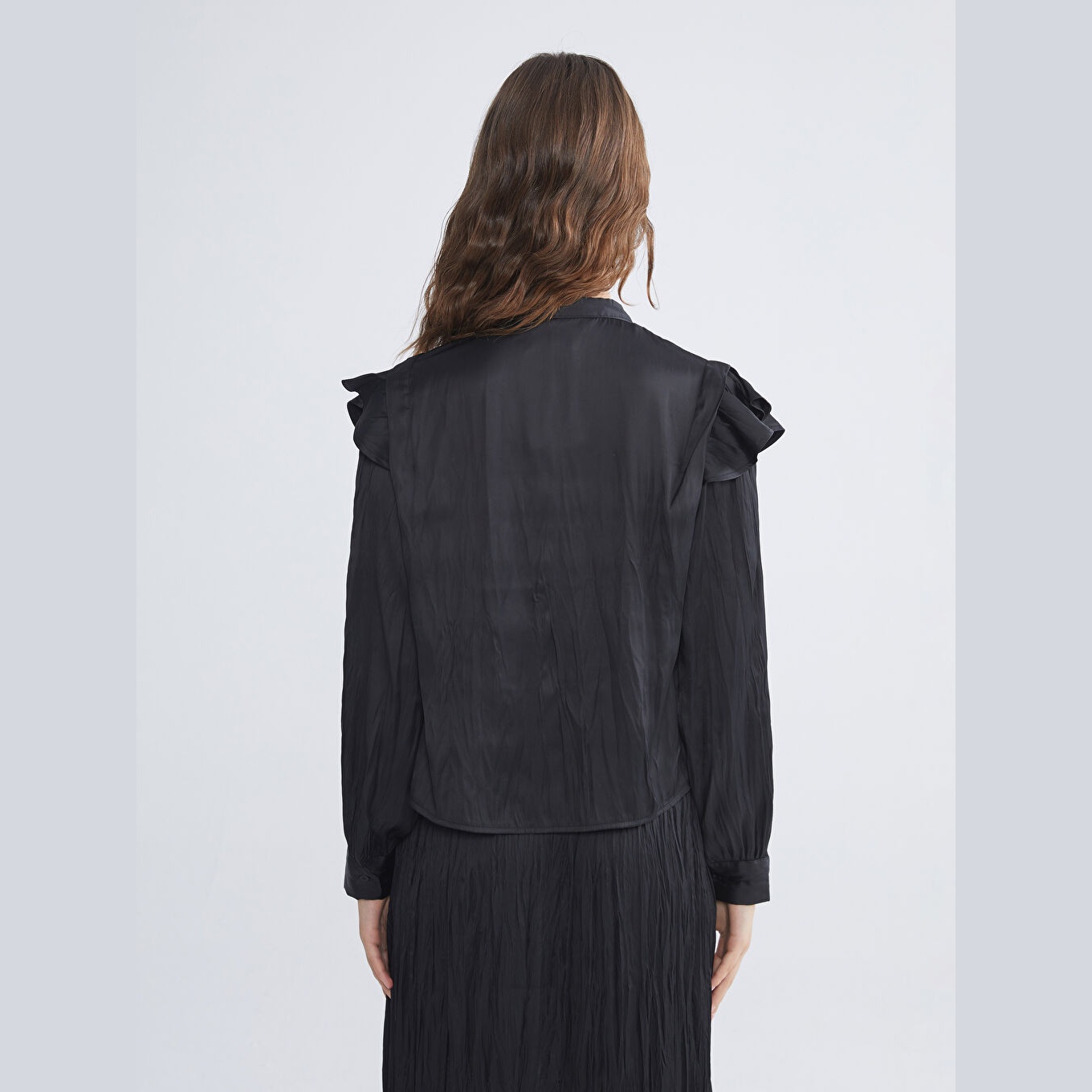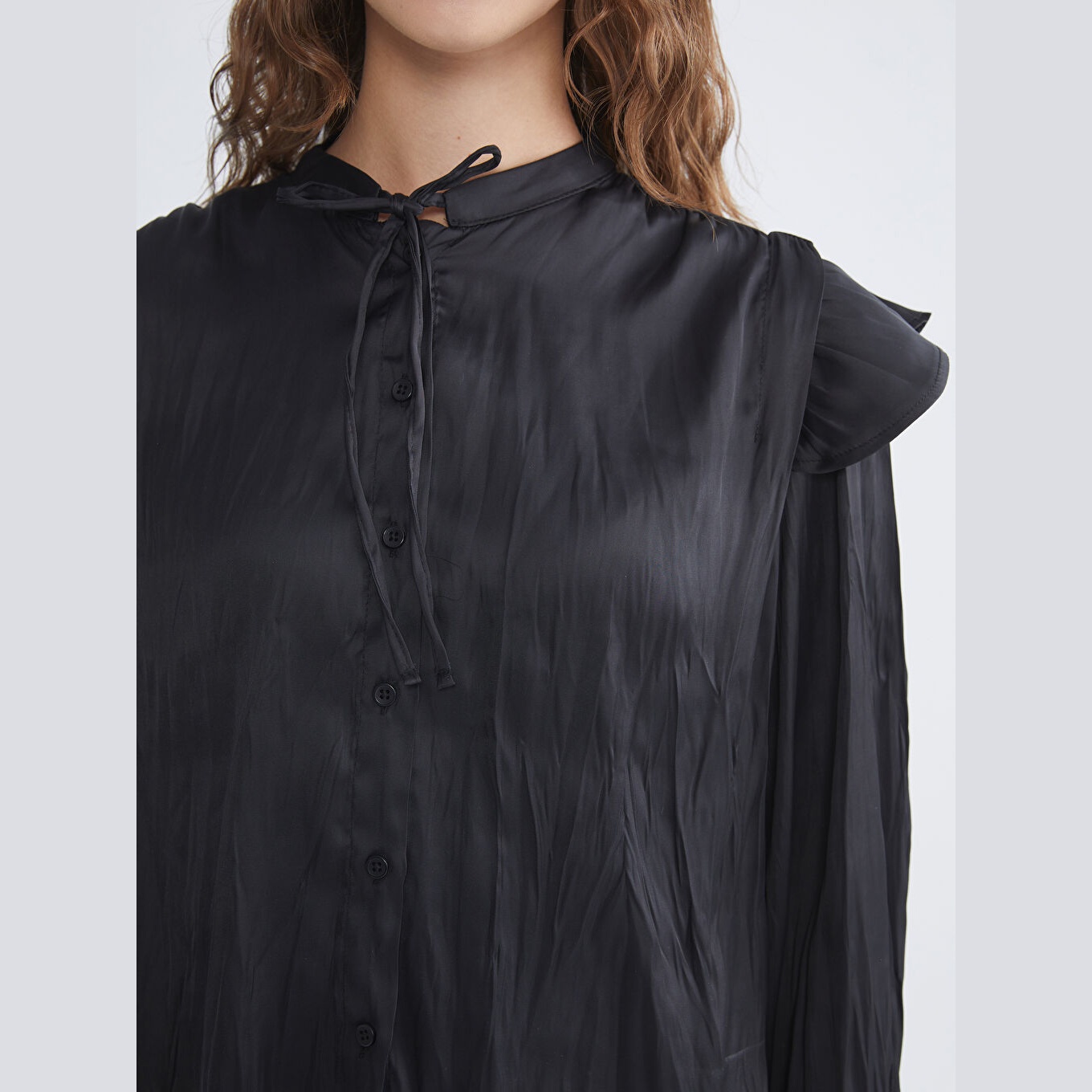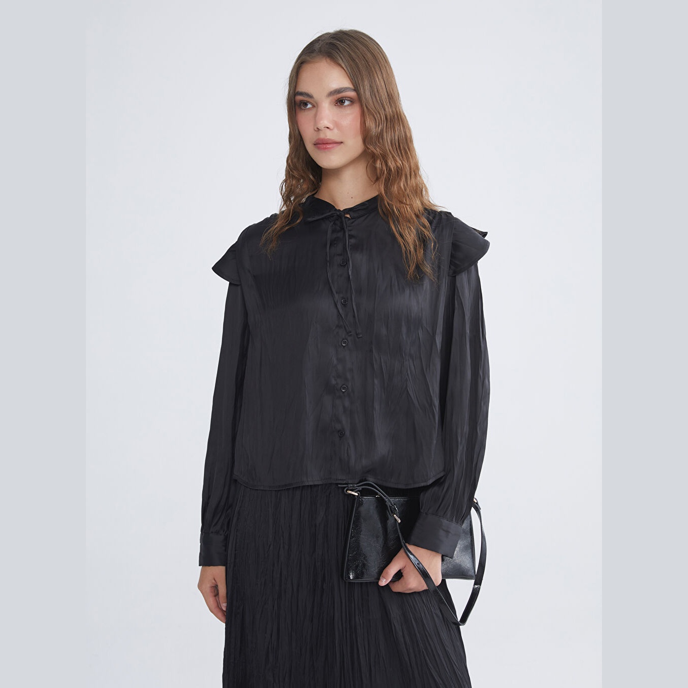 بلوز نسائي ساتان بياقة مربوطة – أسود سادة مع كشكش أنيق (ياقة مربوطة، خامة ساتان، قصة فضفاضة، تصميم عملي بأزرار، بطول الورك)