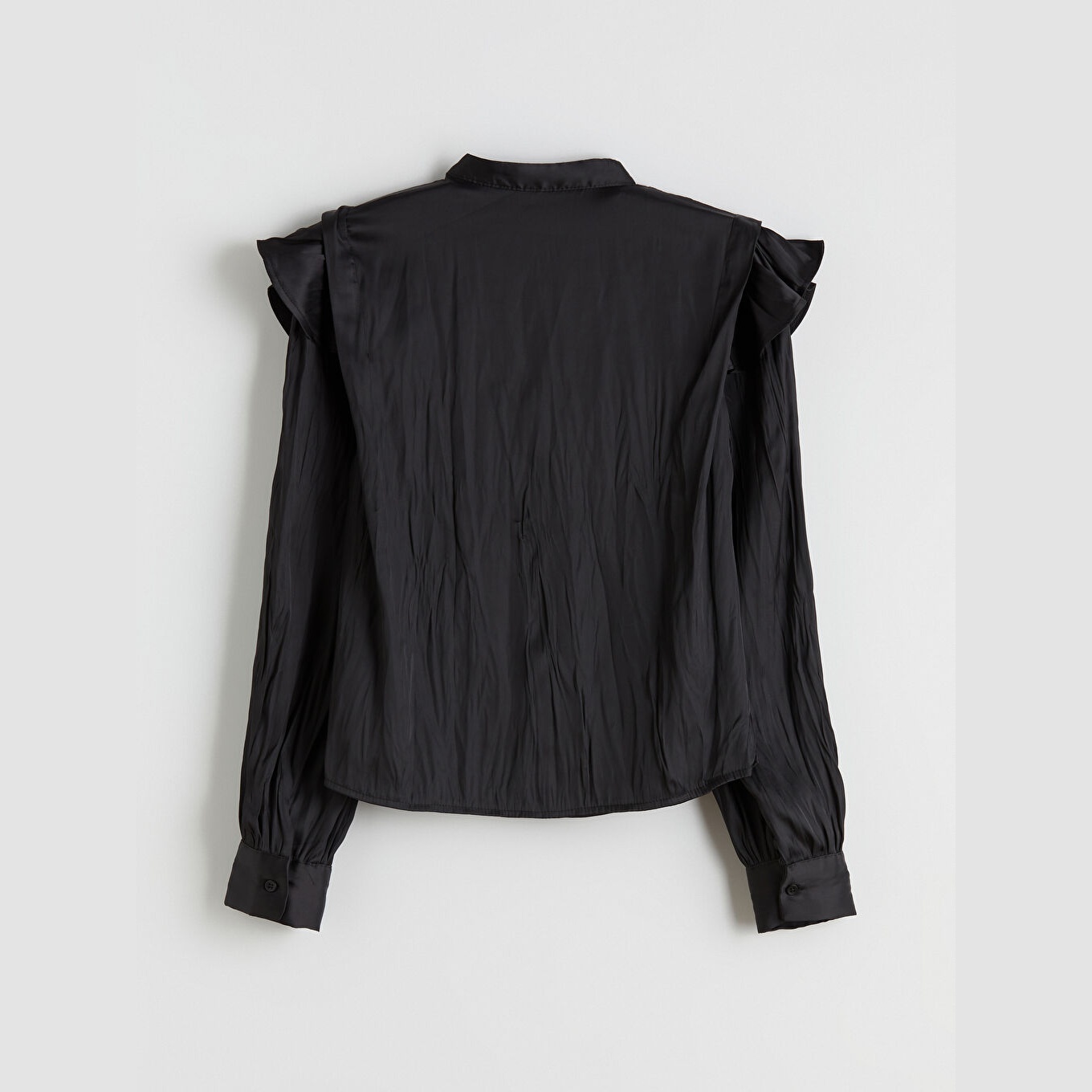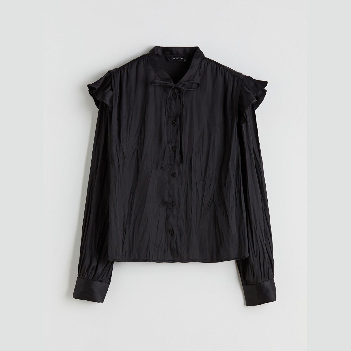 بلوز أنيق بلون أسود سادة من مجموعة LCW Modest – الأزياء المحتشمة، يتميز بياقة مربوطة أنثوية تضيف لمسة ناعمة، وكشكش أمامي يمنح التصميم حيوية وانسيابية. القصة فضفاضة (Loose Fit) تمنحك مظهرًا مريحًا وعصريًا. مصنوع من خامة ساتان خفيفة وناعمة بتركيبة %100 بوليستر، بأكمام طويلة، بسماكة خفيفة، بطول يصل إلى الورك، ويُغلق بأزرار أمامية، مثالي للتنسيق مع البنطال القماشي أو الجينز في الإطلالات اليومية أو العملية.