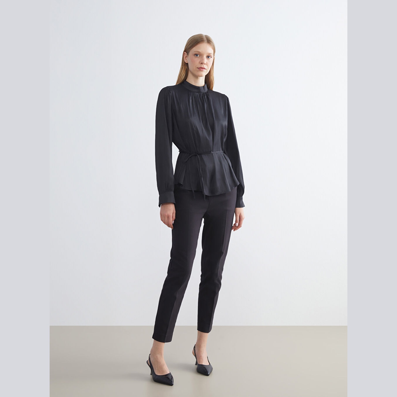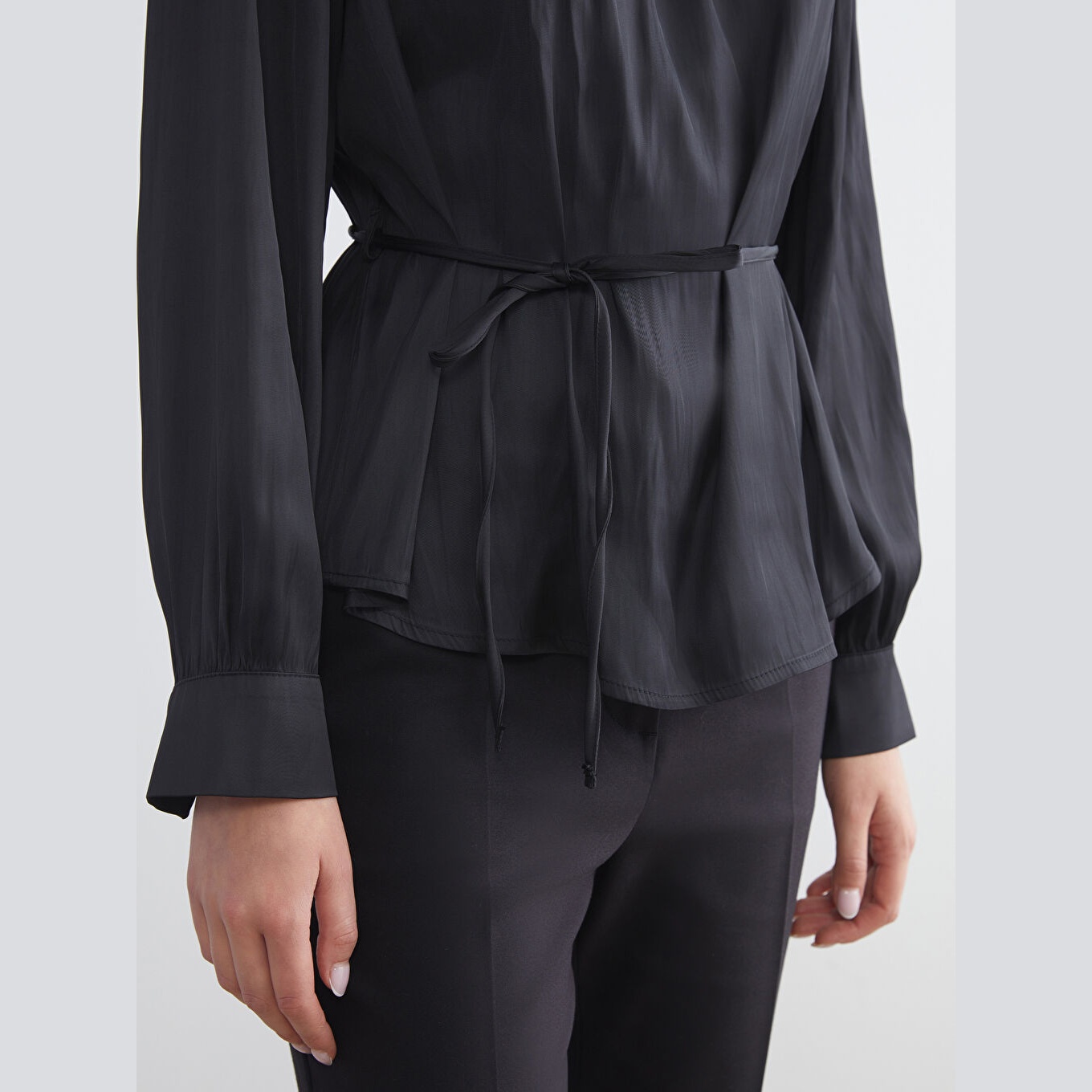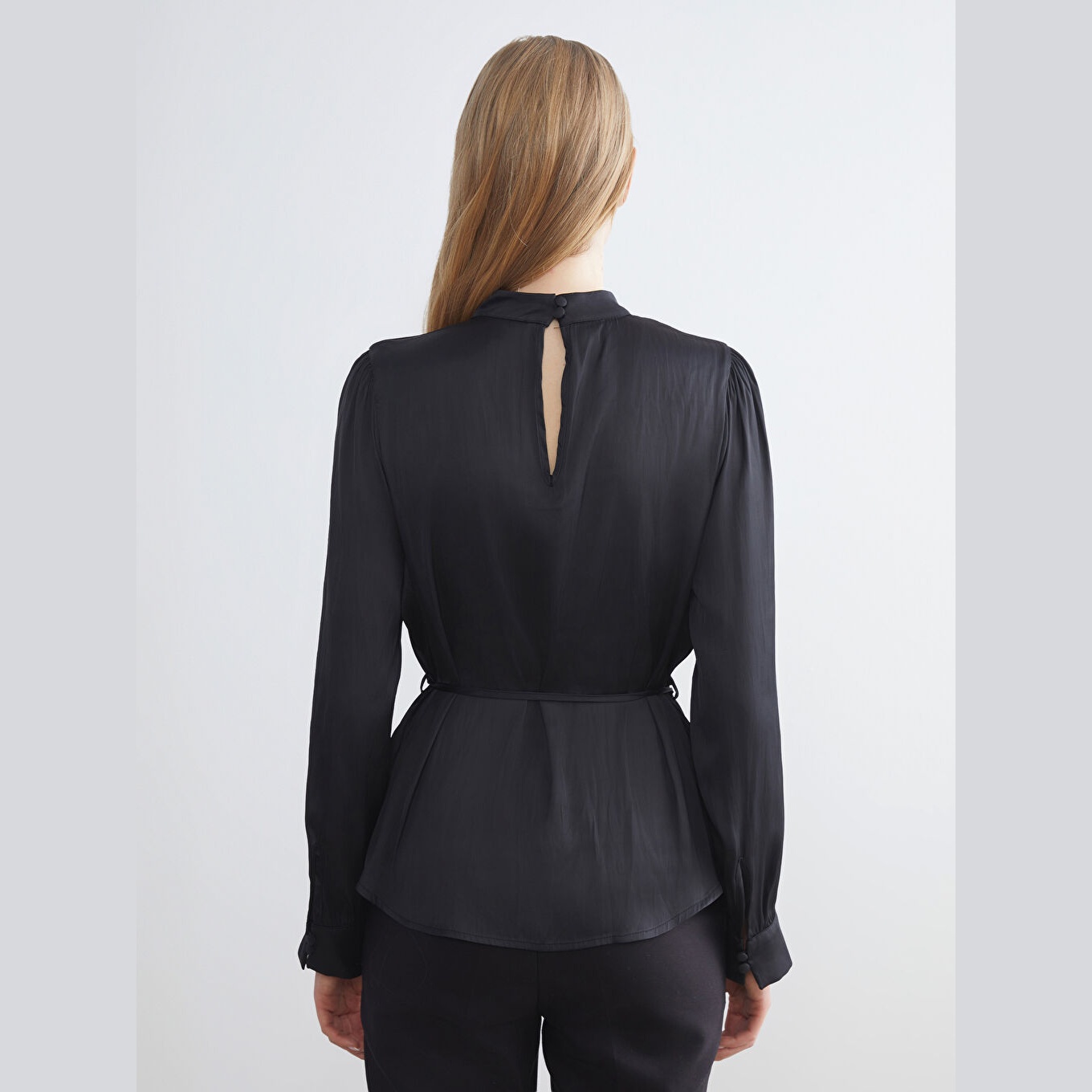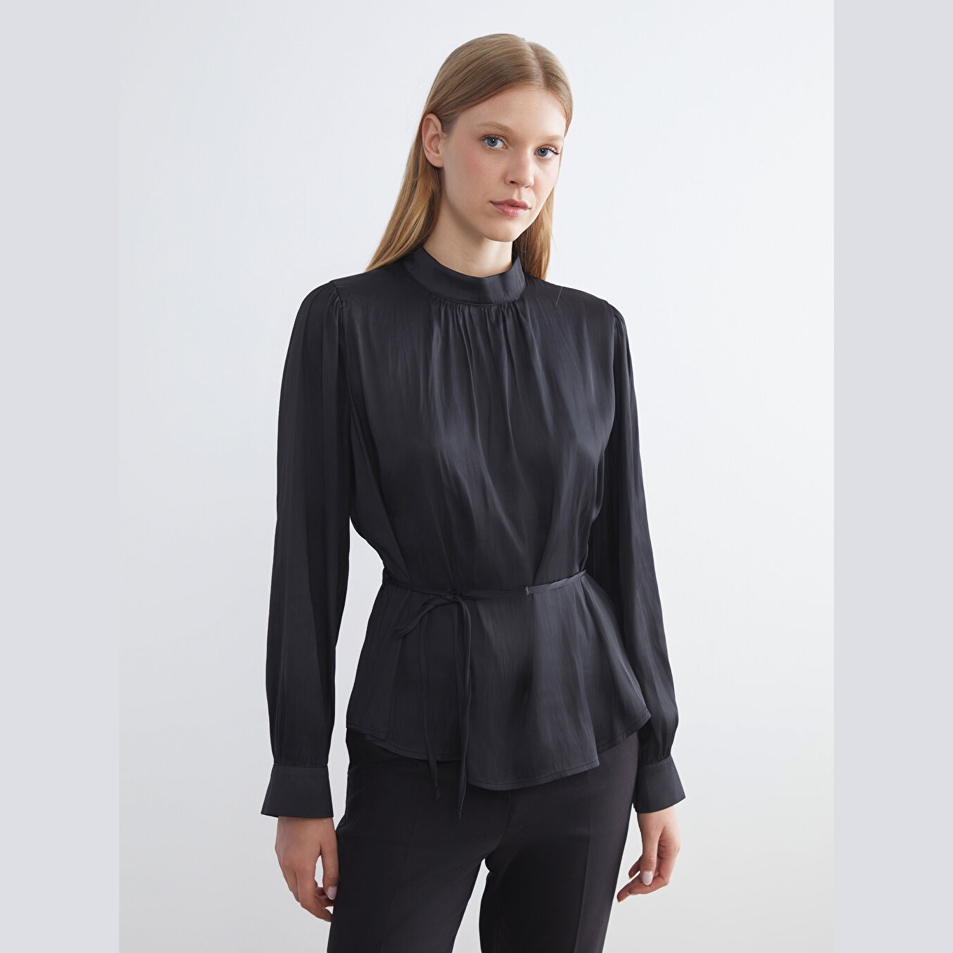 بلوز ساتان نسائي بياقة عالية – أسود سادة مع حزام (ياقة مرتفعة، خامة ساتان، قصة فضفاضة، تصميم عملي بحزام، بطول الورك)