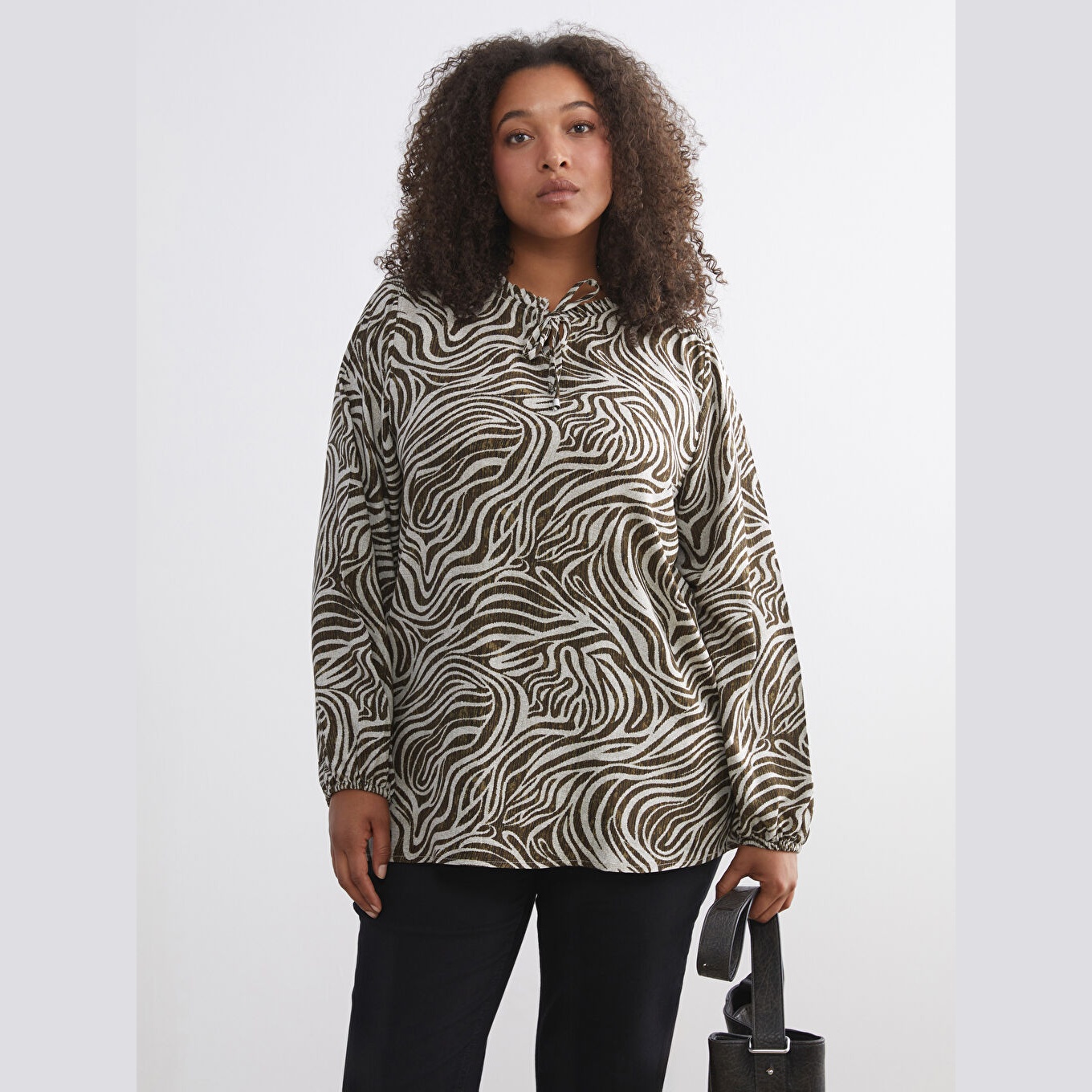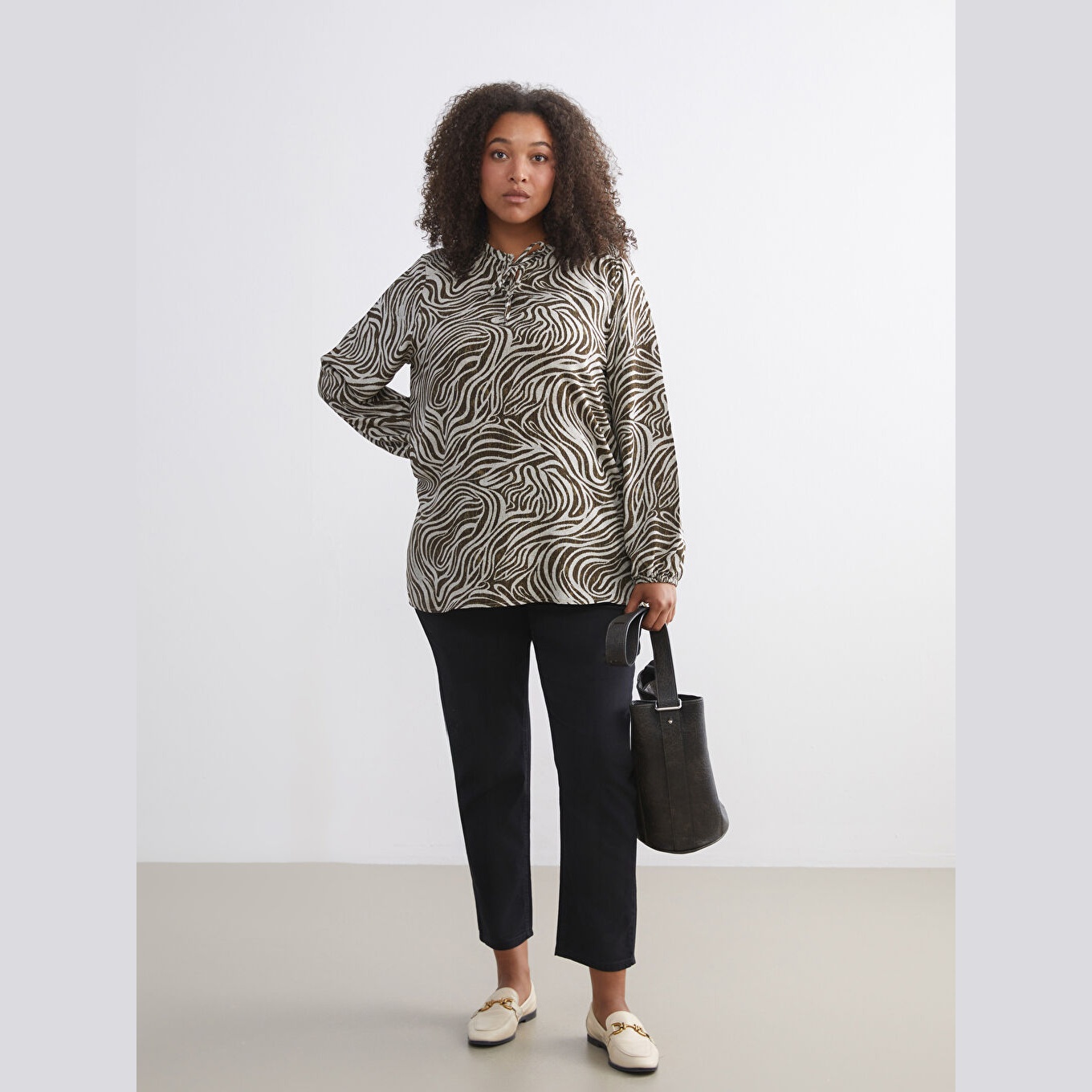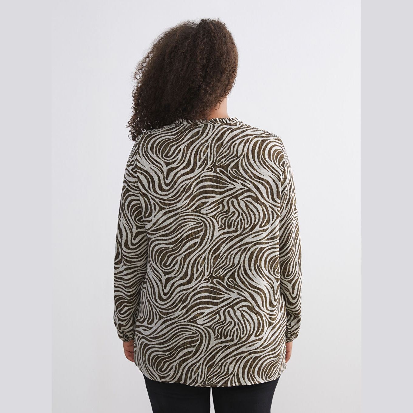 بلوز أنيق بنقشة ملونة جذابة من مجموعة LCW Büyük Beden – الأزياء العملية للمقاسات الكبيرة، يتميز بياقة مربوطة أنثوية تضيف لمسة ناعمة، وقصة قياسية (Regular Fit) تمنحك مظهرًا متوازنًا ومناسبًا لمختلف الإطلالات. مصنوع من خامة فيسكوز خفيفة ومريحة بتركيبة %100 فيسكوز، بأكمام طويلة، بسماكة خفيفة، بطول يصل إلى الورك، مثالي للتنسيق مع البنطال القماشي أو الجينز في الإطلالات اليومية أو العملية.