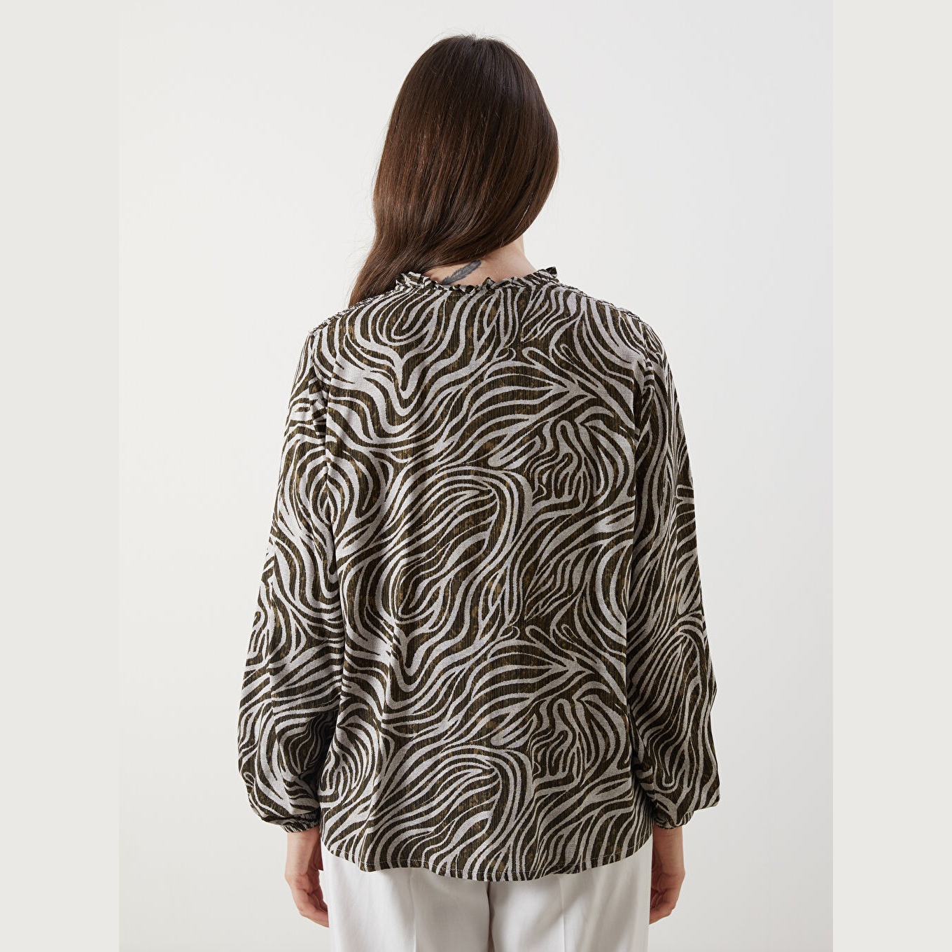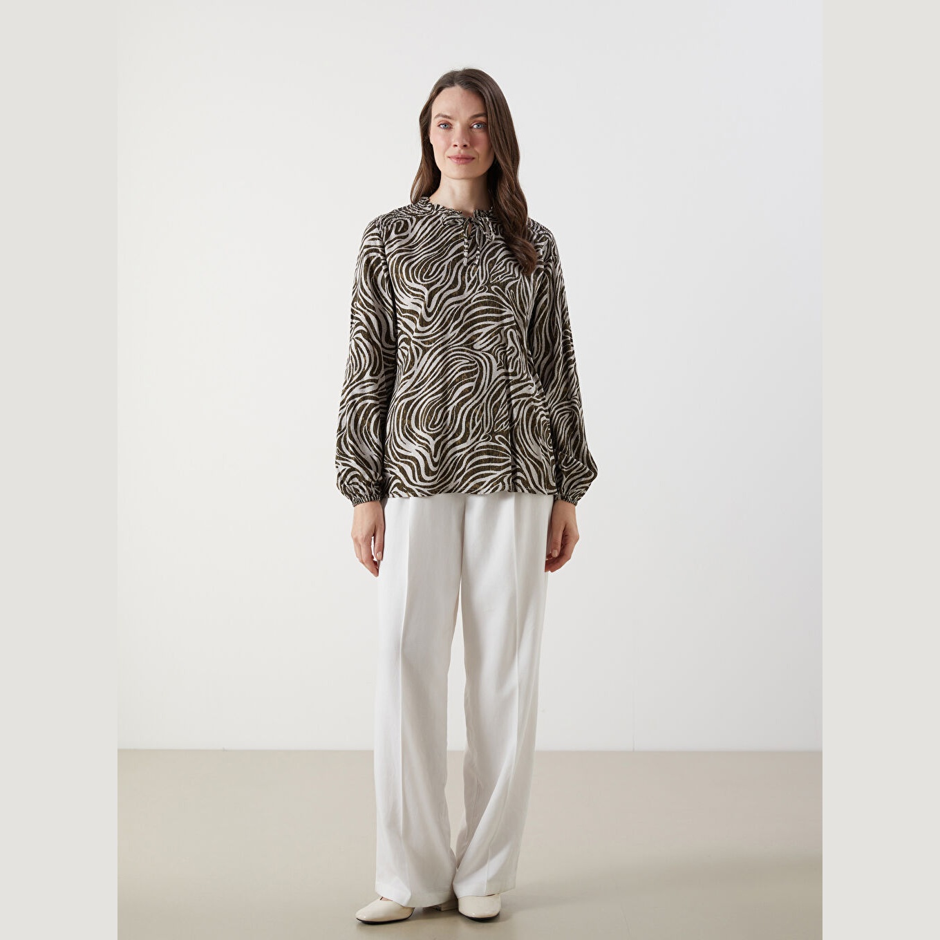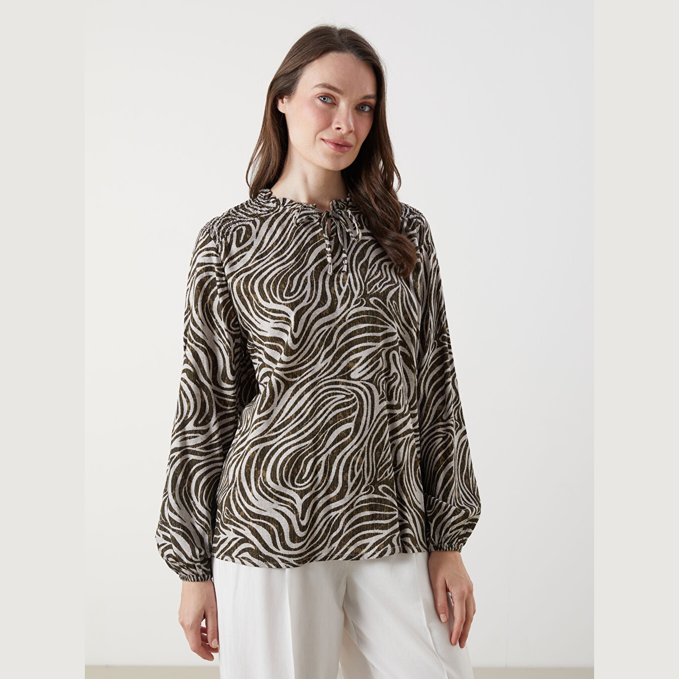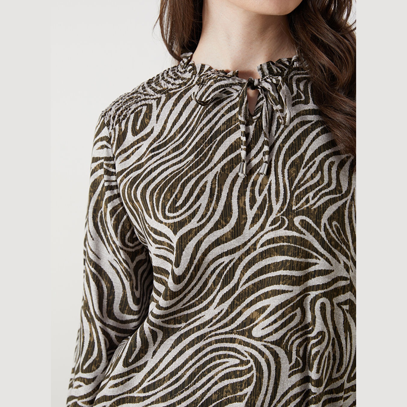 بلوز أنيق بنقشة ملونة جذابة من مجموعة LCW Büyük Beden – الأزياء العملية للمقاسات الكبيرة، يتميز بياقة مربوطة أنثوية تضيف لمسة ناعمة، وقصة قياسية (Regular Fit) تمنحك مظهرًا متوازنًا ومناسبًا لمختلف الإطلالات. مصنوع من خامة فيسكوز خفيفة ومريحة بتركيبة %100 فيسكوز، بأكمام طويلة، بسماكة خفيفة، بطول يصل إلى الورك، مثالي للتنسيق مع البنطال القماشي أو الجينز في الإطلالات اليومية أو العملية.