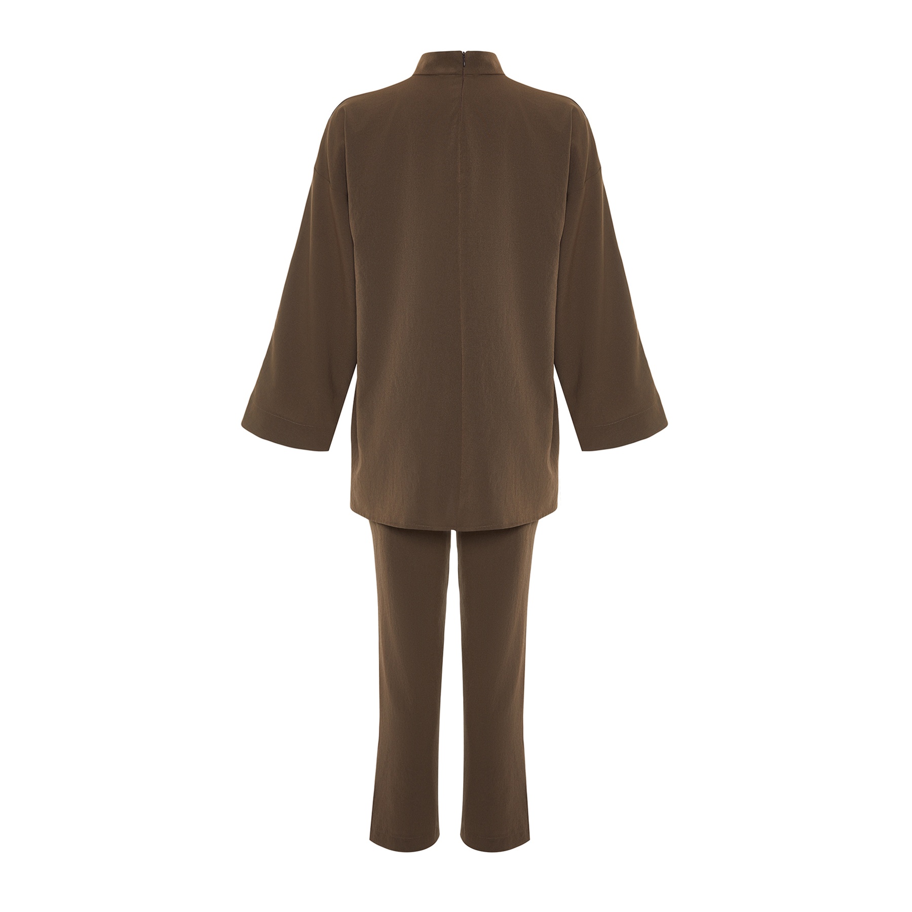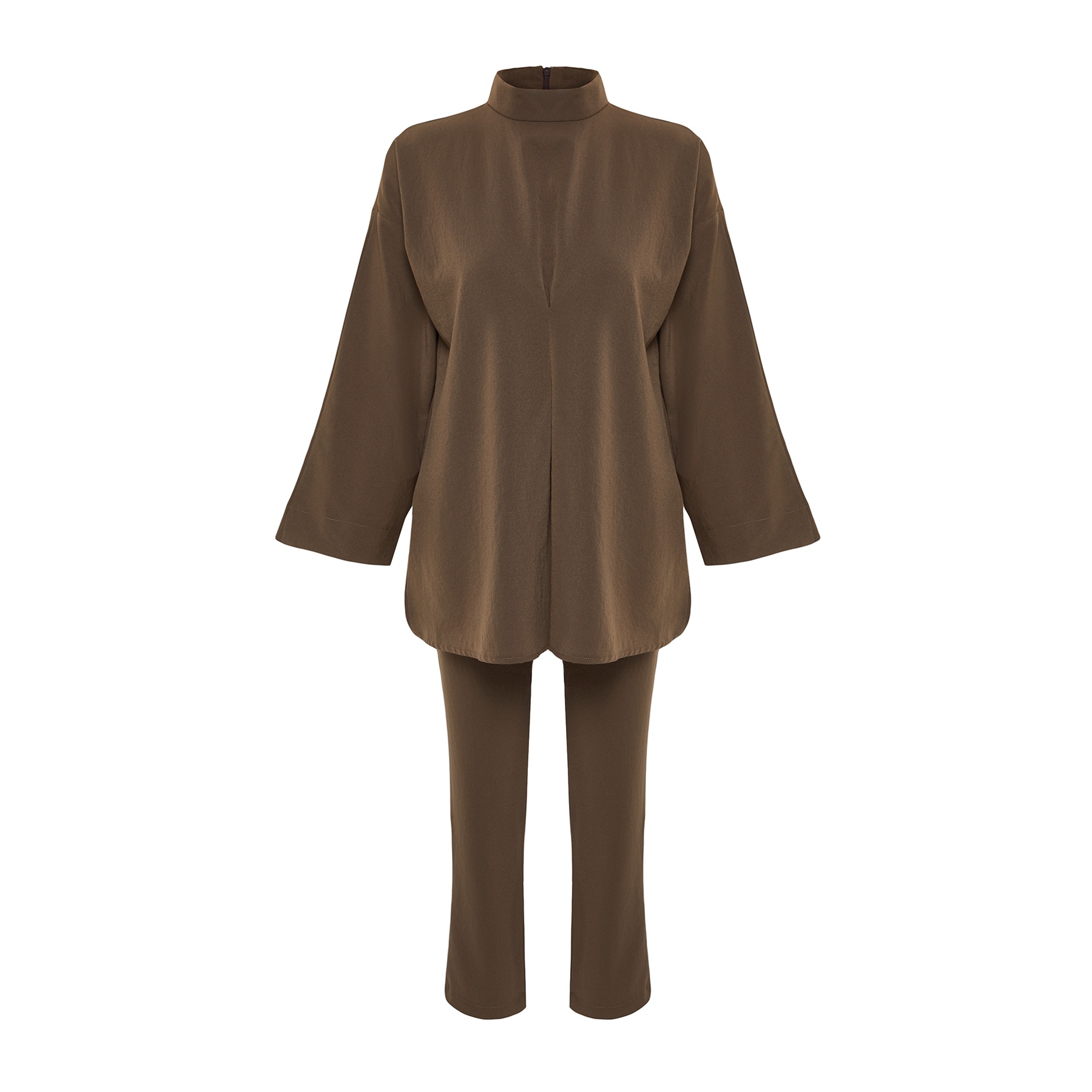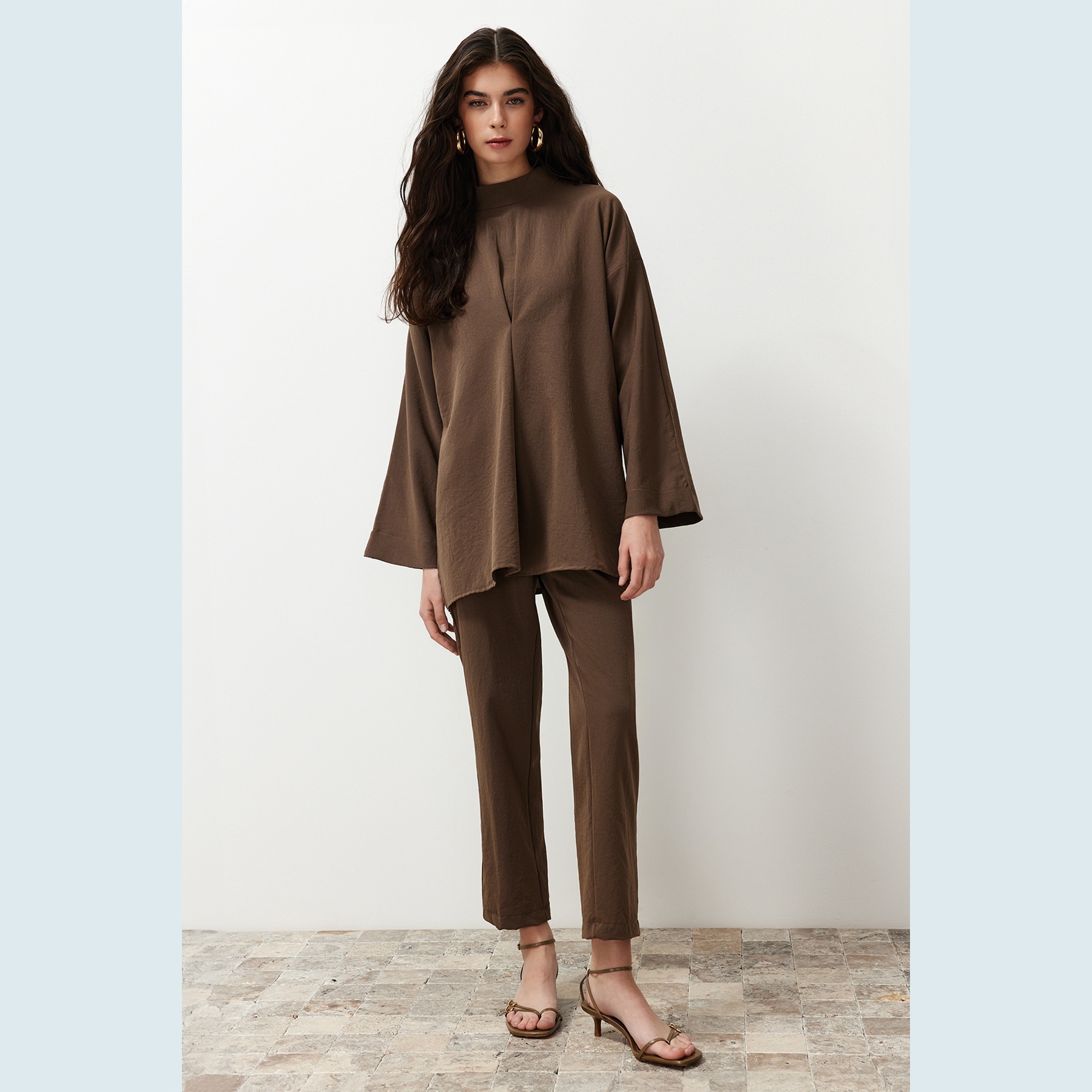 طقم أنيق بلون بني موحد من مجموعة Trendyolmilla Modest – لأناقة صيفية مريحة ومحتشمة بلمسة عملية، يتكون من كنزة بياقة V طويلة الأكمام مع بنطال مستقيم بخصر مرتفع، مصنوع من خامة دوكوم ناعمة من نوع Aerobin بتركيبة 100% بوليستر، ما يجعله مثاليًا للأجواء الحارة والإطلالات اليومية المحتشمة.