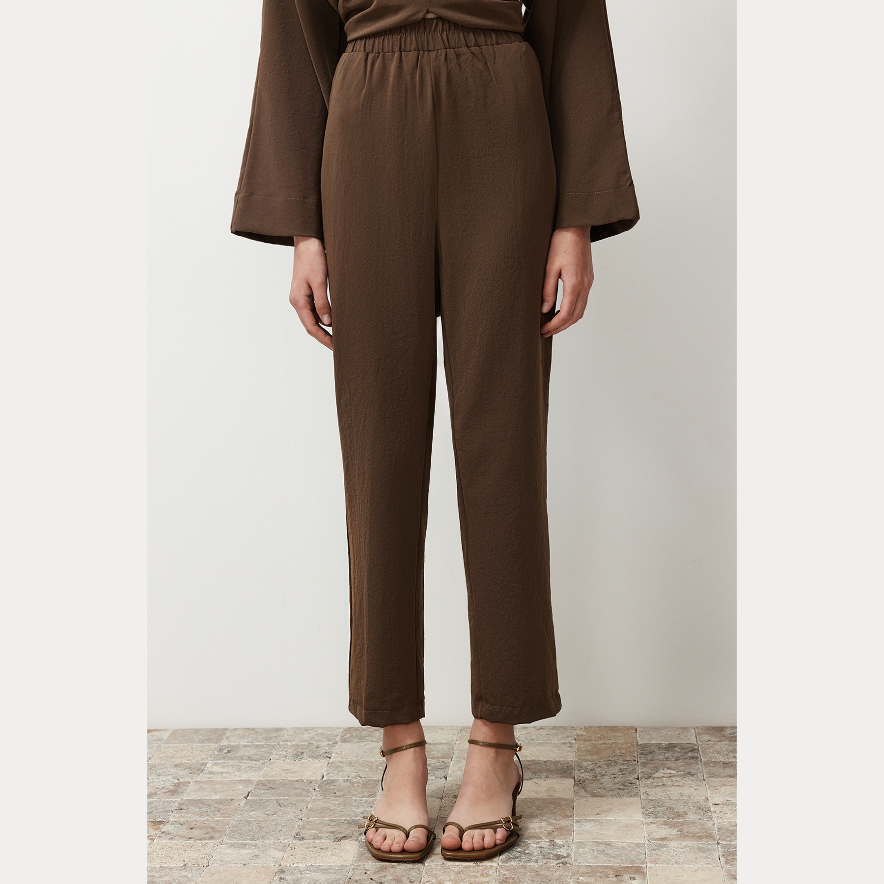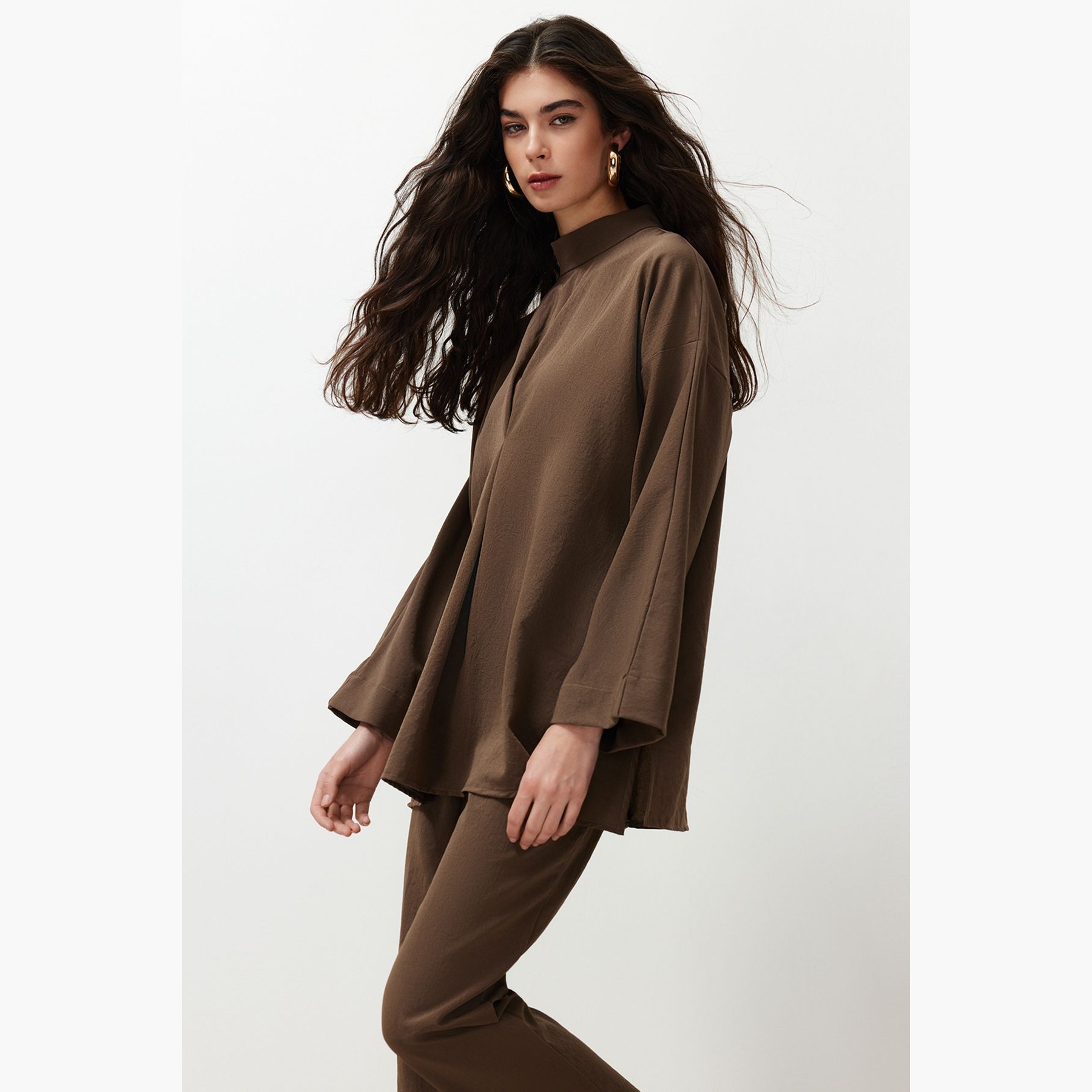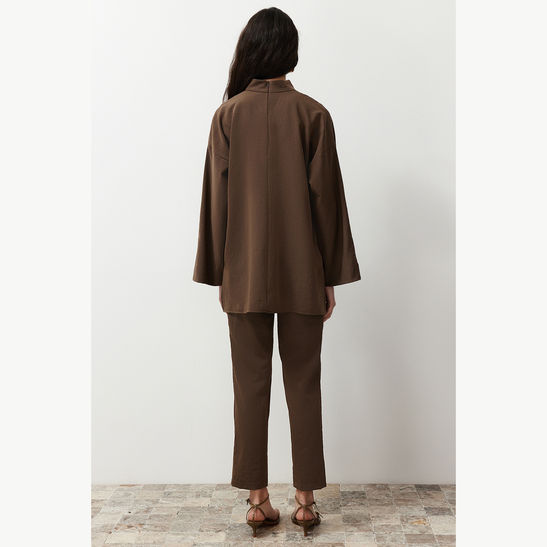 طقم أنيق بلون بني موحد من مجموعة Trendyolmilla Modest – لأناقة صيفية مريحة ومحتشمة بلمسة عملية، يتكون من كنزة بياقة V طويلة الأكمام مع بنطال مستقيم بخصر مرتفع، مصنوع من خامة دوكوم ناعمة من نوع Aerobin بتركيبة 100% بوليستر، ما يجعله مثاليًا للأجواء الحارة والإطلالات اليومية المحتشمة.