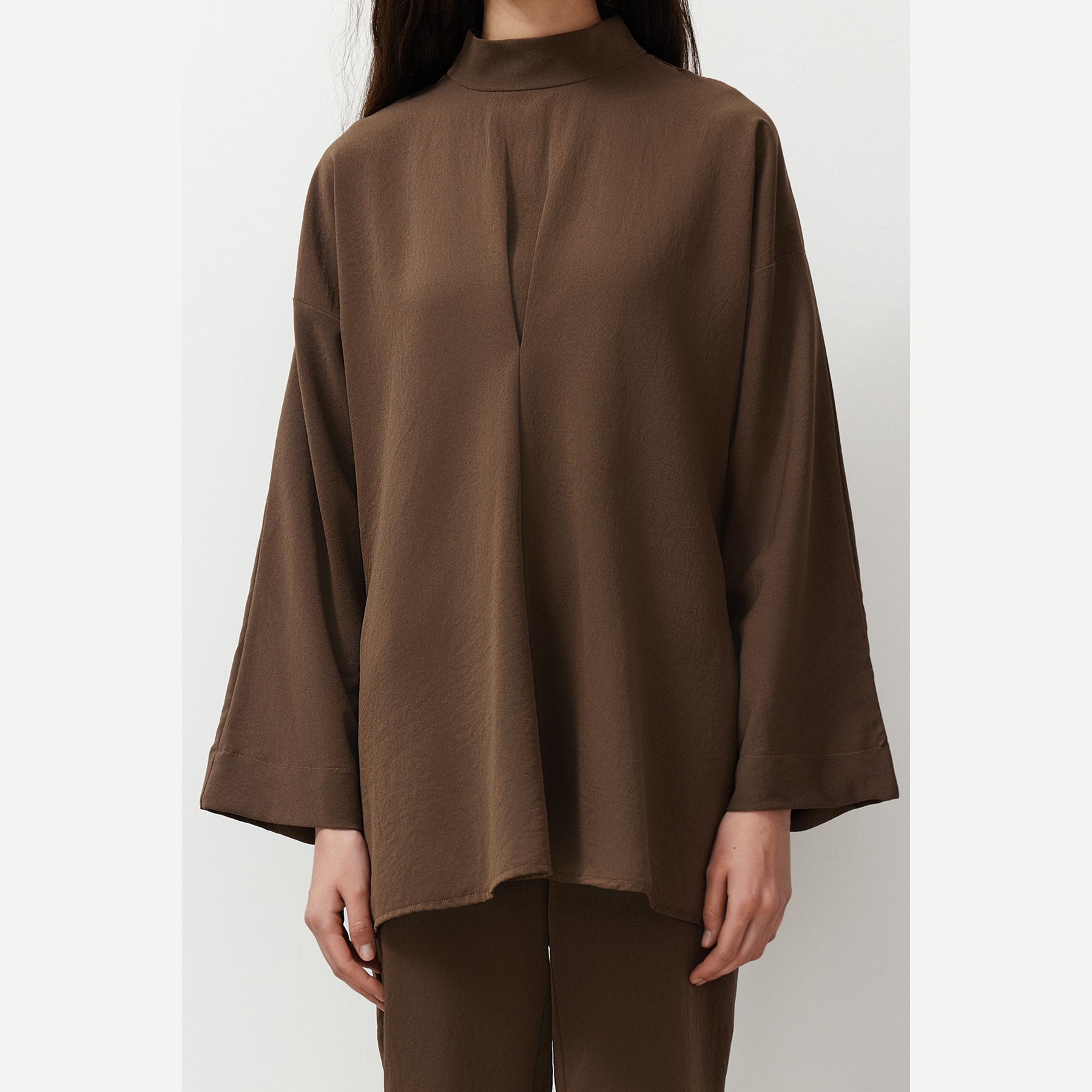 طقم نسائي مكون من كنزة وبنطال – بني بياقة V وقماش دوكوم ناعم (تصميم محتشم)