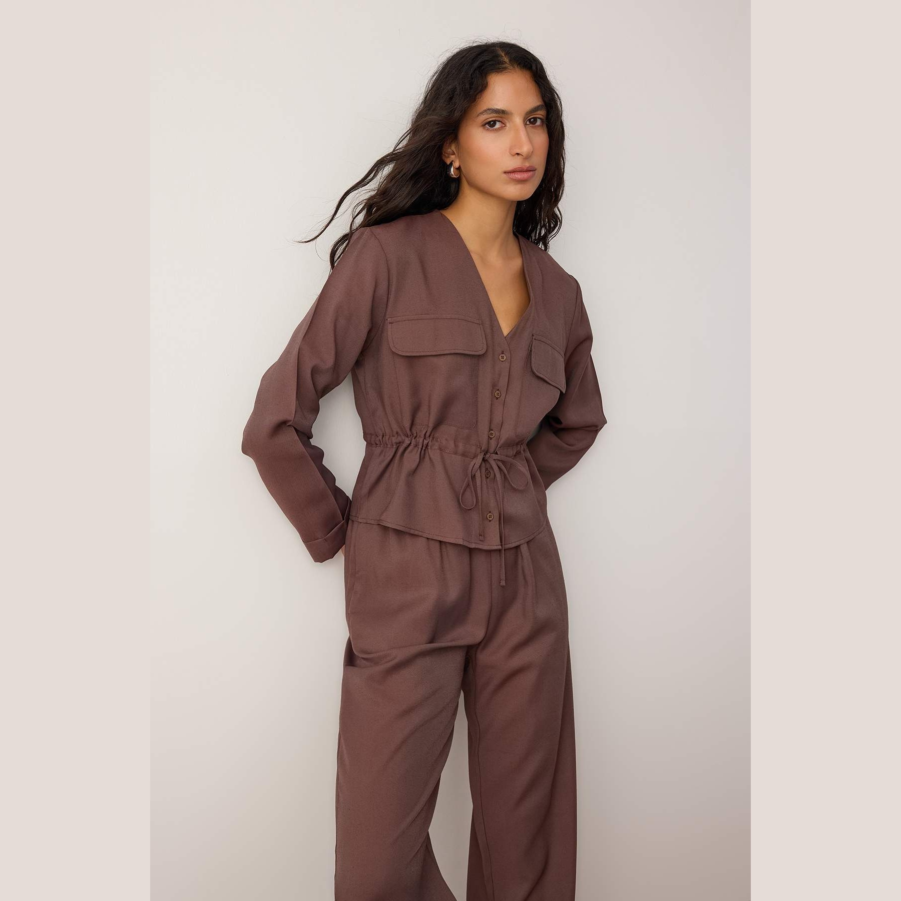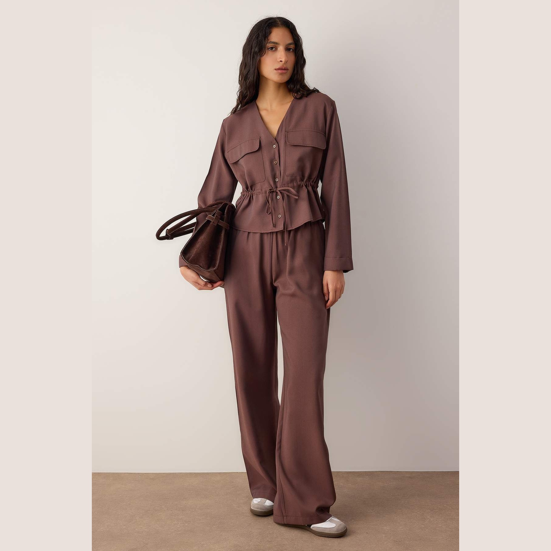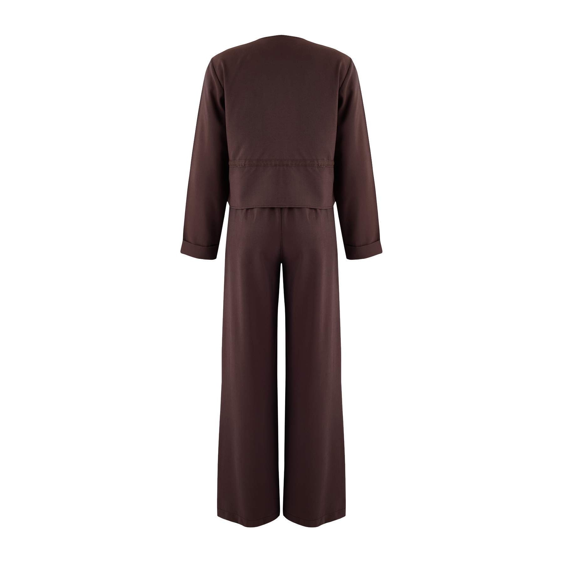 طقم نسائي مكون من بلوزة وبنطال – بني داكن بملمس ناعم (قماش دوكوم، تصميم عملي)