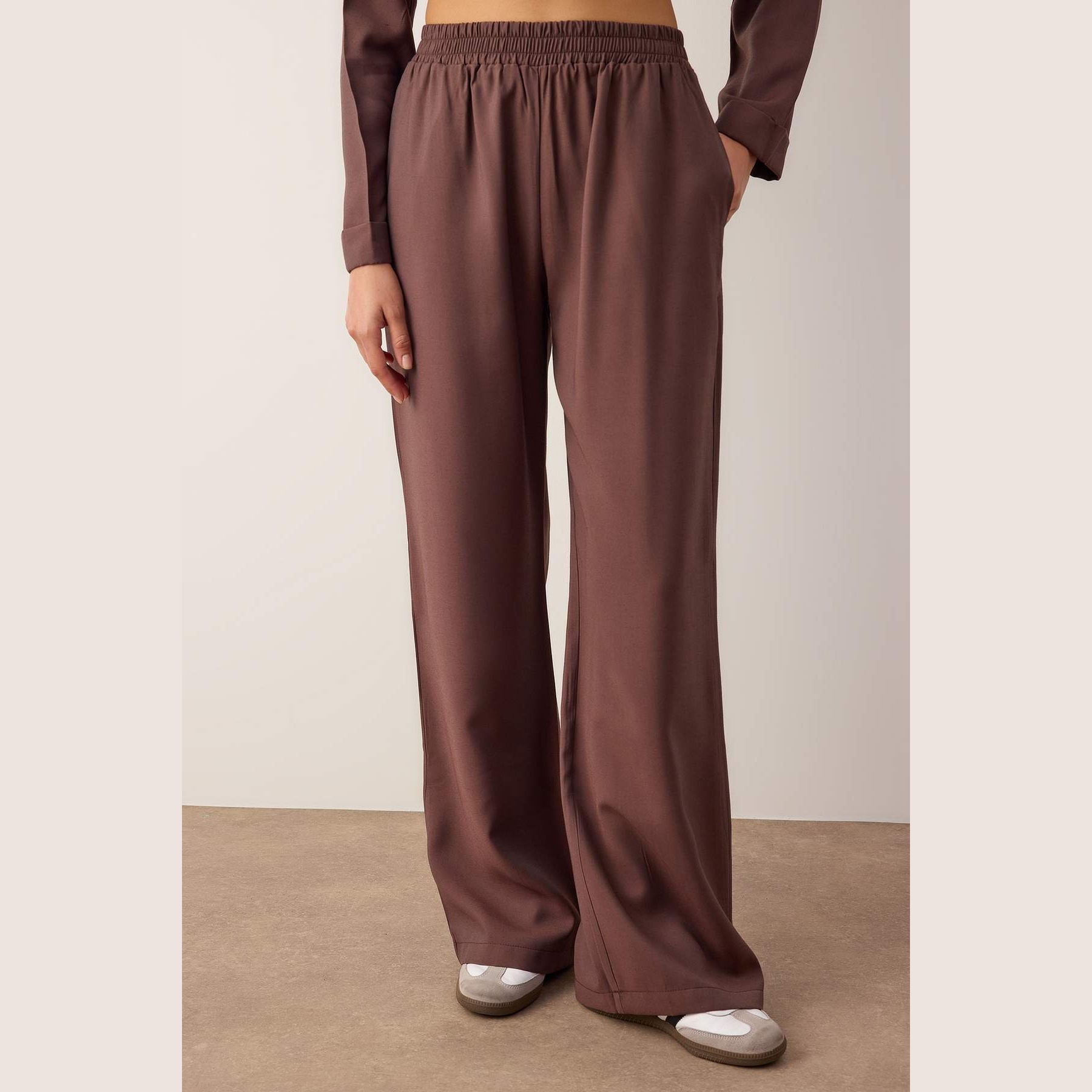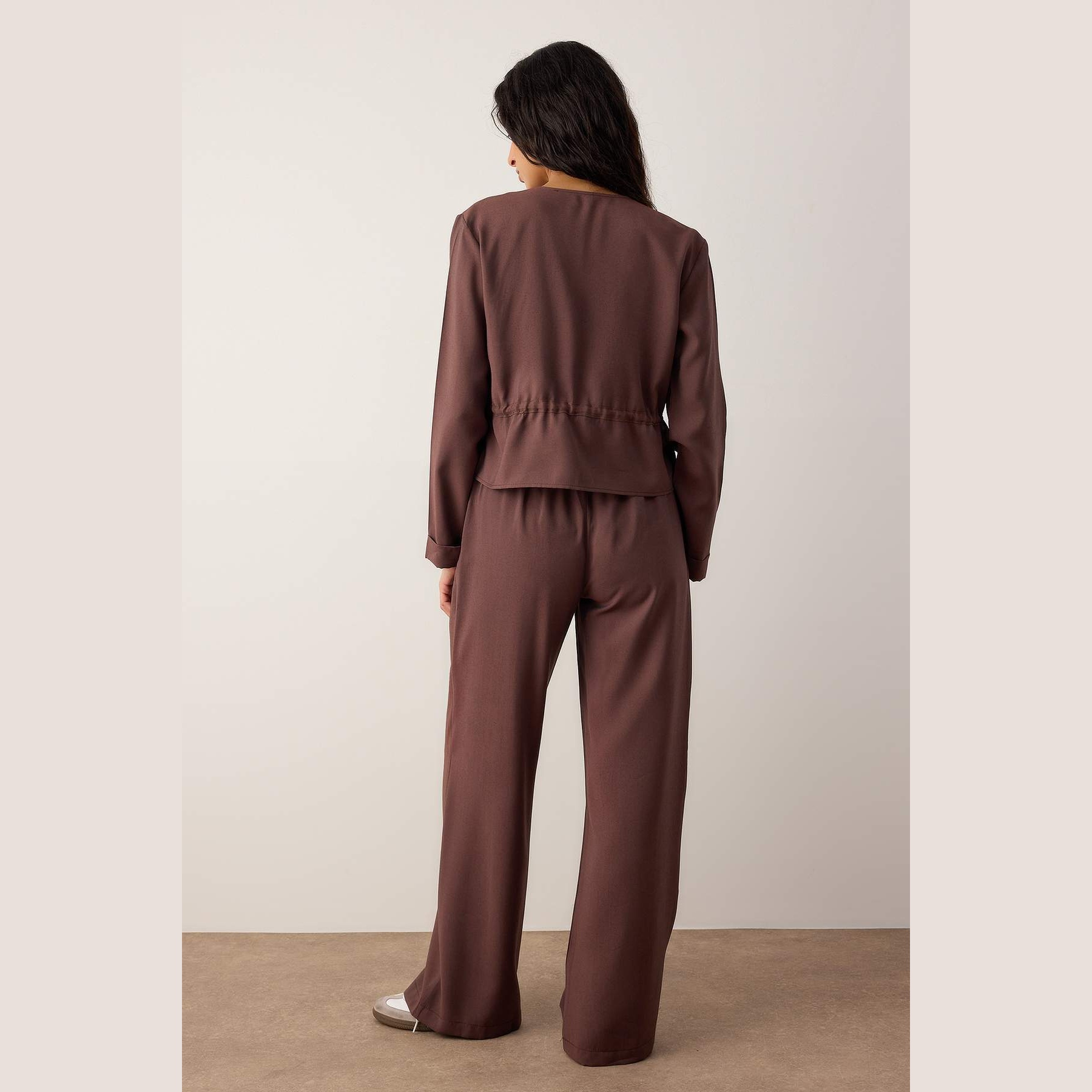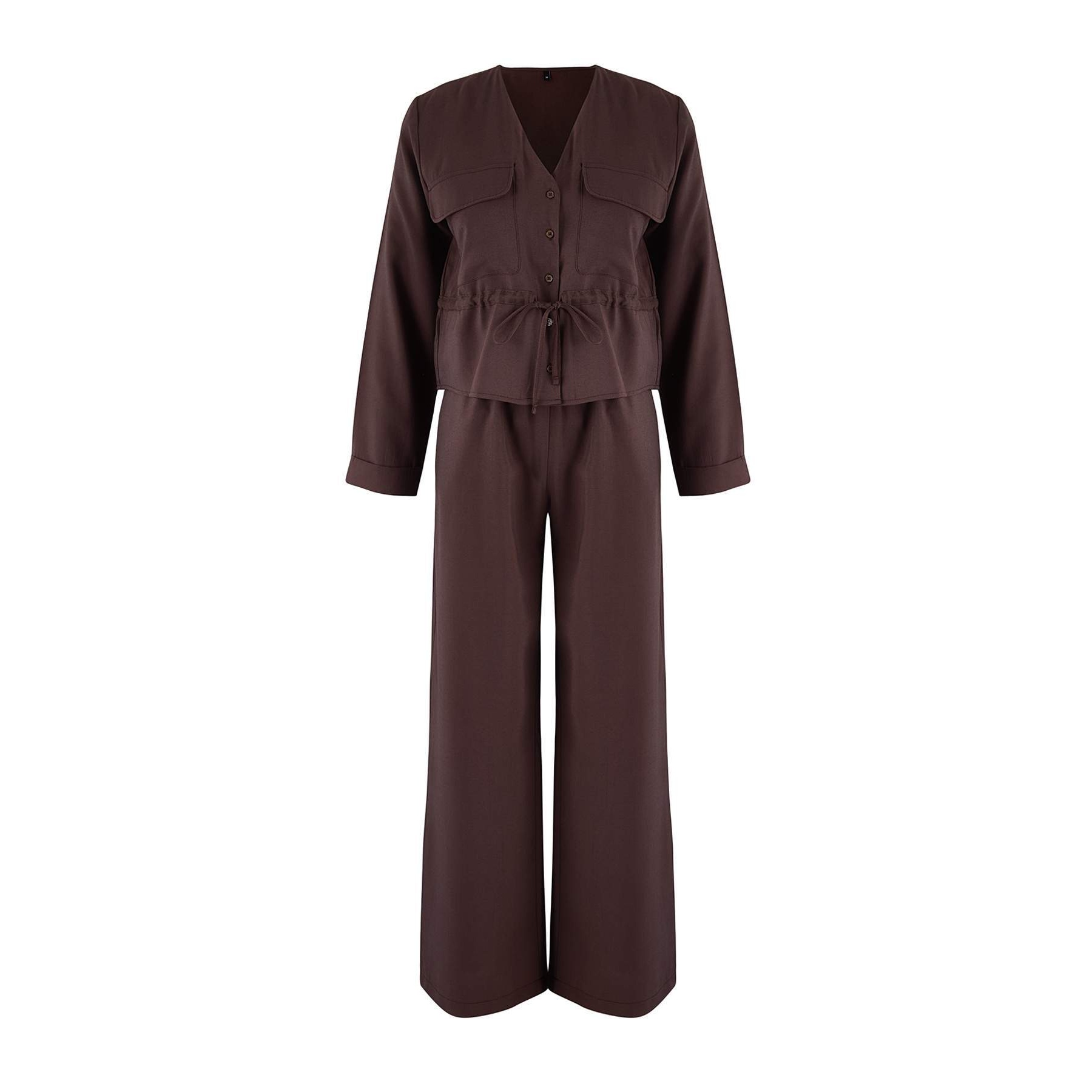 طقم أنيق بلون كافيه غامق (بني داكن) من مجموعة Trendyolmilla – لأناقة خريفية وشتوية ناعمة وعملية بلمسة راقية، يتكون من بلوزة طويلة بياقة قميص وأكمام كاملة مع بنطال مستقيم بخصر مرتفع وقصة Regular مريحة، مصنوع من خامة دوكوم ناعمة بتركيبة 100% بوليستر، ما يجعله مثاليًا للإطلالات اليومية والمناسبات العملية في الأجواء المعتدلة والباردة.