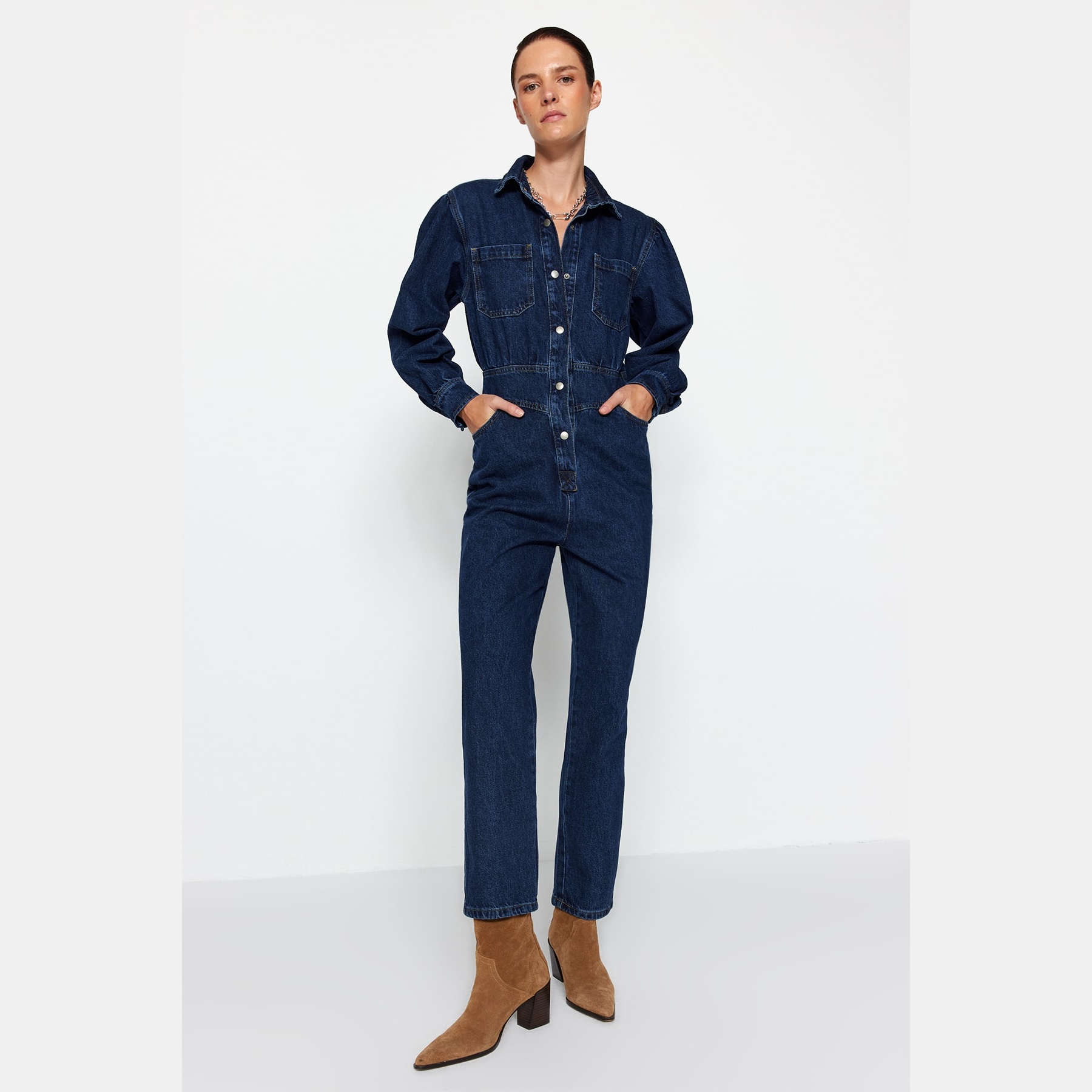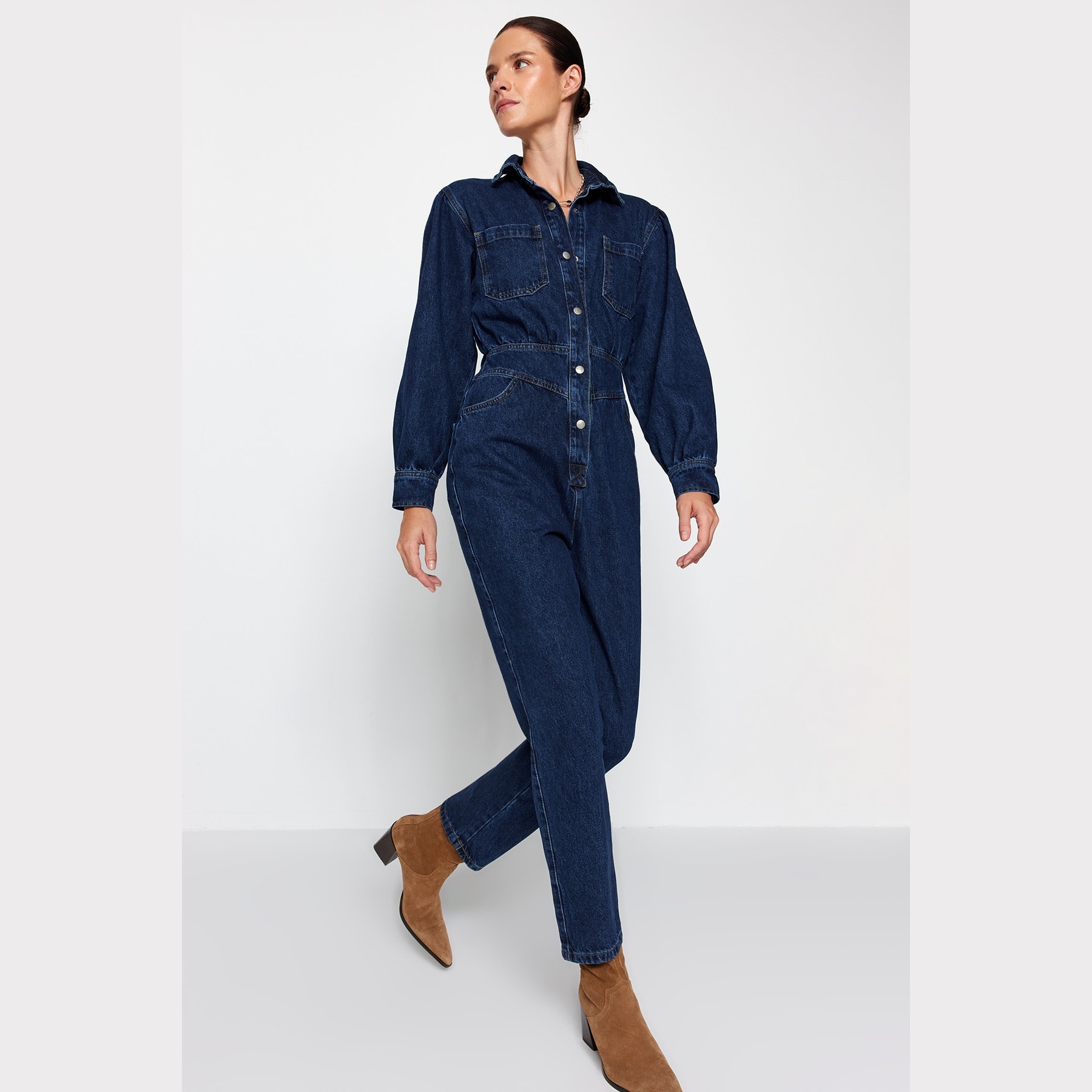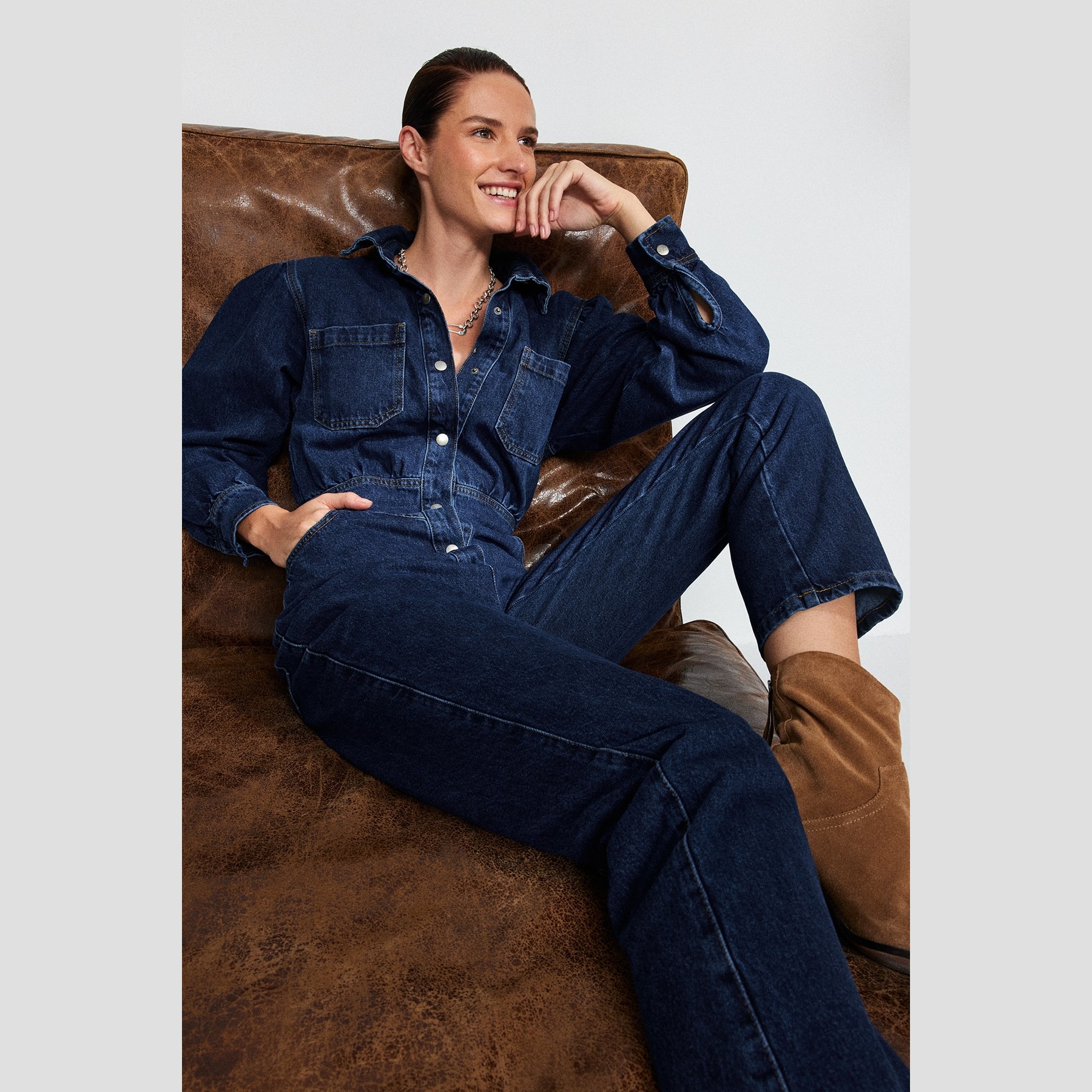 جمبسوت أنيق بلون كحلي داكن من مجموعة Trendyolmilla – لأناقة يومية جريئة بلمسة دنيم كلاسيكية، يتميز بقصة منتظمة (Regular Fit) مع أكمام منفوخة طويلة وياقة قميص، مصنوع من خامة دنيم صلب (Rigid Dokuma) بتركيبة 100% قطن، ويبرز بتصميمه العملي الذي يجمع بين الراحة والأنوثة.