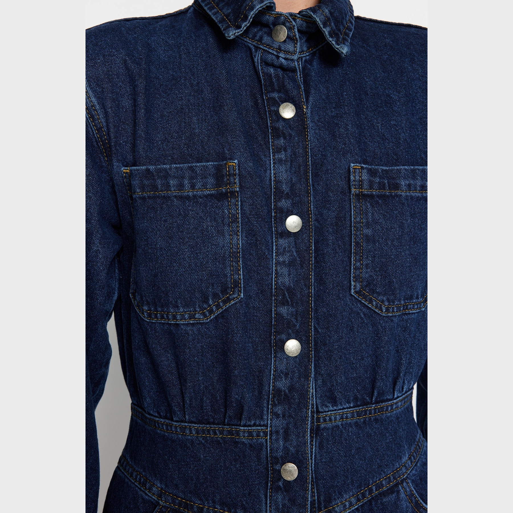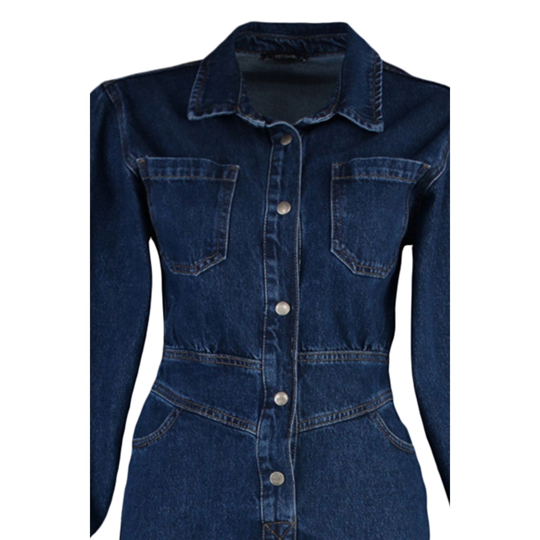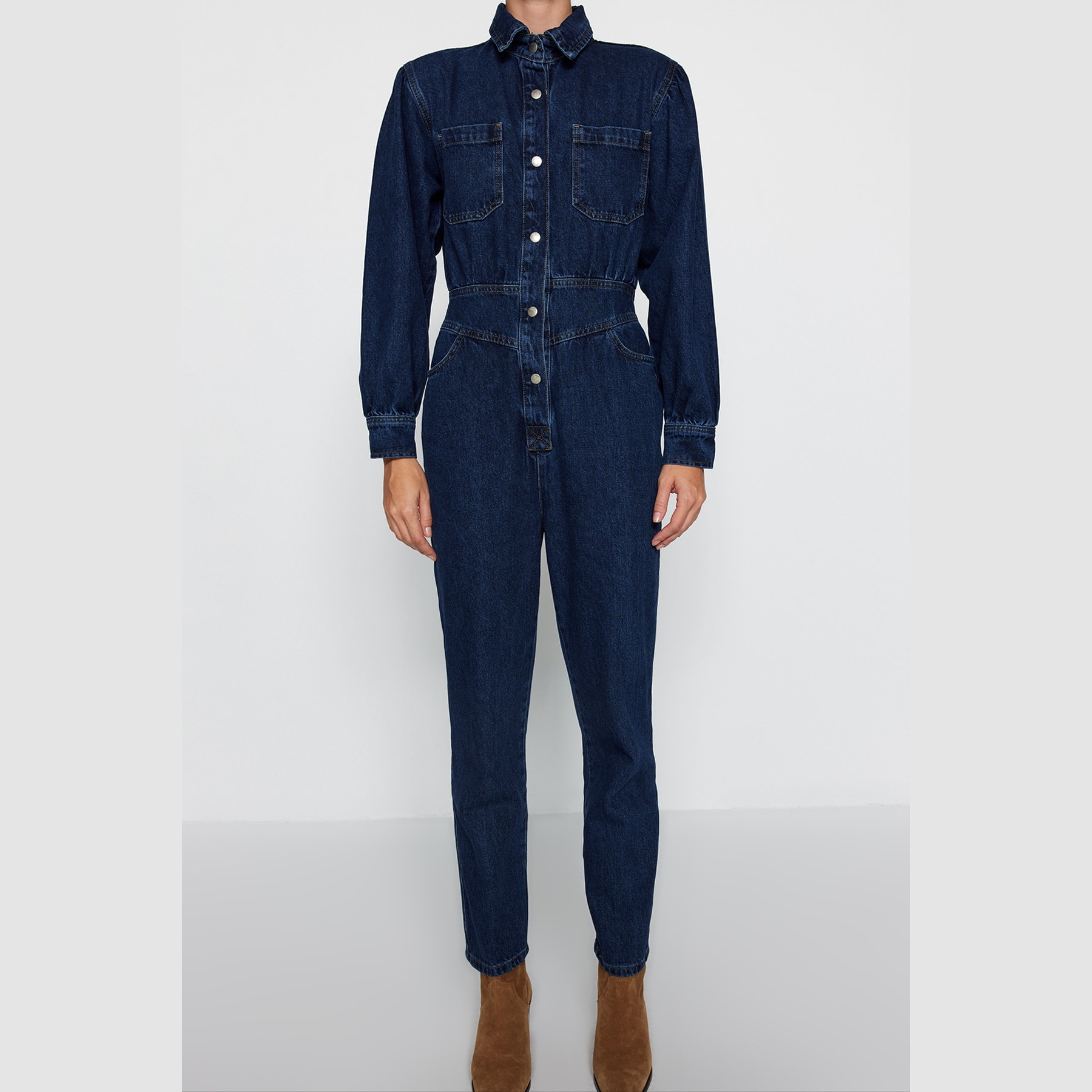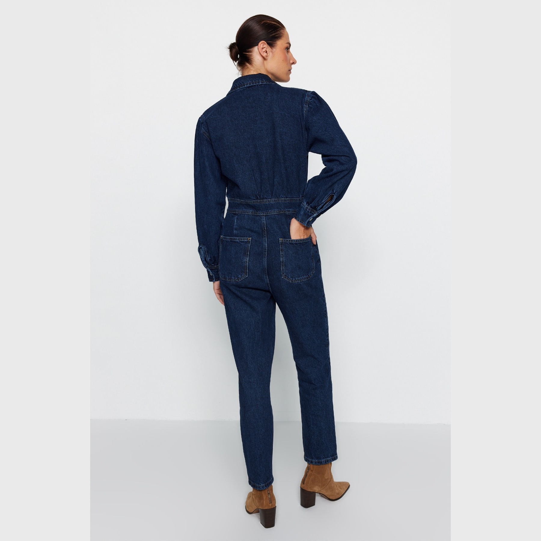 جمبسوت أنيق بلون كحلي داكن من مجموعة Trendyolmilla – لأناقة يومية جريئة بلمسة دنيم كلاسيكية، يتميز بقصة منتظمة (Regular Fit) مع أكمام منفوخة طويلة وياقة قميص، مصنوع من خامة دنيم صلب (Rigid Dokuma) بتركيبة 100% قطن، ويبرز بتصميمه العملي الذي يجمع بين الراحة والأنوثة.