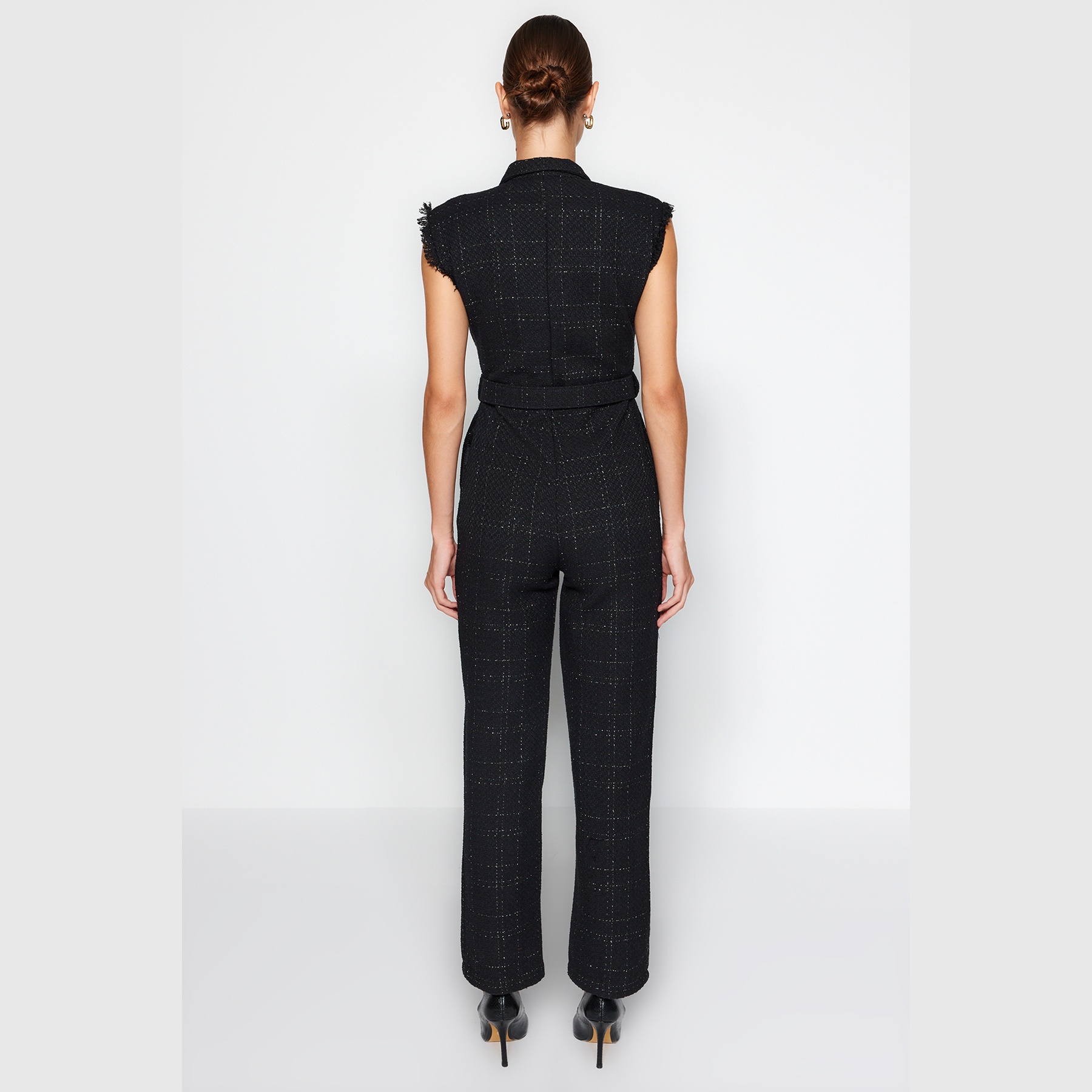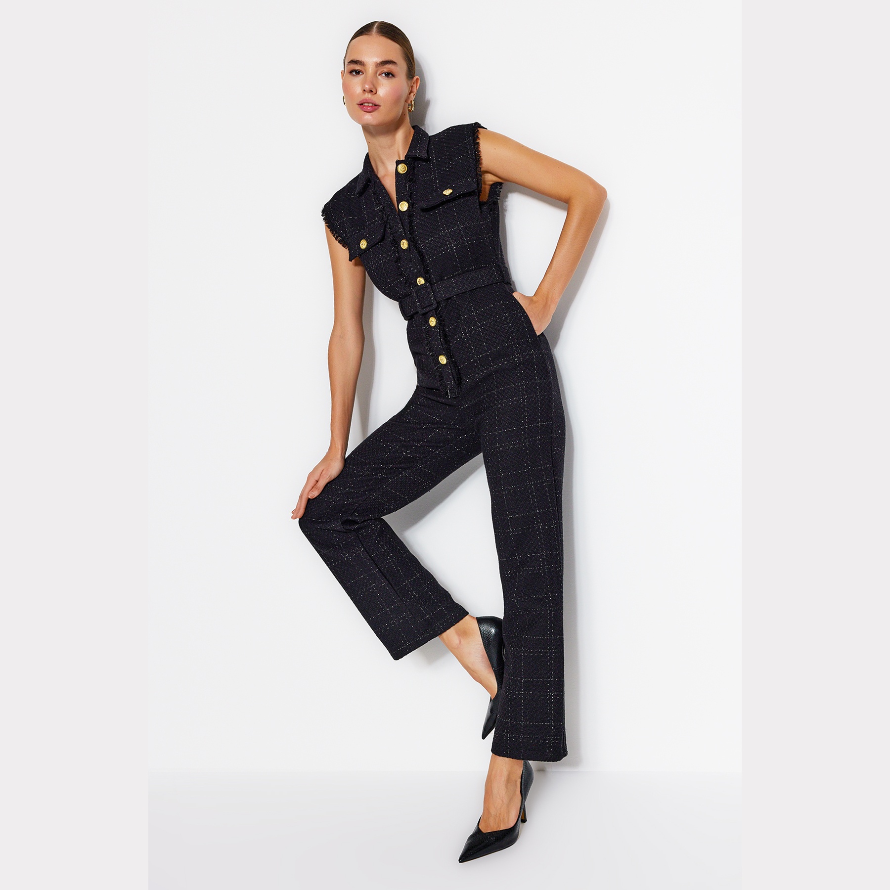 جمبسوت أنيق بلون أسود موحد من مجموعة Trendyolmilla – لأناقة يومية عملية بلمسة كلاسيكية راقية، يتميز بقصة مستقيمة (Straight Fit) مع ياقة قميص وأزرار أمامية، وحزام خصر قابل للتعديل، مصنوع من خامة تفيت دوكوم (Tüvit Dokuma) بتركيبة 60% أكريليك، 37% بوليستر، 3% إيلاستان، ما يجعله مثاليًا للإطلالات الخريفية والشتوية المحتشمة.