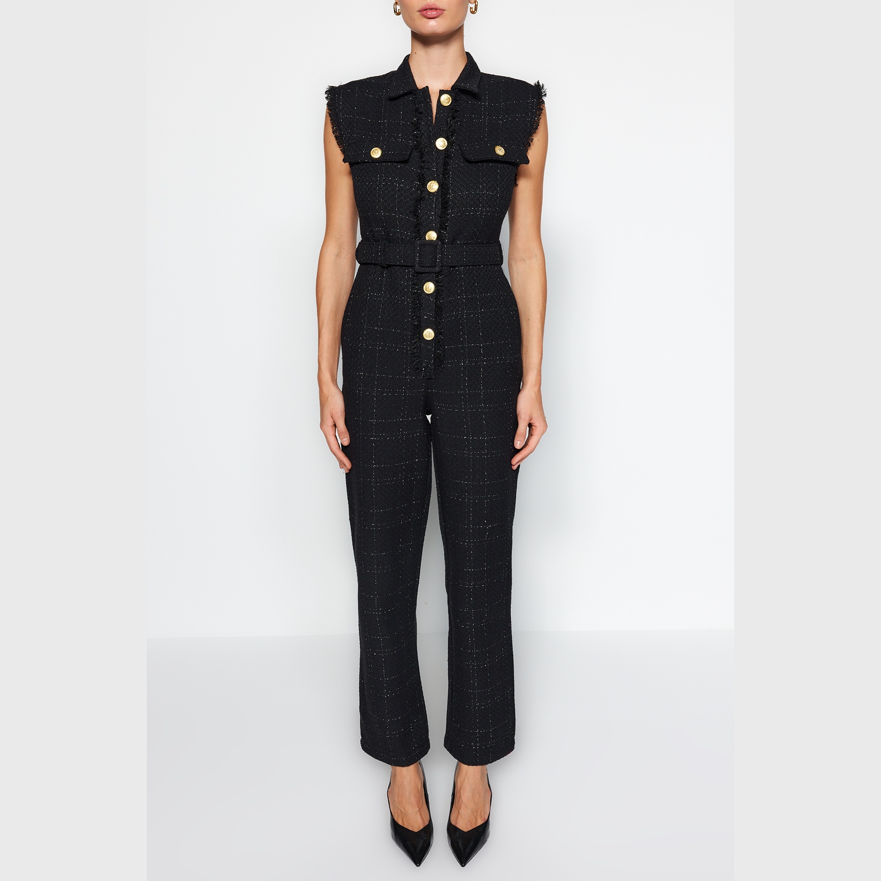 جمبسوت نسائي – أسود بحزام وياقة قميص وتفاصيل أزرار (قماش تفيت، تصميم عملي)