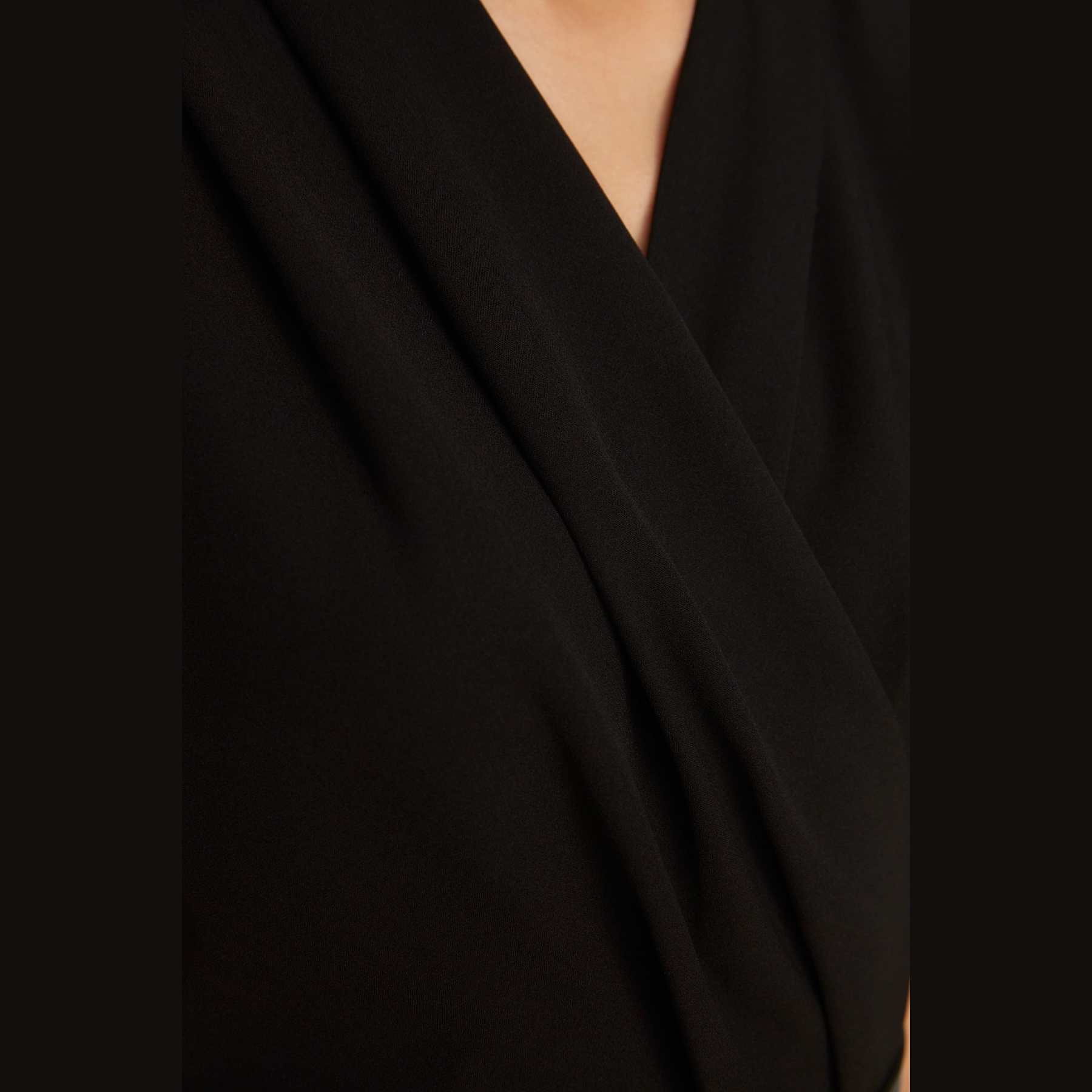 جمبسوت نسائي – أسود بحزام وياقة كروڤاز وقصة واسعة (قماش دوكوم، تصميم عملي)
