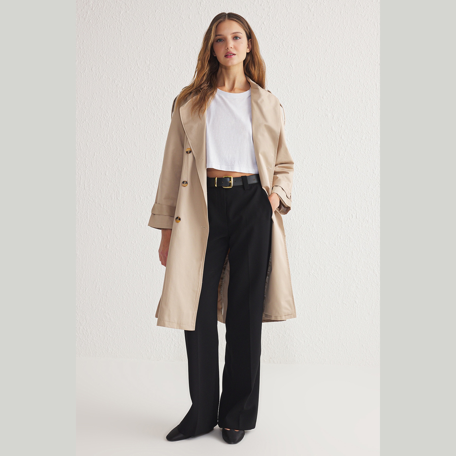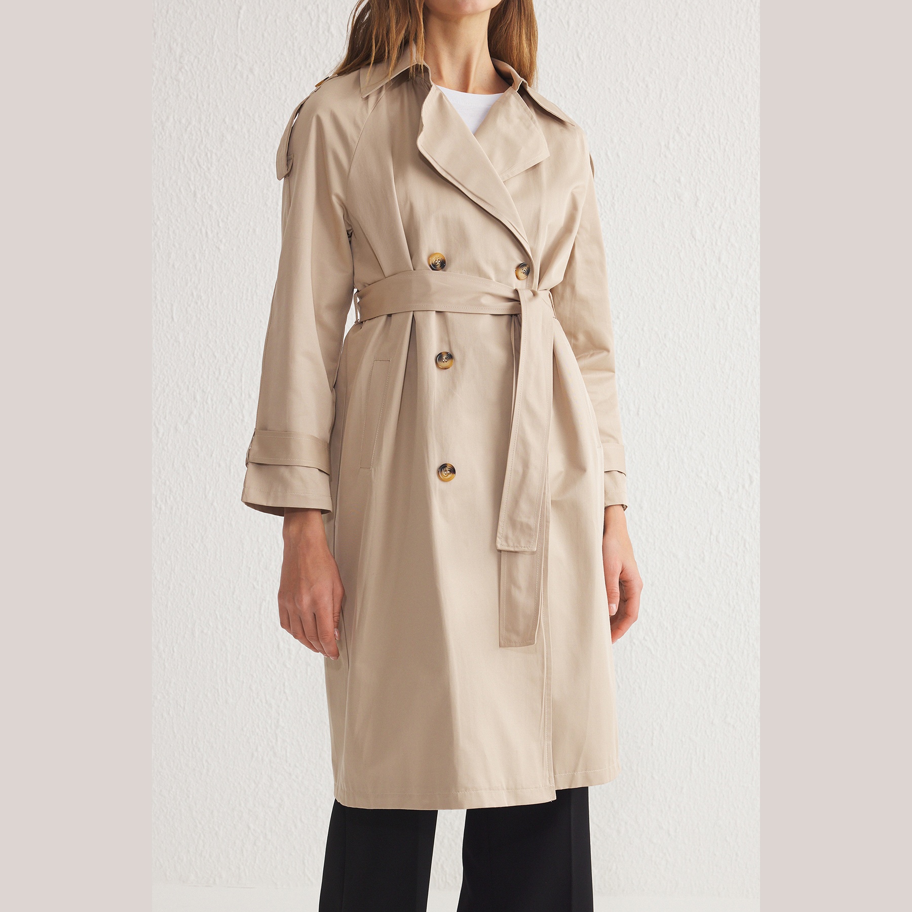 معطف ترنش أنيق بلون بيج كلاسيكي من مجموعة Trendyolmilla – لأناقة انتقالية عملية بلمسة راقية ومريحة، يتميز بقصة منتظمة (Regular Fit) مع ياقة جاكيت وأكمام طويلة، وحزام خصر قابل للتعديل، مصنوع من خامة دوكوم مقاومة للماء بتركيبة 59% قطن، 41% بوليستر، ومبطن بالكامل، ما يجعله مثاليًا لأيام الخريف والربيع المتقلبة.