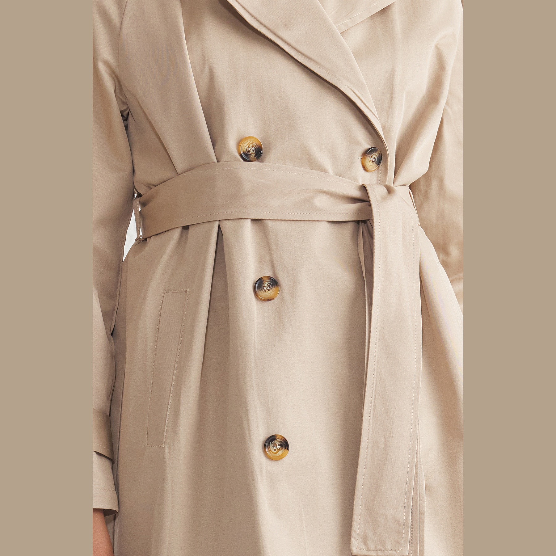 ترنش كوت نسائي – بيج بحزام وقصة منتظمة (قماش مقاوم للماء، تصميم عملي)