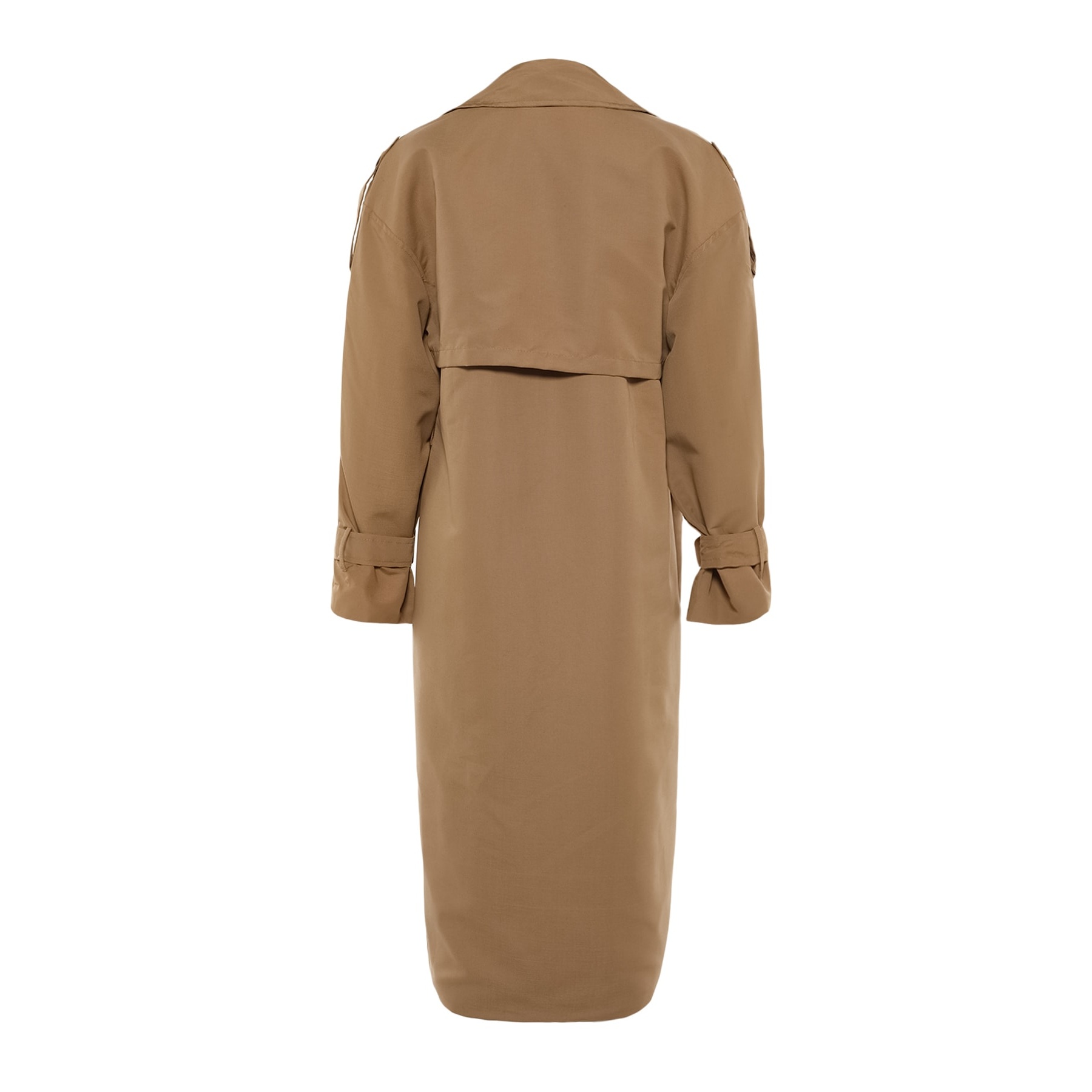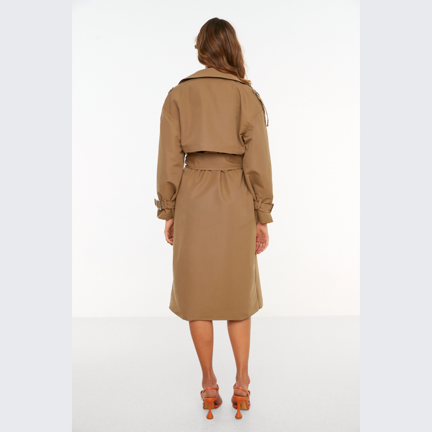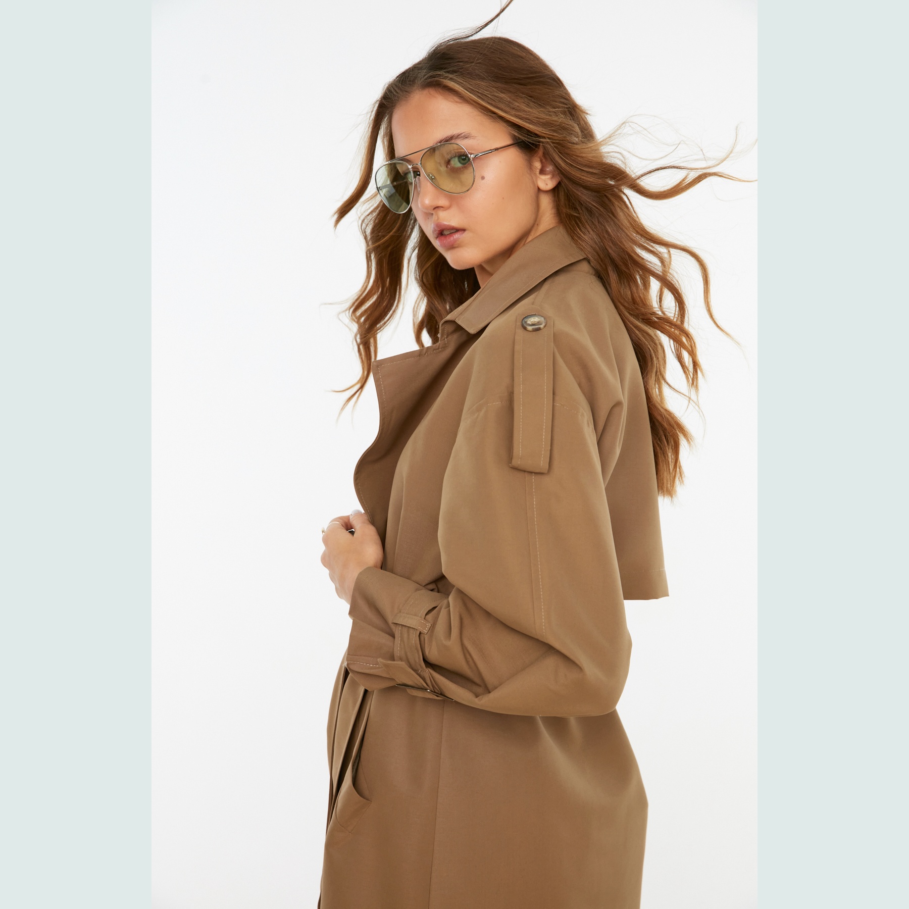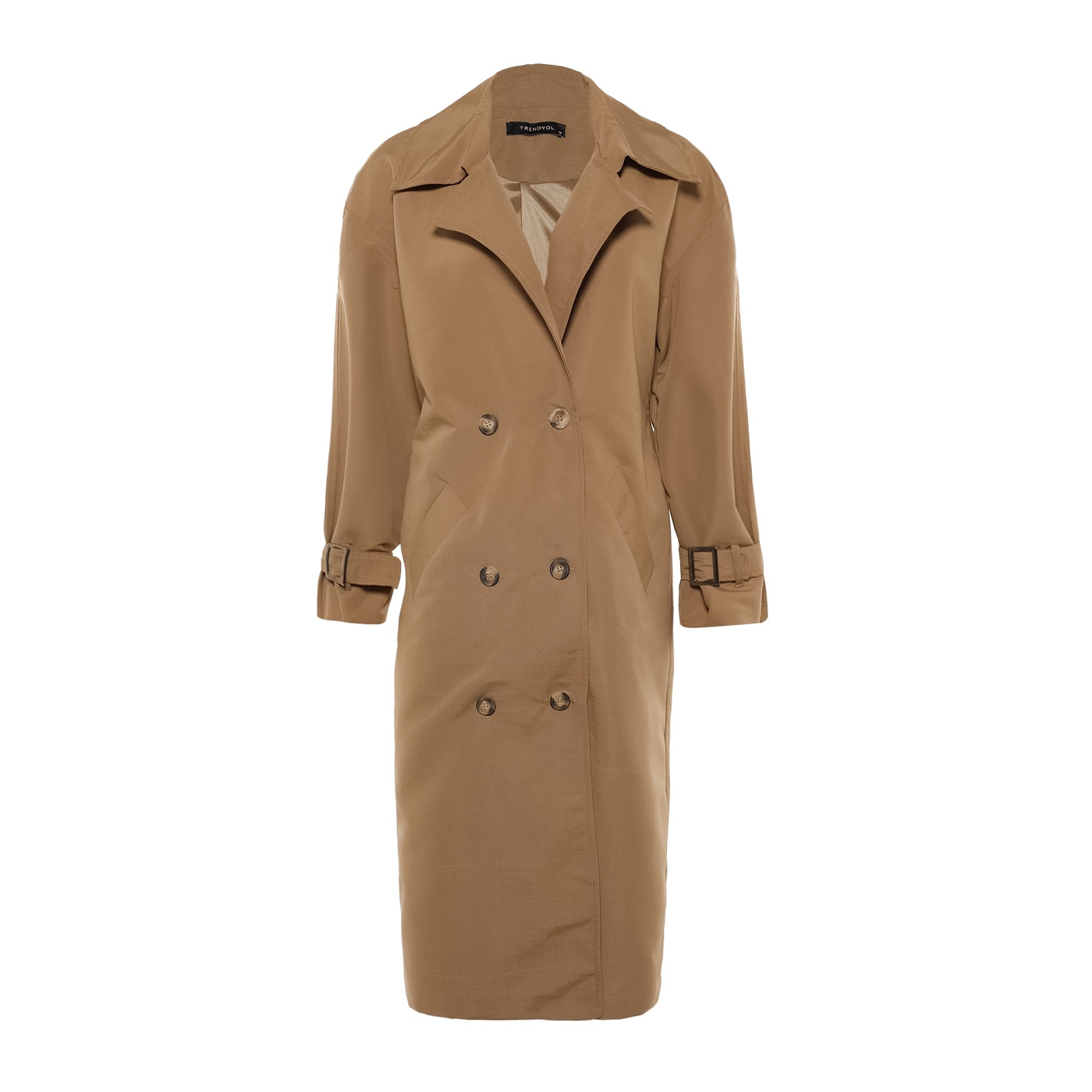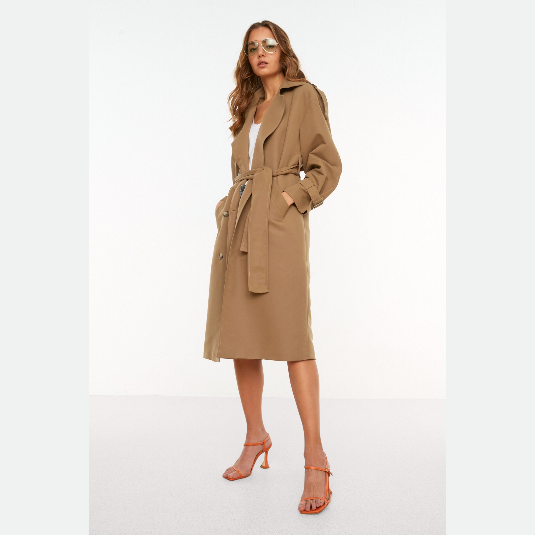 معطف ترنش أنيق بلون فِيزون دافئ من مجموعة Trendyolmilla – لأناقة انتقالية عملية بلمسة عصرية واسعة، يتميز بقصة Oversize واسعة مع ياقة كروڤاز مزدوجة، وأكمام منخفضة، وحزام خصر قابل للتعديل، مصنوع من خامة دوكوم مقاومة للماء بتركيبة 100% بوليستر، ومبطن بالكامل، ما يجعله مثاليًا لأيام الخريف والربيع الممطرة.