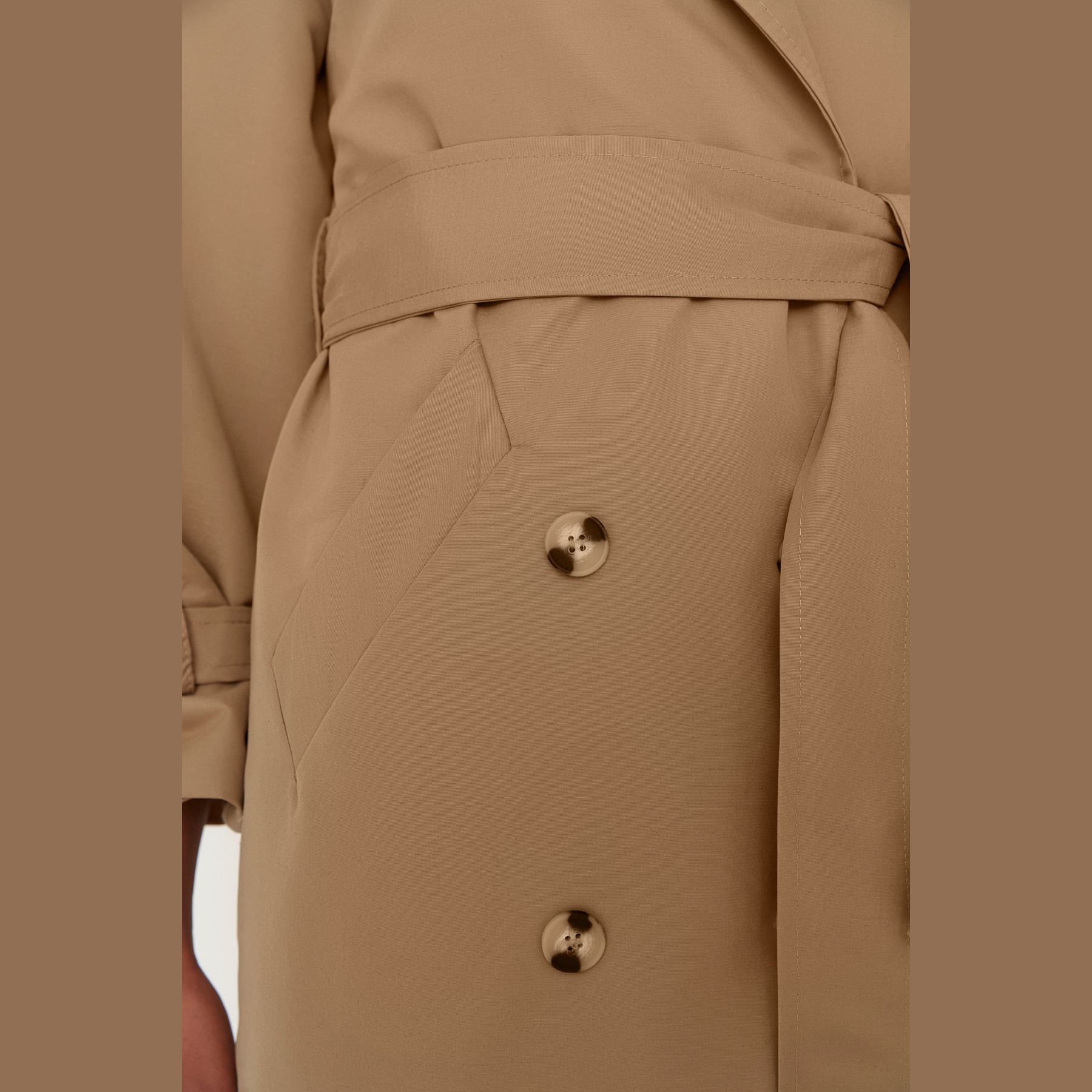 ترنش كوت نسائي – فِيزون بحزام وتفاصيل رياح (قماش مقاوم للماء، تصميم عملي)