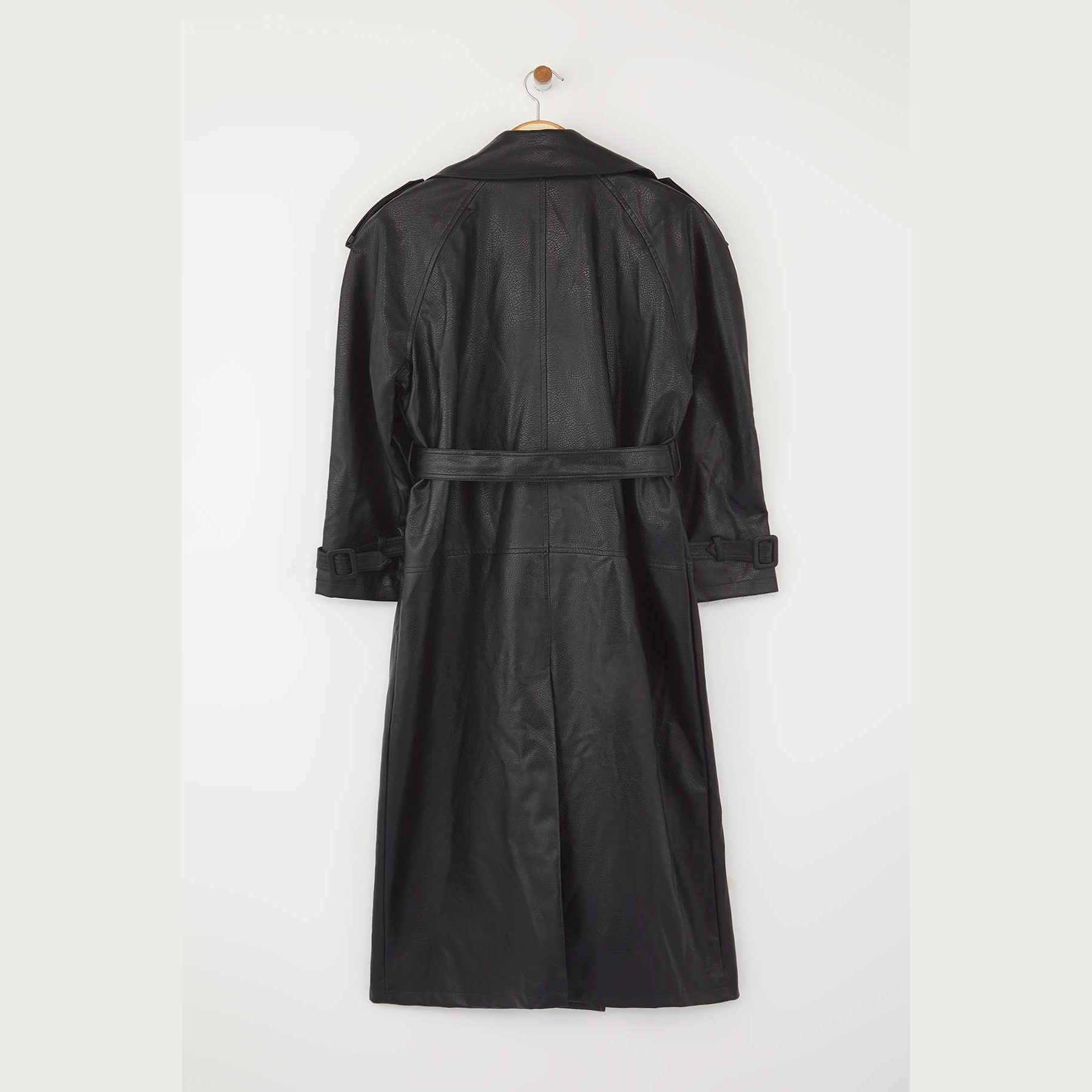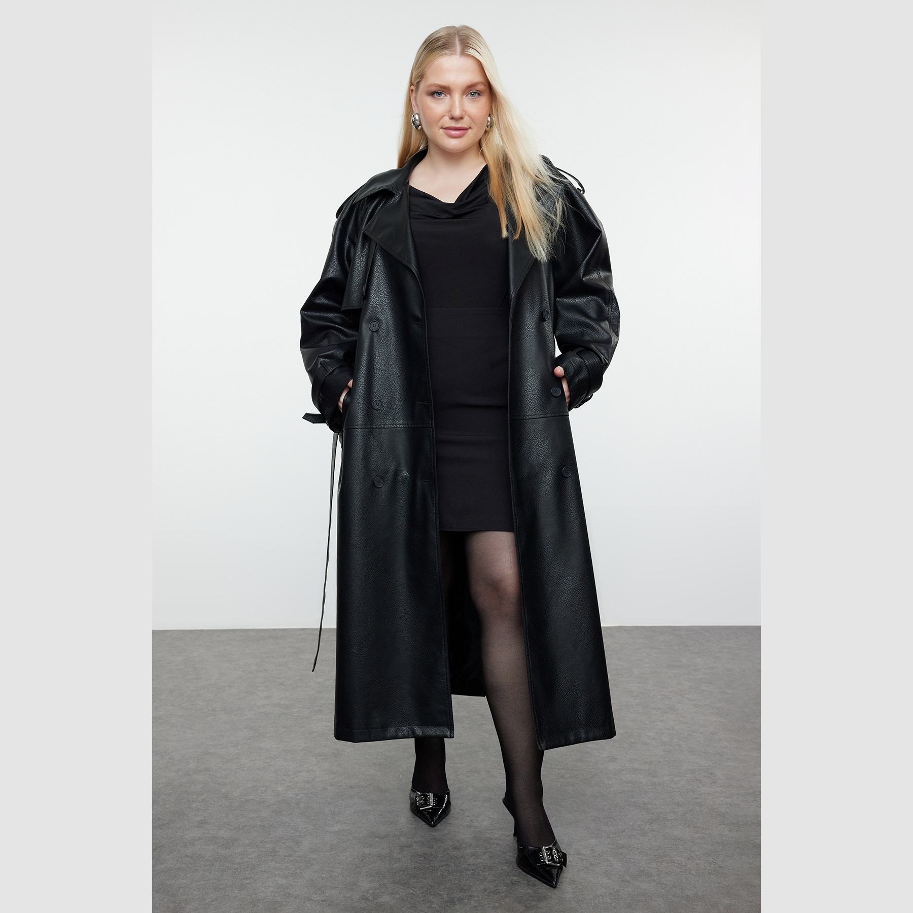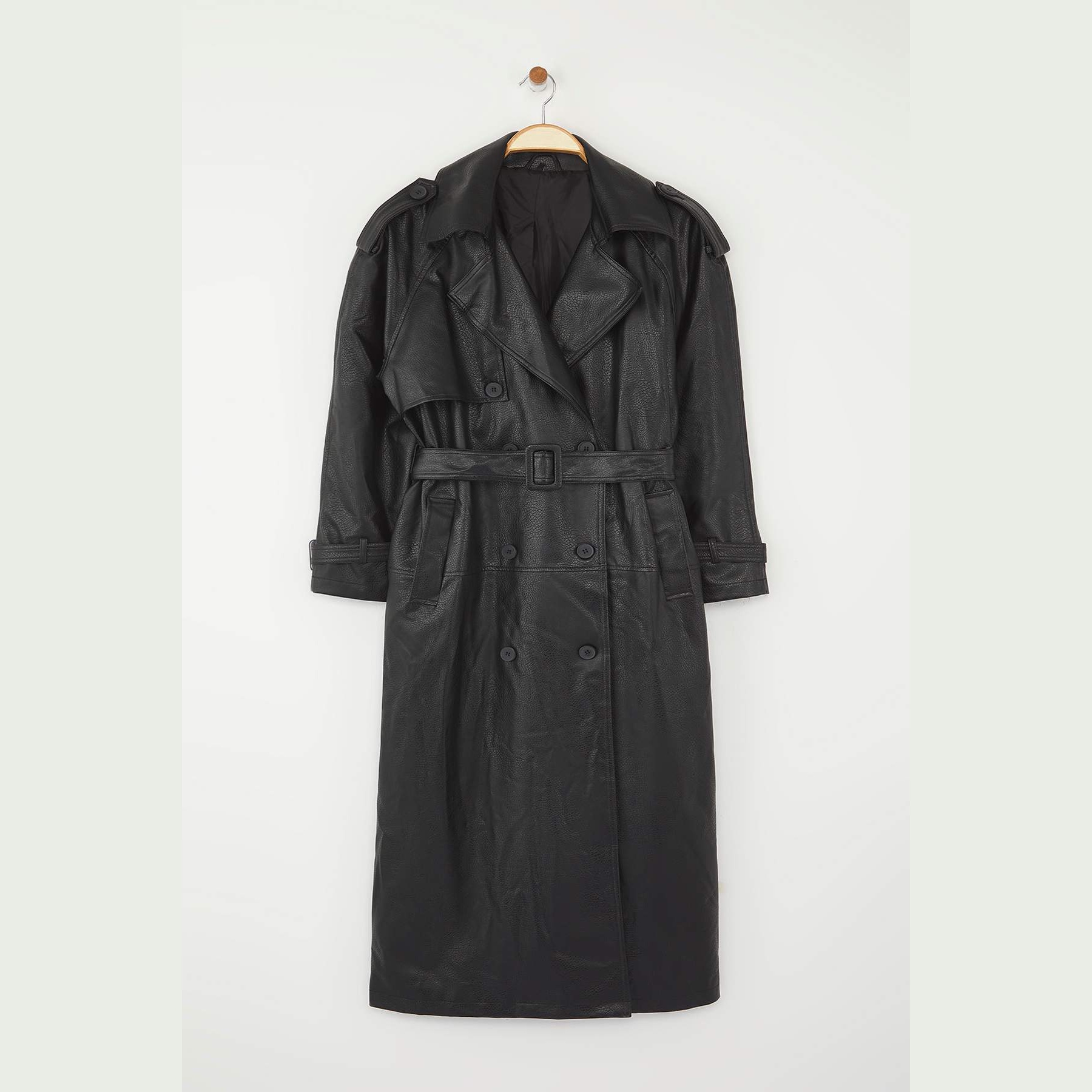 ترنش كوت نسائي – أسود من الجلد الصناعي بقصة منتظمة وطول ماكسي (تصميم كبير الحجم)