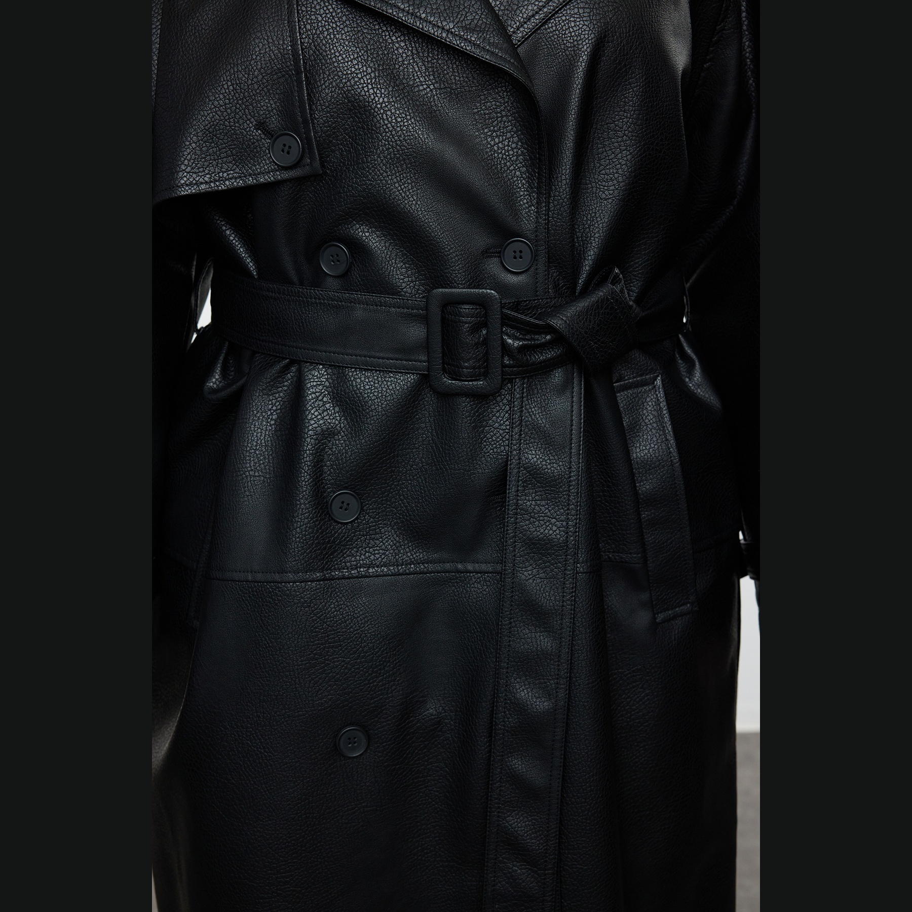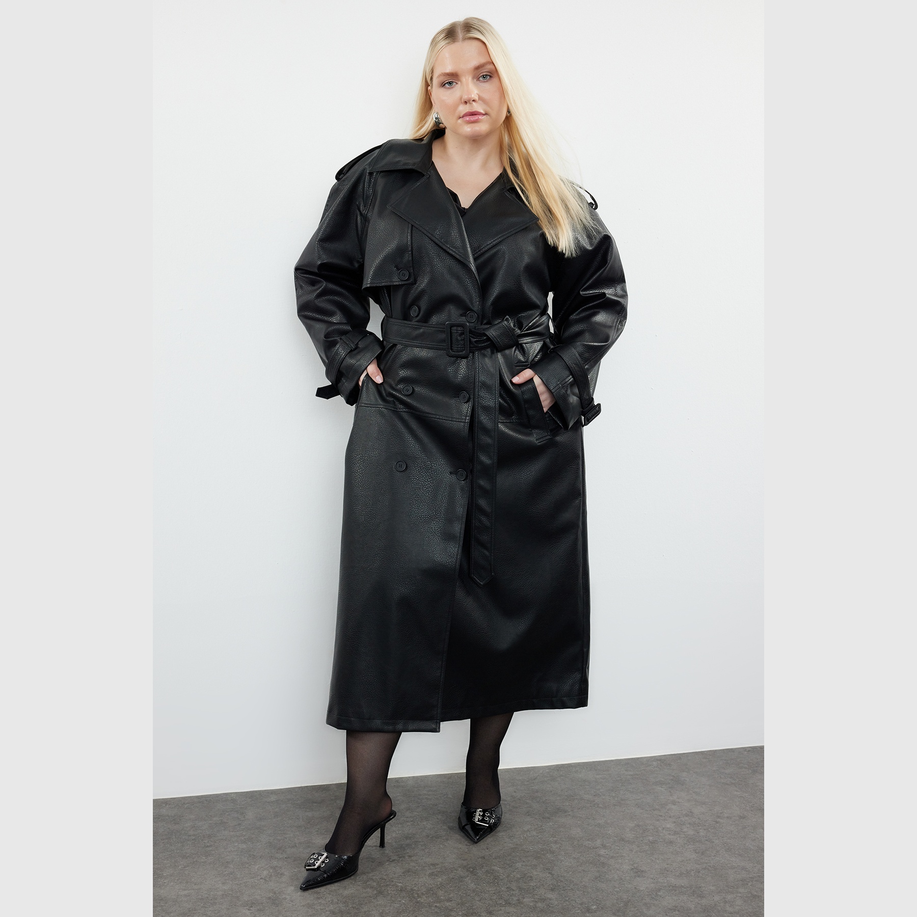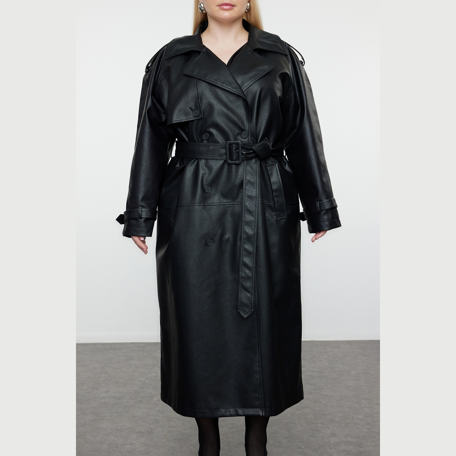ترنش كوت نسائي – أسود من الجلد الصناعي بقصة منتظمة وطول ماكسي (تصميم كبير الحجم)