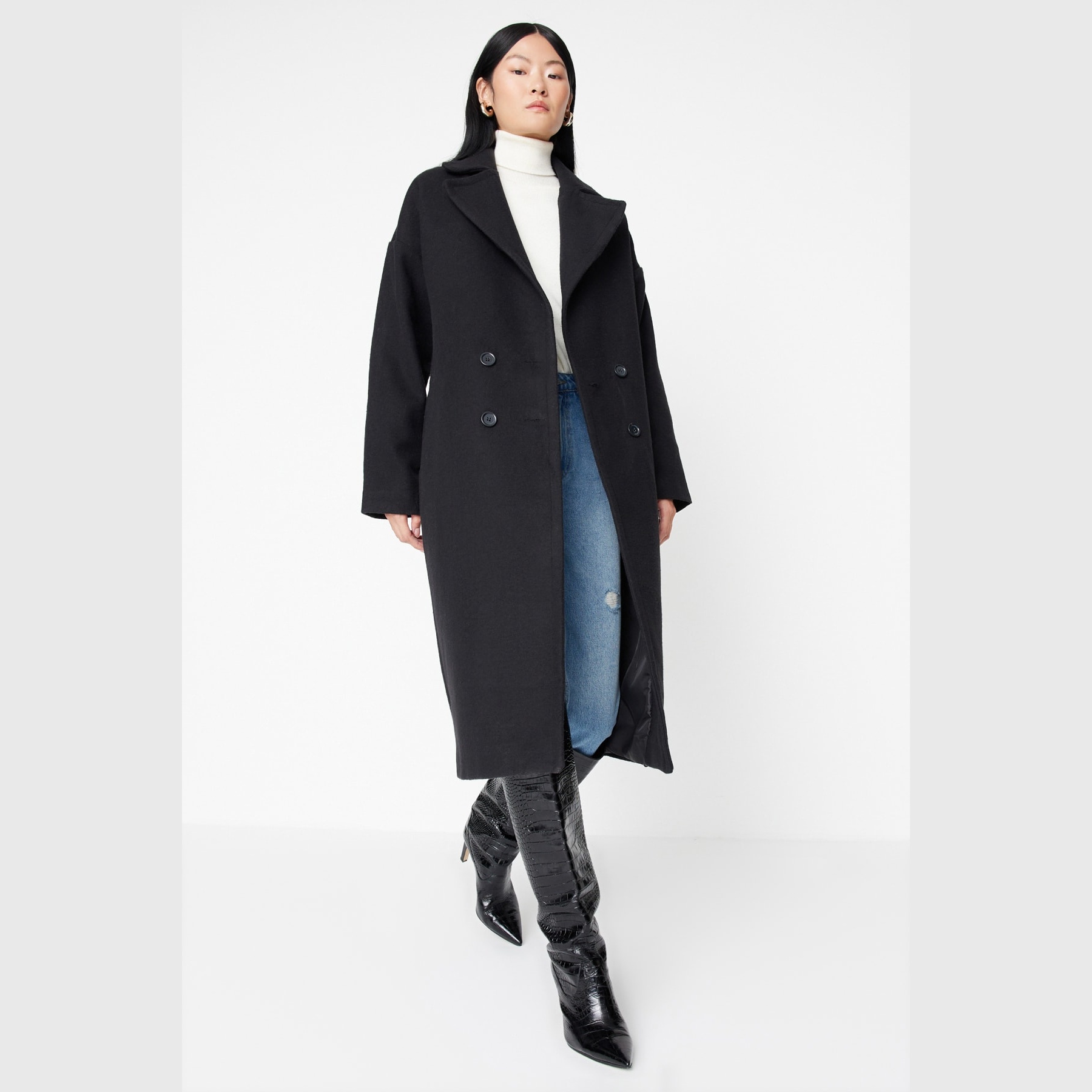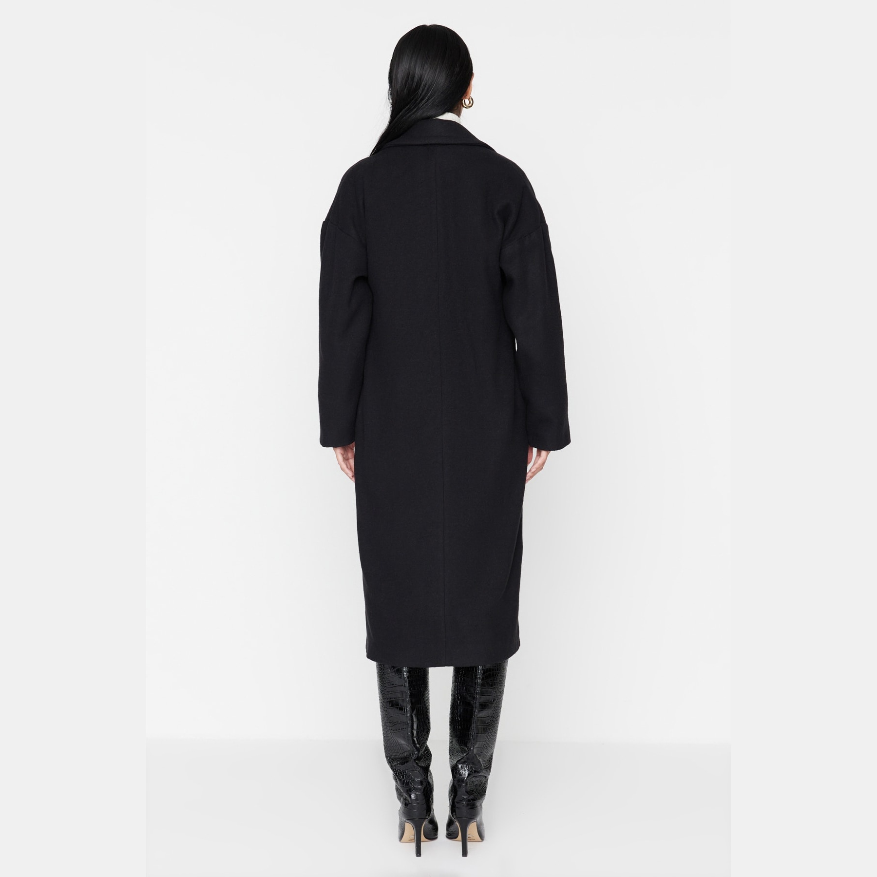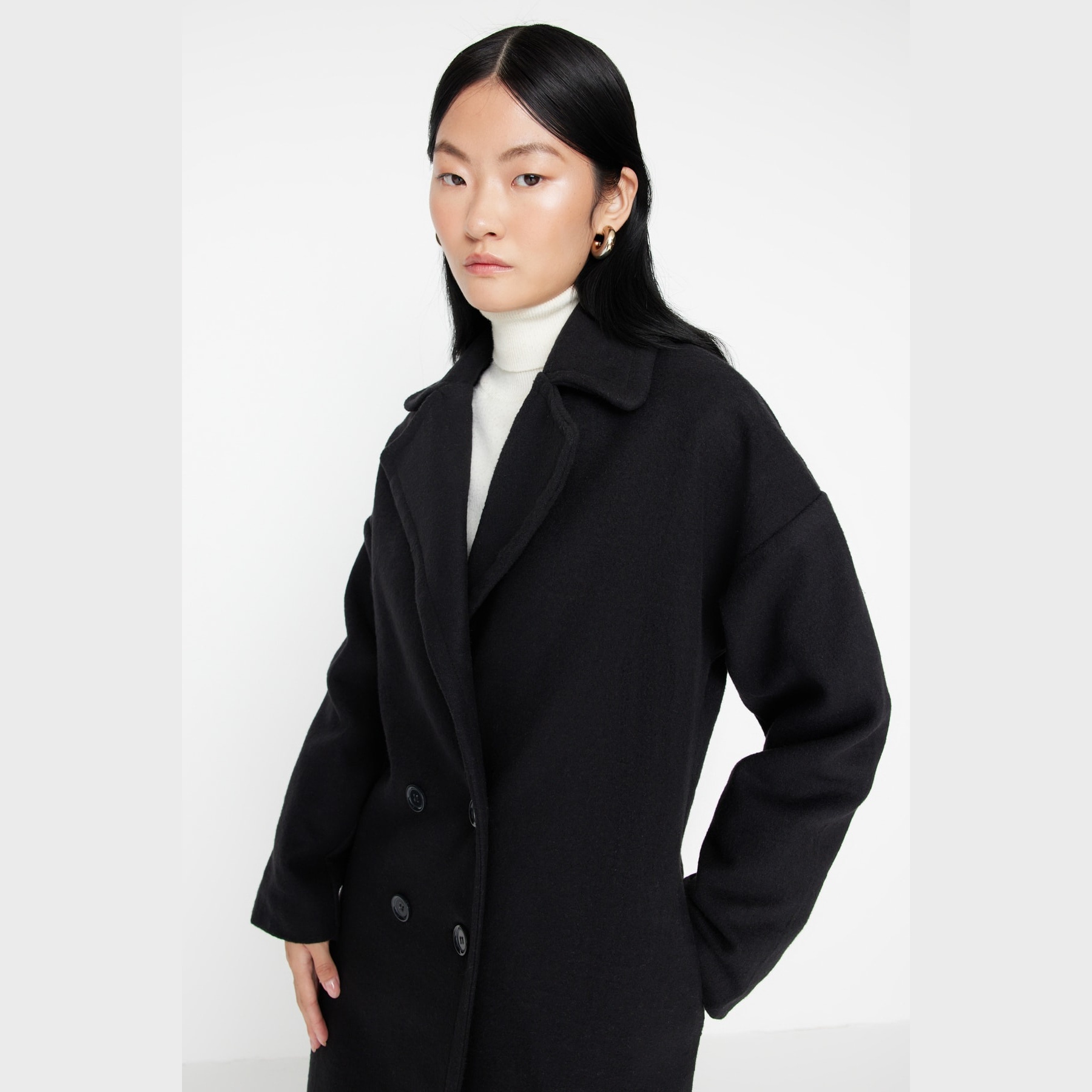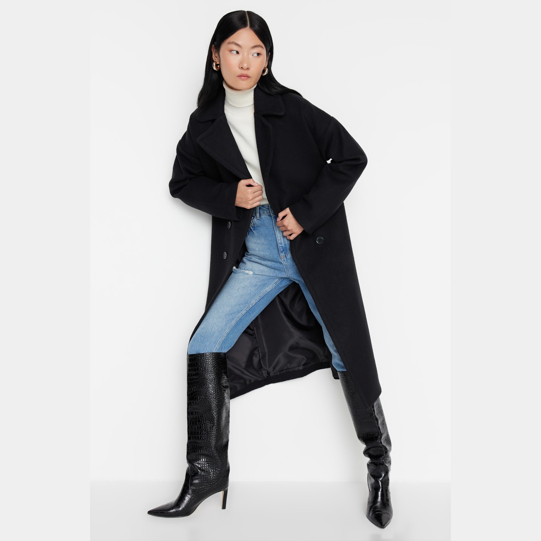 كاب شتوي أنيق بلون أسود موحد من مجموعة Trendyolmilla – لأناقة دافئة بلمسة كلاسيكية واسعة، يتميز بقصة Oversize واسعة وطويلة مع ياقة كروڤاز مزدوجة، وأكمام طويلة، وإغلاق أمامي بأزرار، مصنوع من خامة كاشمير صوفي (Kaşe Dokuma) بتركيبة غنية تشمل 62% بوليستر، 19% أكريليك، 13% صوف، 3% قطن، 3% فيسكوز، ومبطن بالكامل، ما يجعله مثاليًا لأيام الشتاء الباردة.