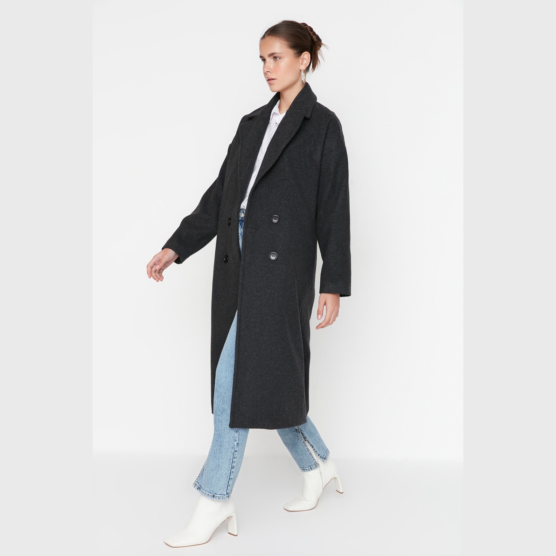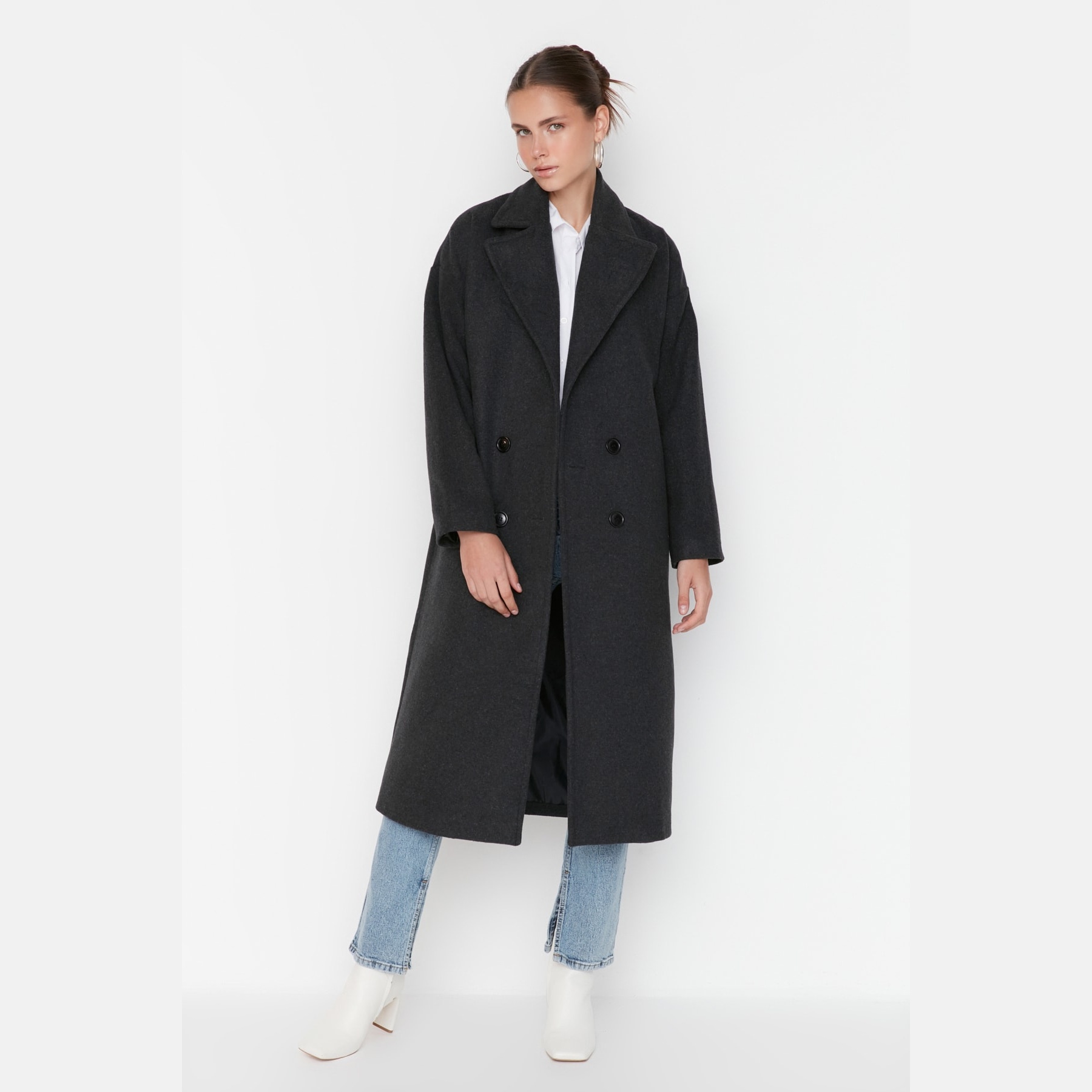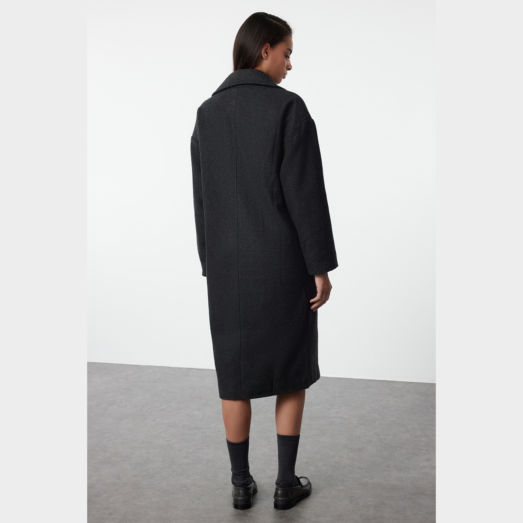 كاب شتوي أنيق بلون أنْتراسيت رمادي غامق من مجموعة Trendyolmilla – لأناقة دافئة بلمسة كلاسيكية واسعة، يتميز بقصة Oversize واسعة وطويلة مع ياقة كروڤاز مزدوجة، وأكمام طويلة، وإغلاق أمامي بأزرار، مصنوع من خامة كاشمير صوفي (Kaşe Dokuma) بتركيبة غنية تشمل 62% بوليستر، 19% أكريليك، 13% صوف، 3% قطن، 3% فيسكوز، ومبطن بالكامل، ما يجعله مثاليًا لأيام الشتاء الباردة.