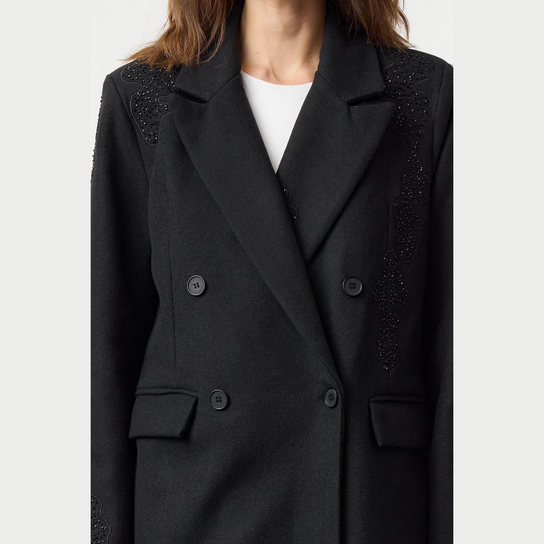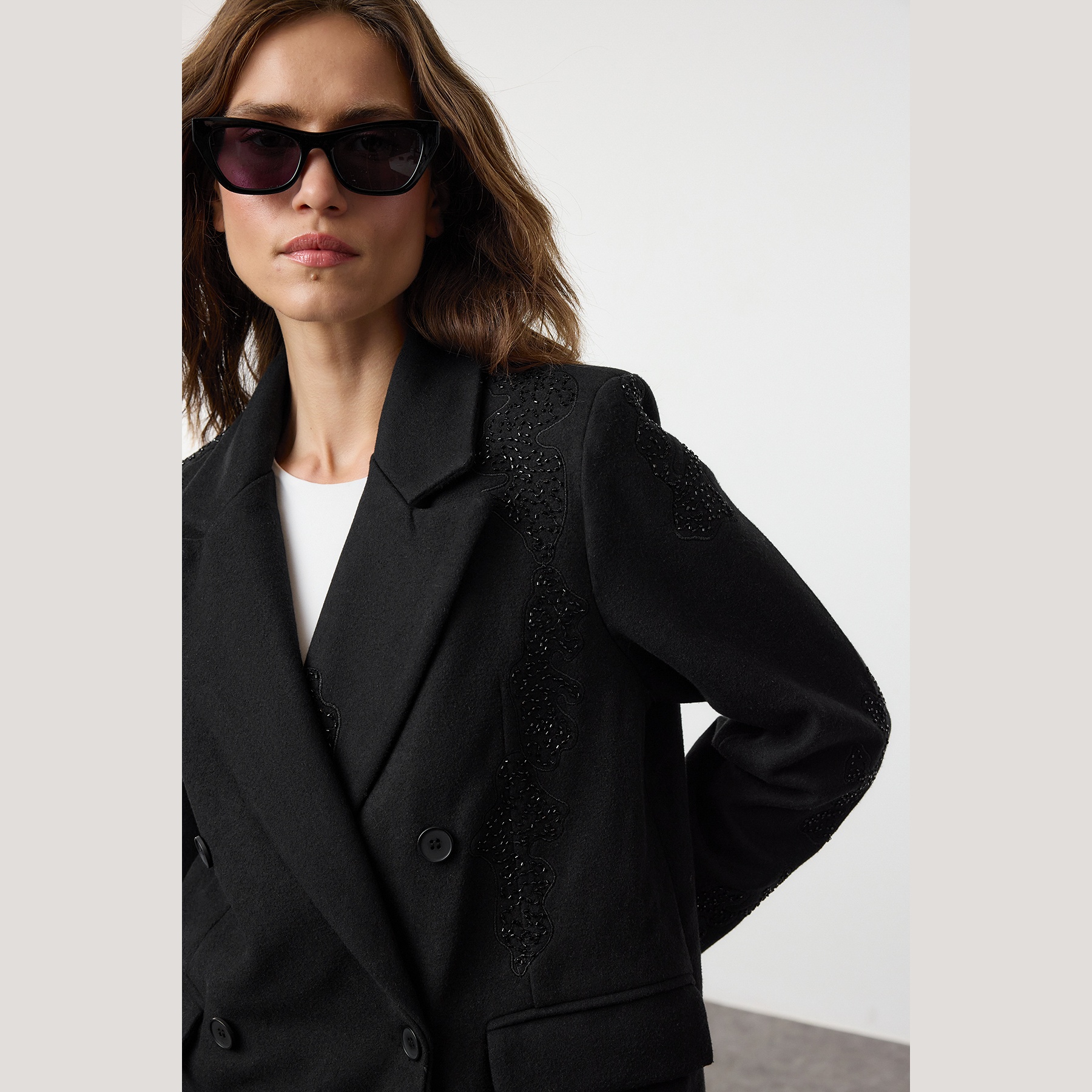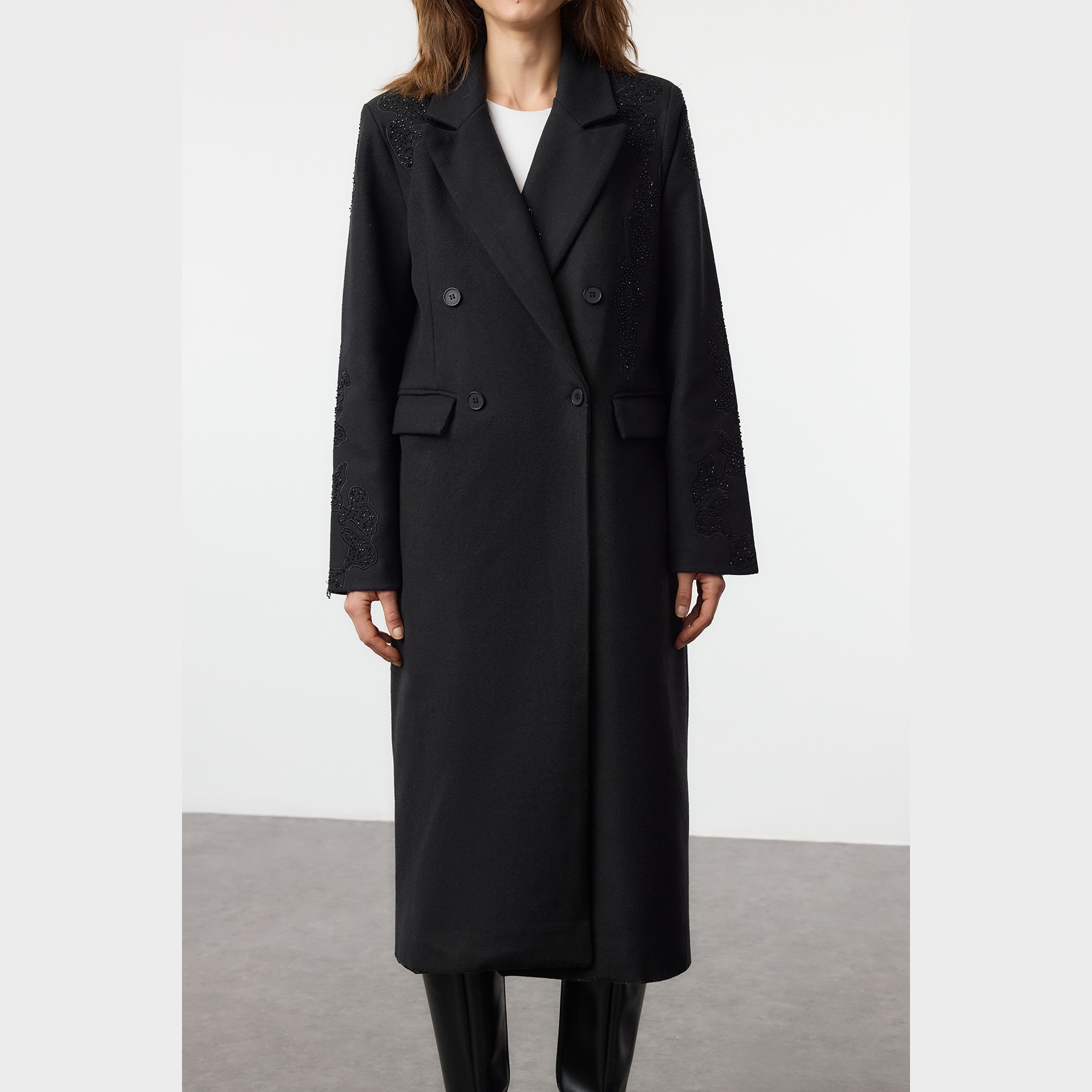 كاب نسائي – أسود بتفاصيل تطريز وقصة منتظمة (قماش ناعم، تصميم شتوي)