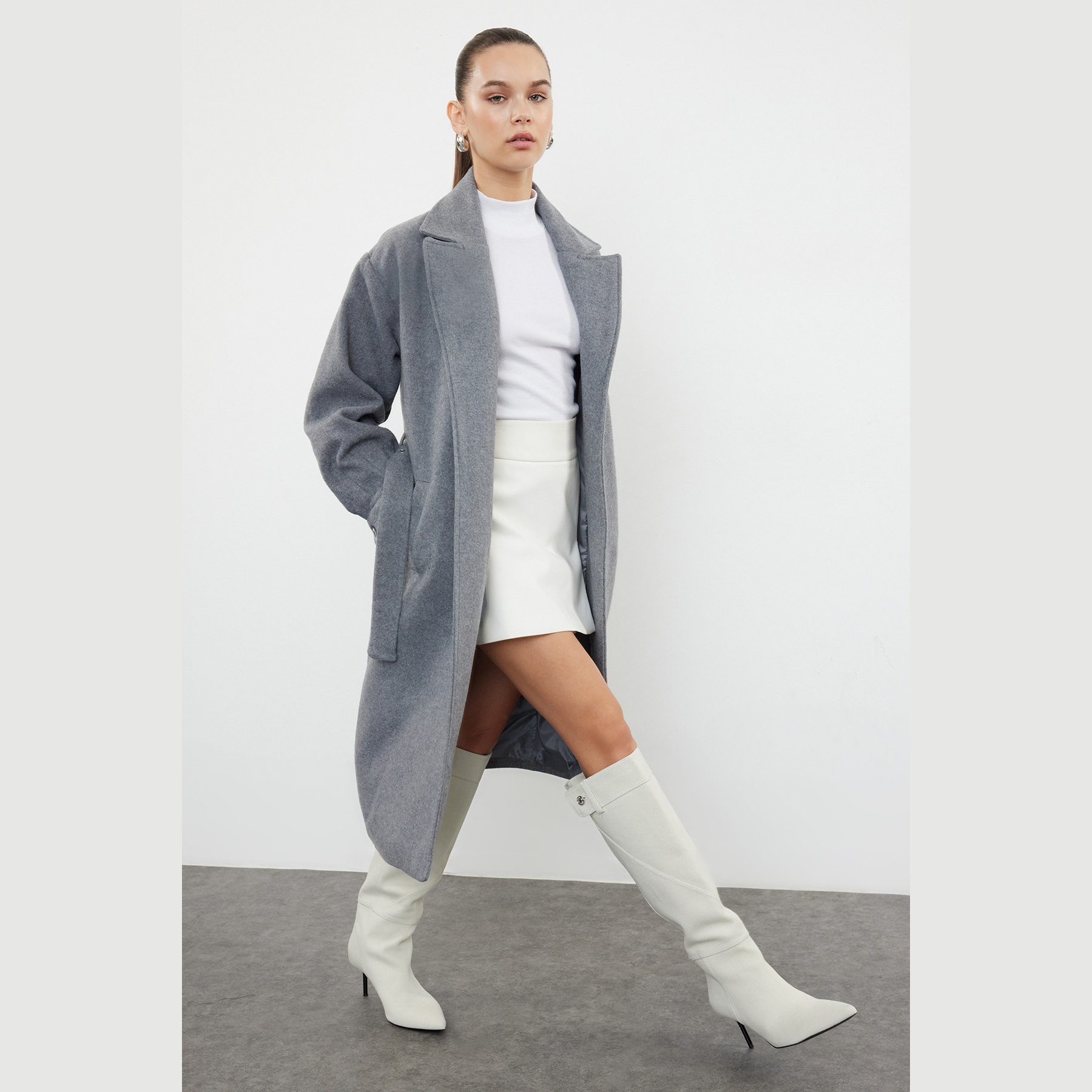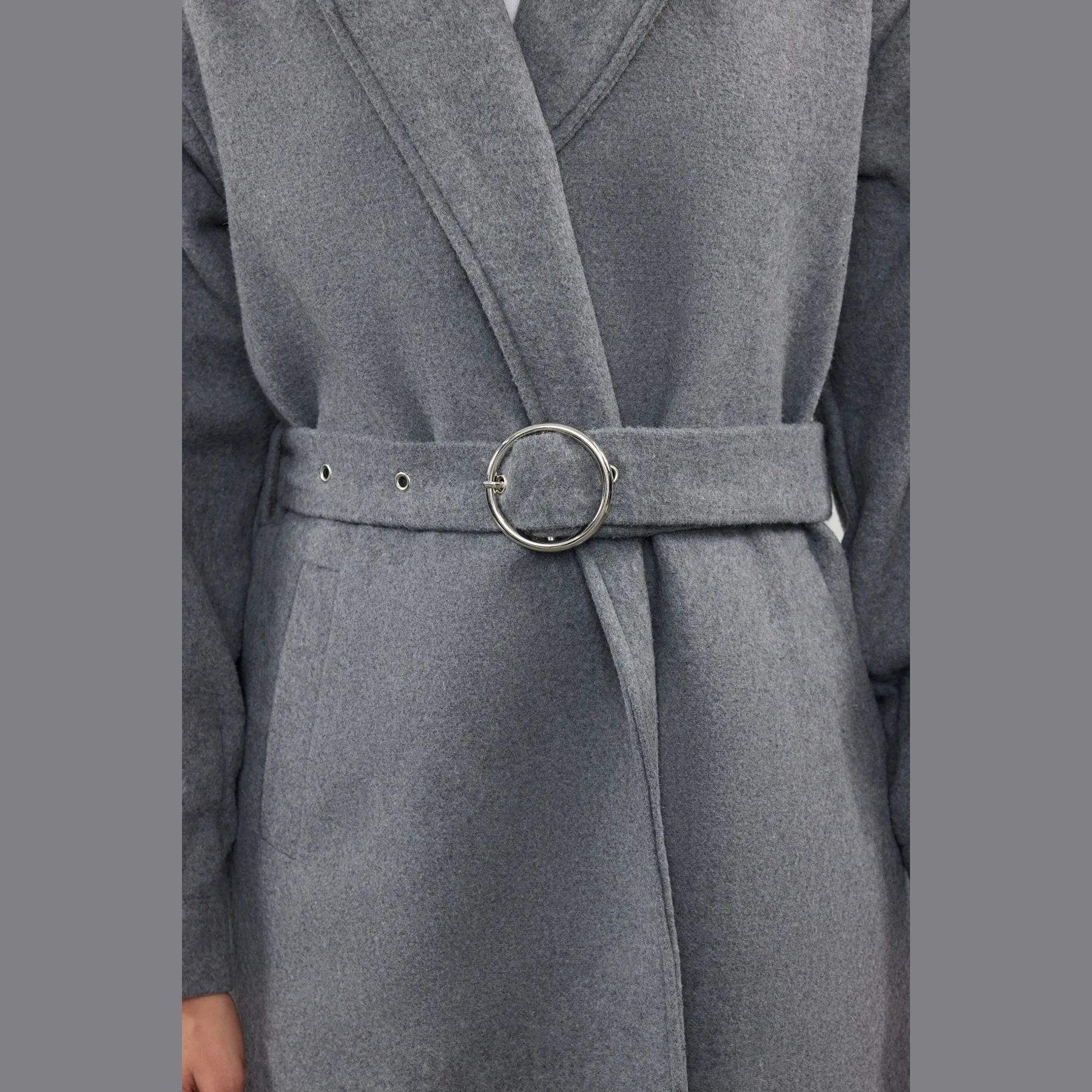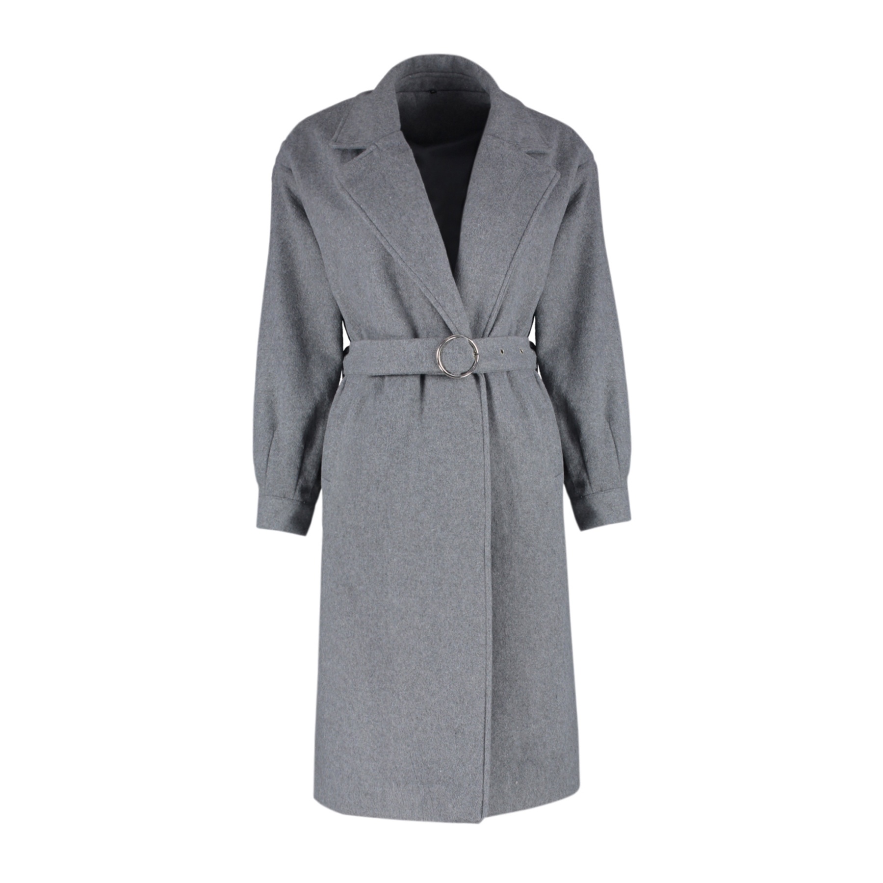 كاب نسائي – رمادي بتفاصيل إبزيم وحزام (قصة منتظمة، تصميم شتوي)