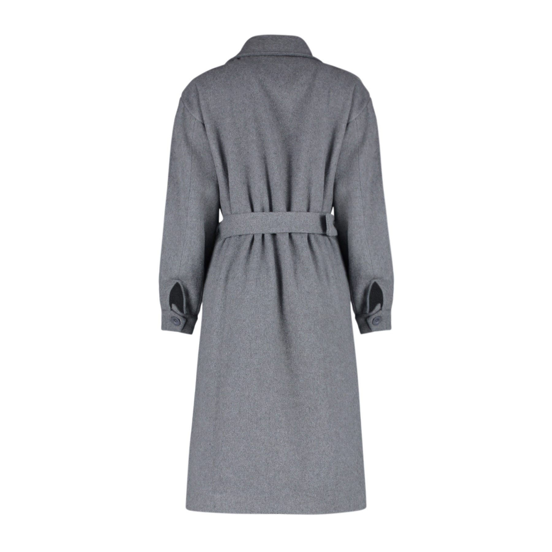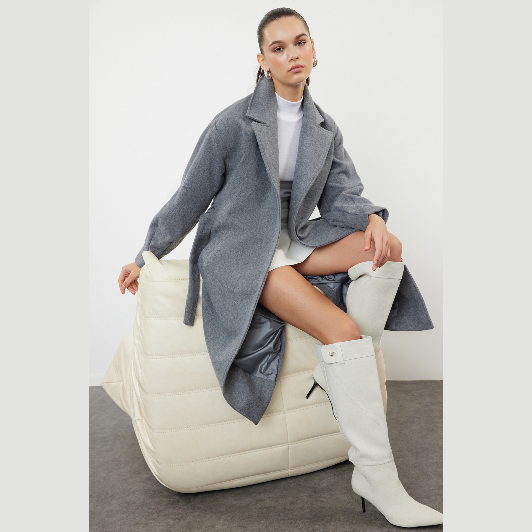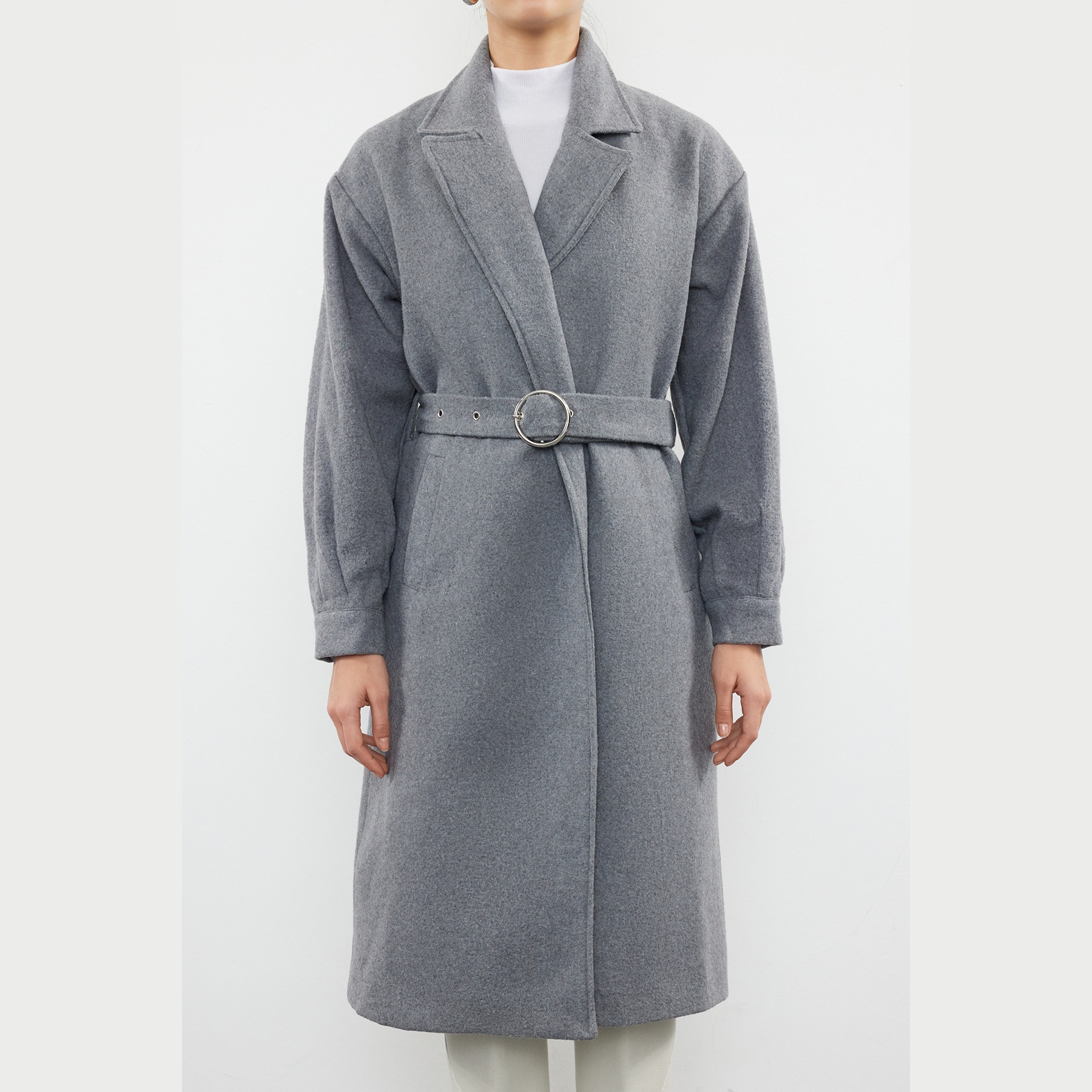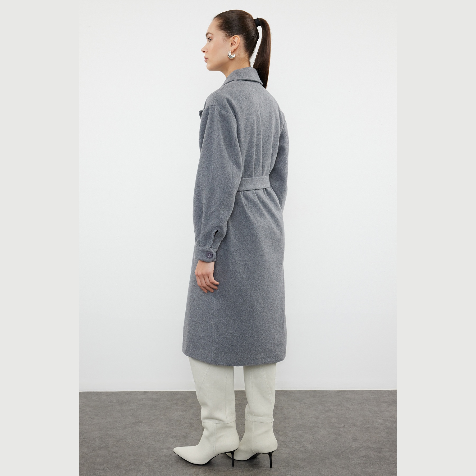 كاب نسائي – رمادي بتفاصيل إبزيم وحزام (قصة منتظمة، تصميم شتوي)