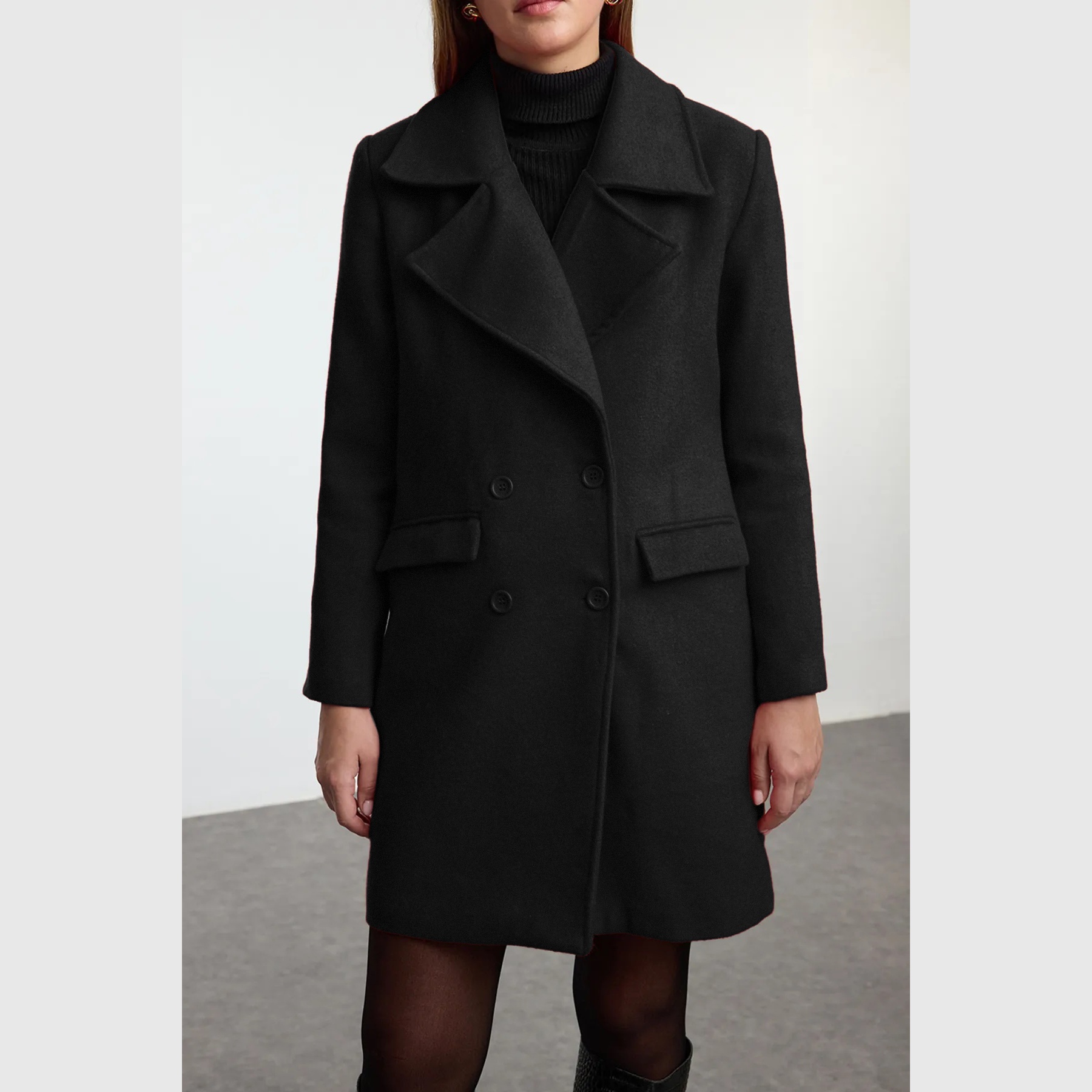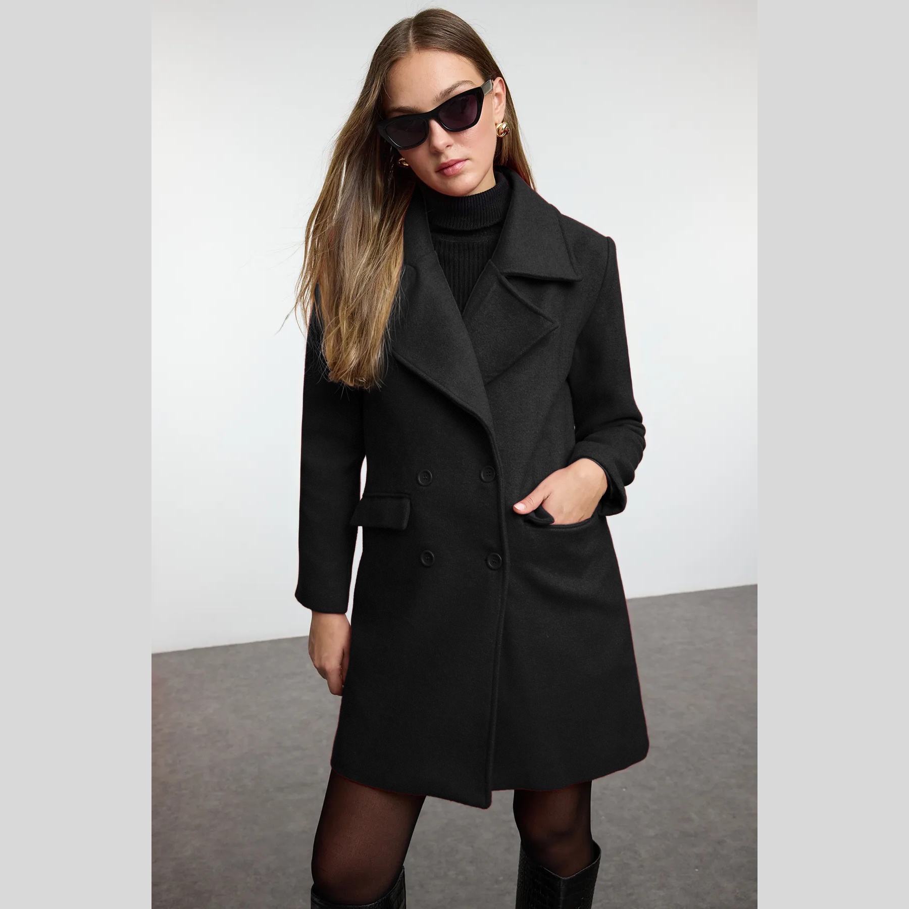 كاب شتوي أنيق بلون أسود كلاسيكي من مجموعة Trendyolmilla – لأناقة يومية دافئة بلمسة عملية، يتميز بقصة منتظمة (Regular Fit) وطول متوسط، مع ياقة كروڤاز مزدوجة، وأكمام طويلة، وإغلاق أمامي بأزرار، مصنوع من خامة كاشمير صوفي (Kaşe Dokuma) بتركيبة تشمل 66% بوليستر، 21% قطن، 8% فيسكوز، 5% بولياميد، ومبطن بالكامل، ما يجعله مثاليًا لأيام الشتاء الباردة.