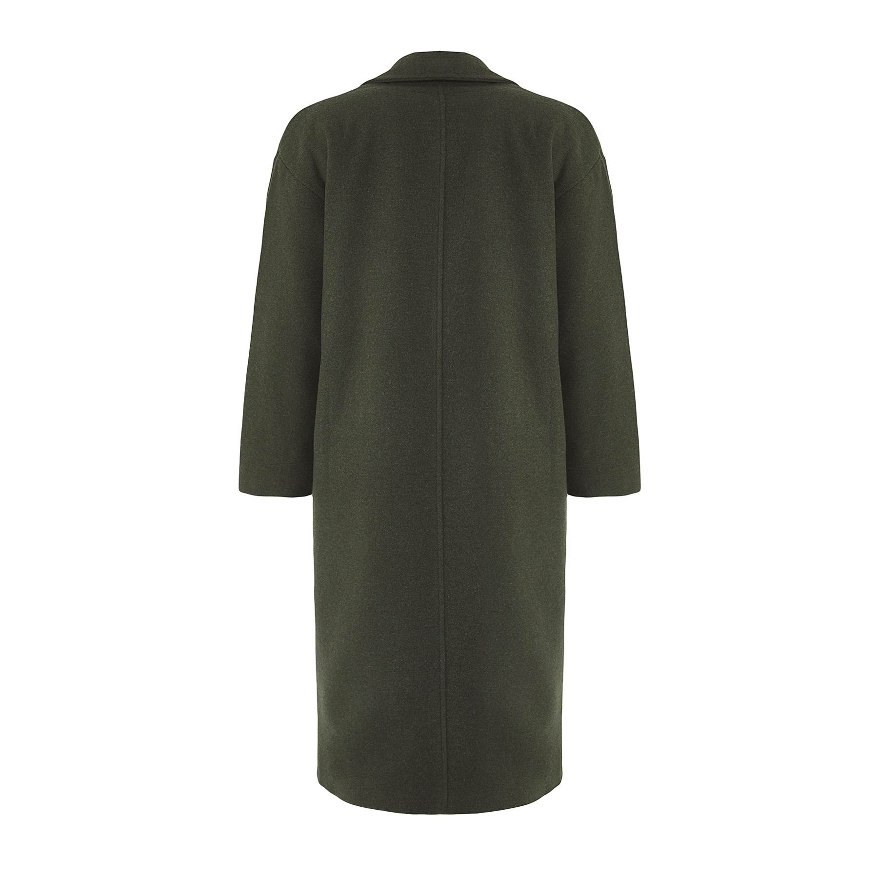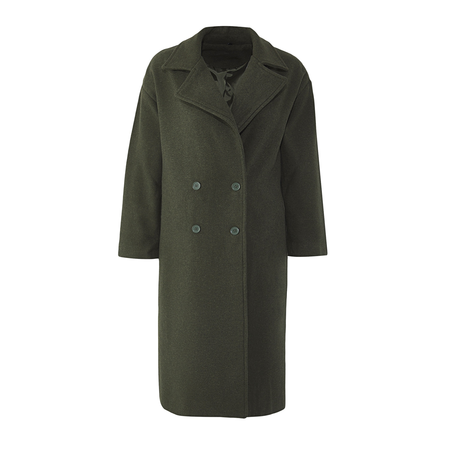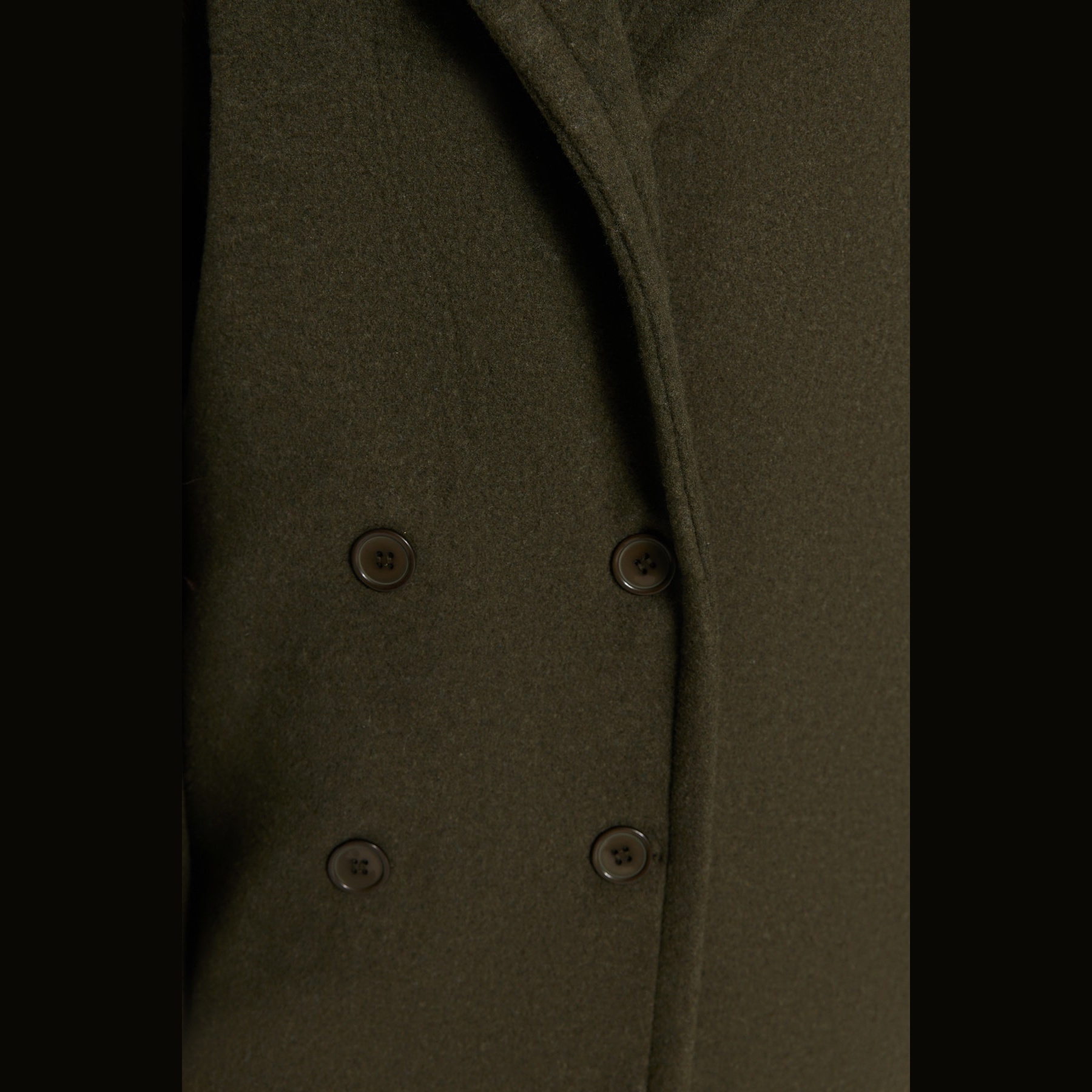 كاب نسائي – زيتي بقصة واسعة وطول كامل (قماش كاشمير صوفي، تصميم شتوي)