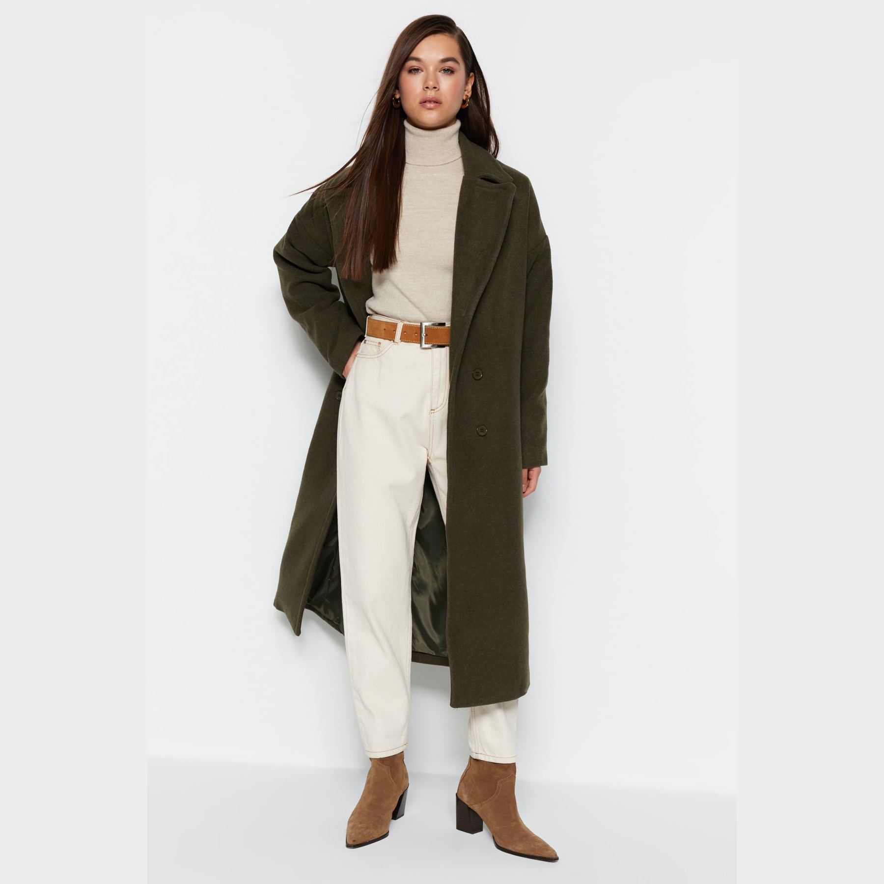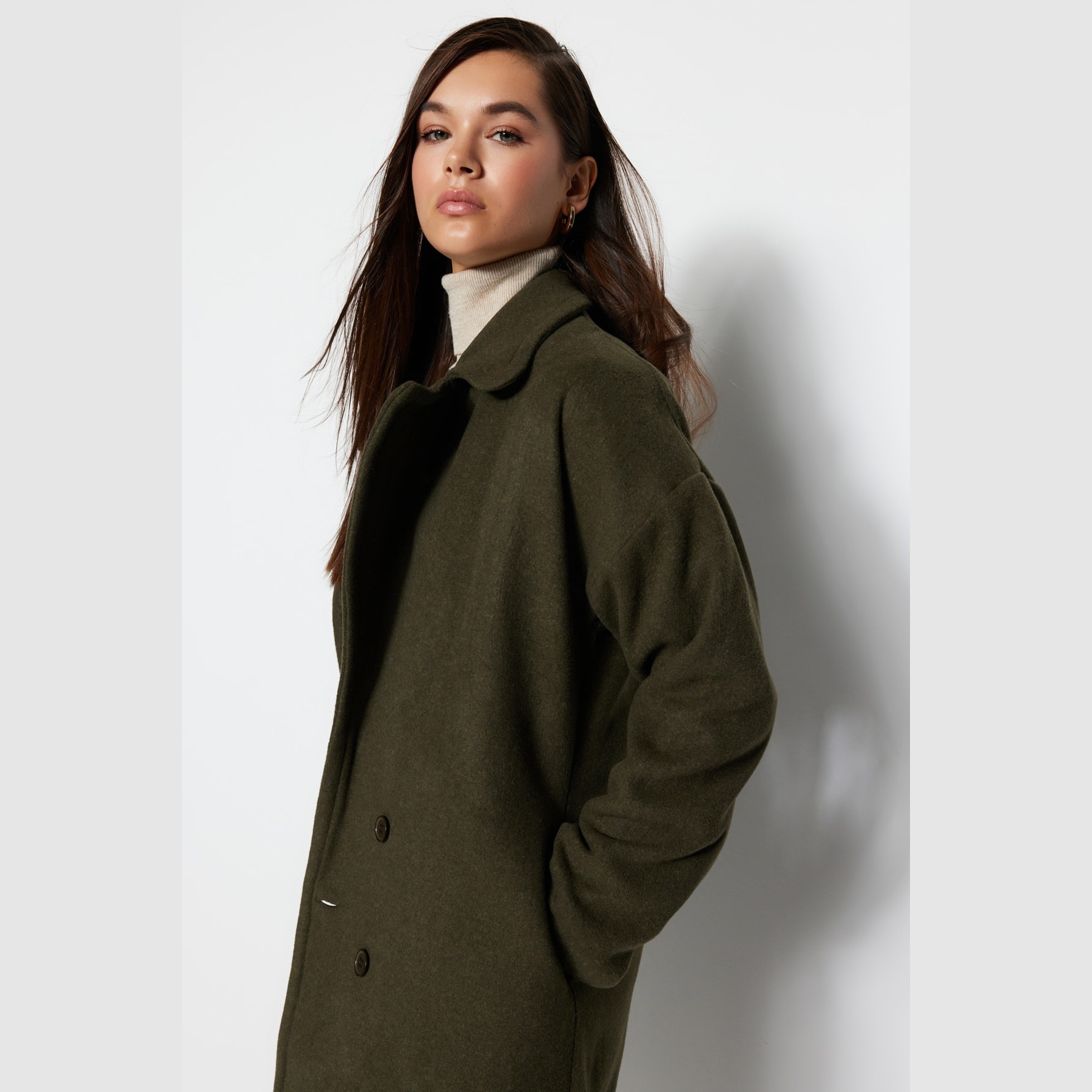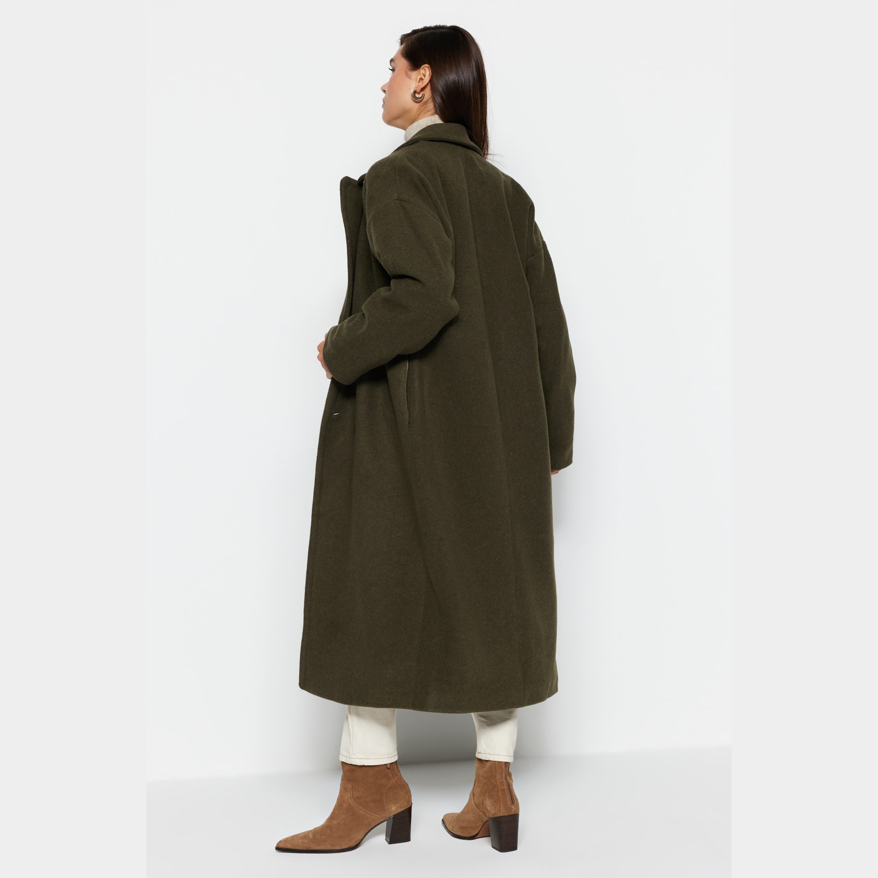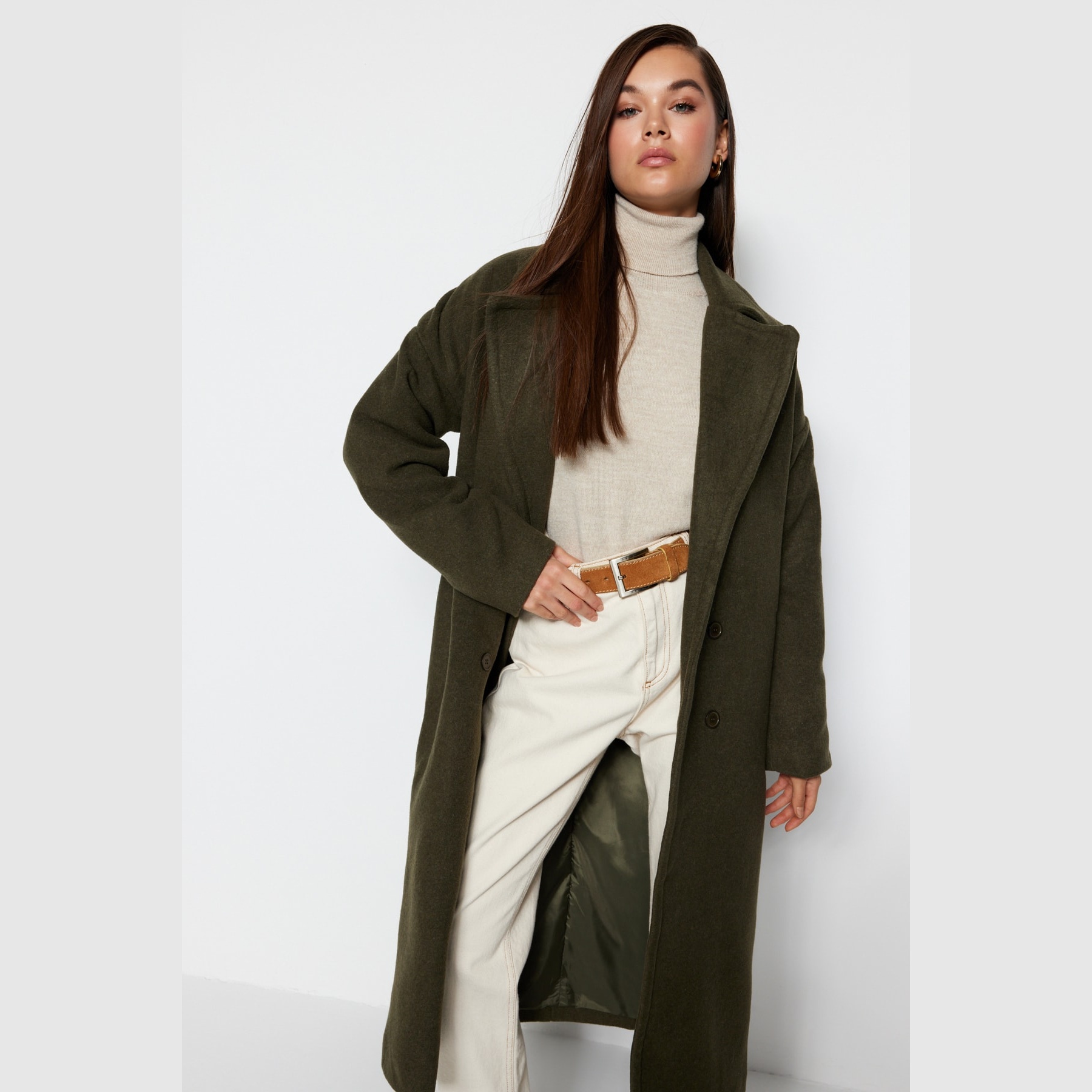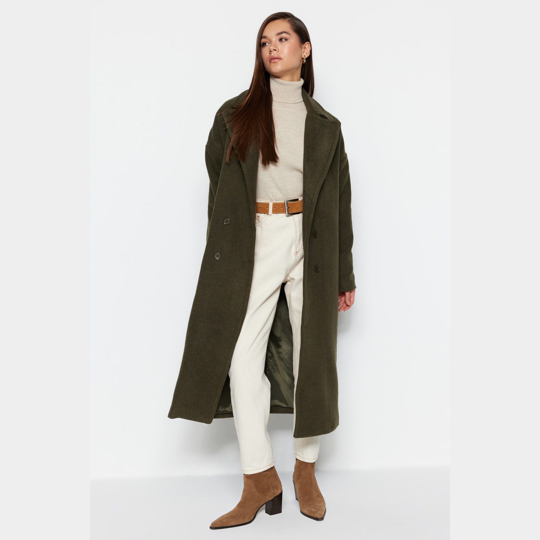 كاب شتوي أنيق بلون زيتي داكن (Haki) من مجموعة Trendyolmilla – لأناقة دافئة بلمسة كلاسيكية واسعة، يتميز بقصة Oversize واسعة وطويلة مع ياقة كروڤاز مزدوجة، وأكمام طويلة، وإغلاق أمامي بأزرار، مصنوع من خامة كاشمير صوفي (Kaşe Dokuma) بتركيبة غنية تشمل 62% بوليستر، 19% أكريليك، 13% صوف، 3% قطن، 3% فيسكوز، ومبطن بالكامل، ما يجعله مثاليًا لأيام الشتاء الباردة.