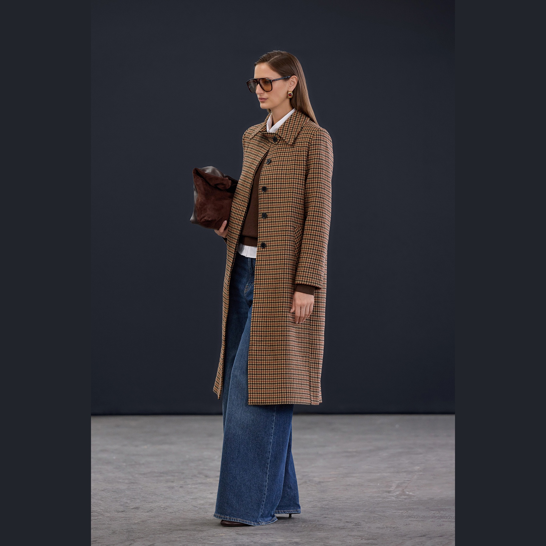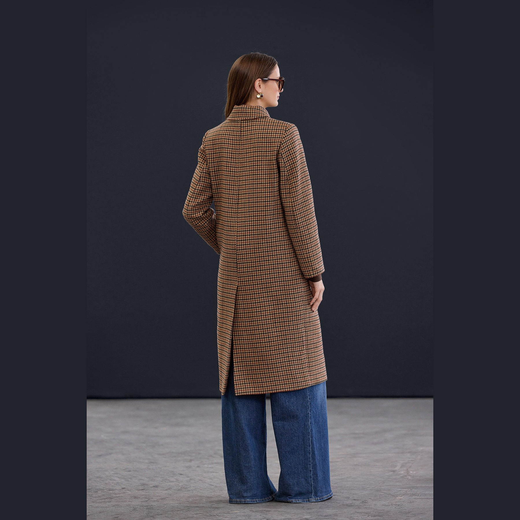 كاب نسائي – بيج بنقشة كازاياقي وقصة منتظمة (قماش كاشمير صوفي، تصميم شتوي)