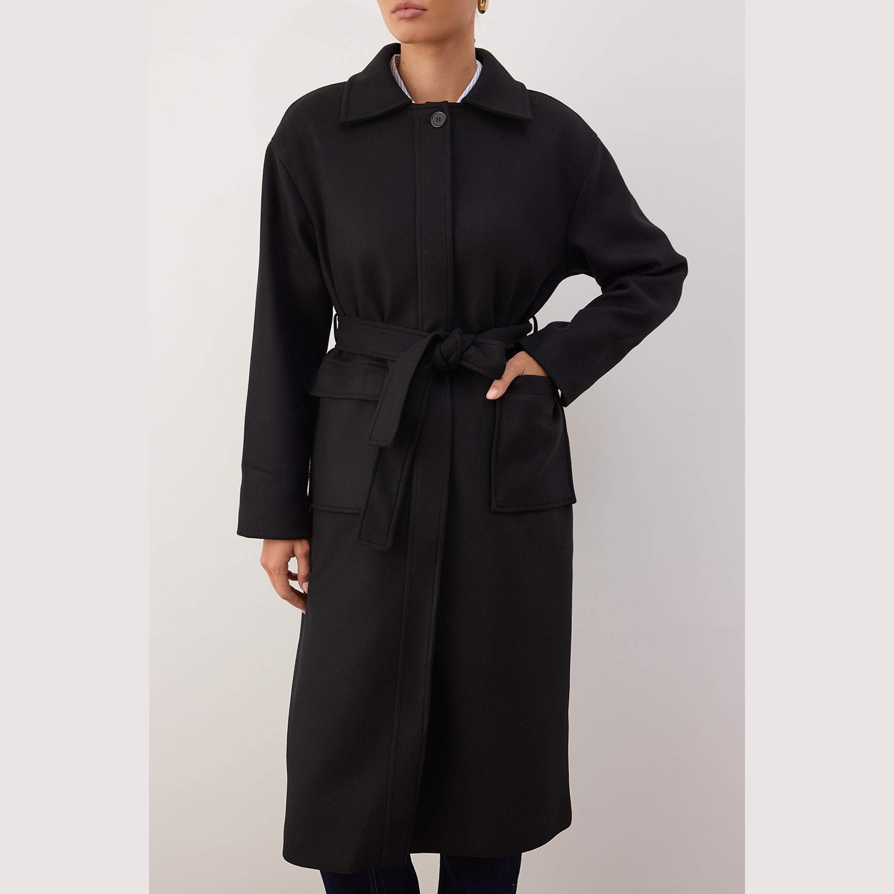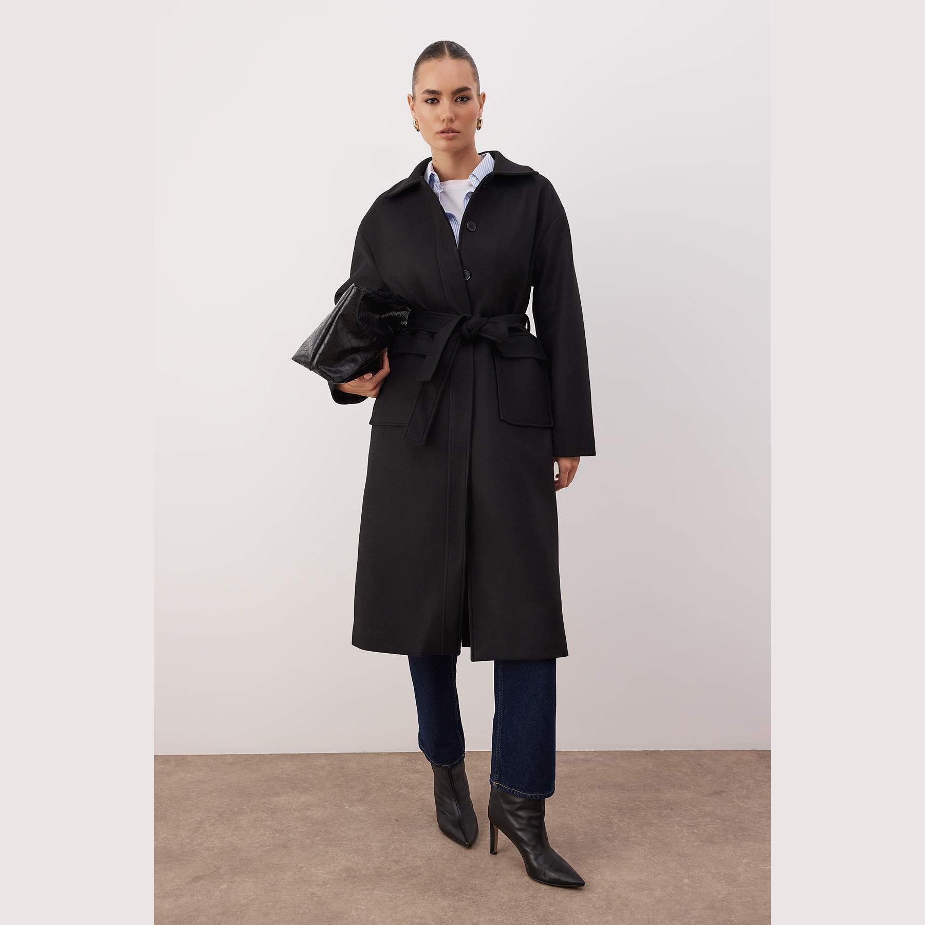 كاب نسائي – أسود بتفاصيل جيوب وحزام خصر (قصة واسعة وطول كامل)
