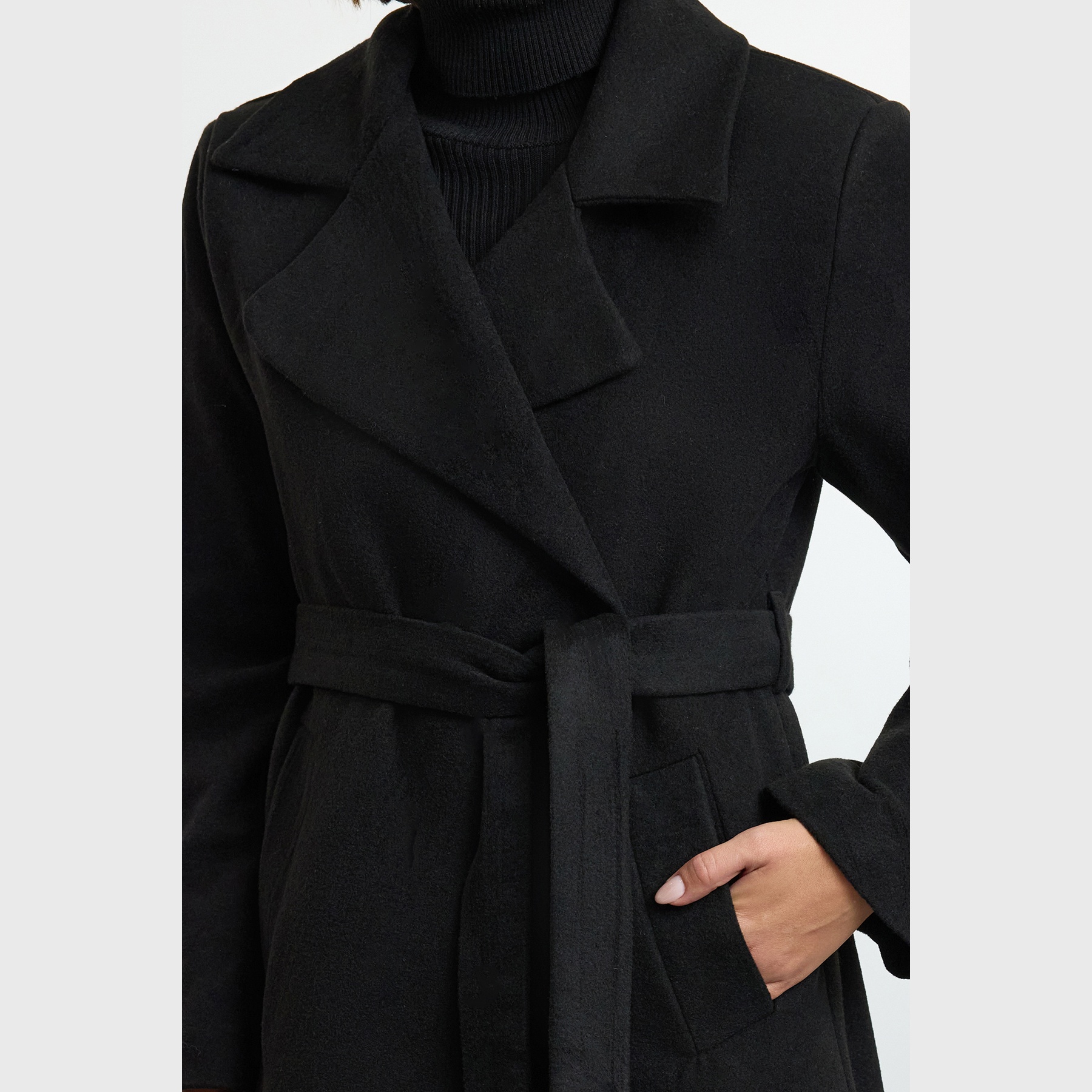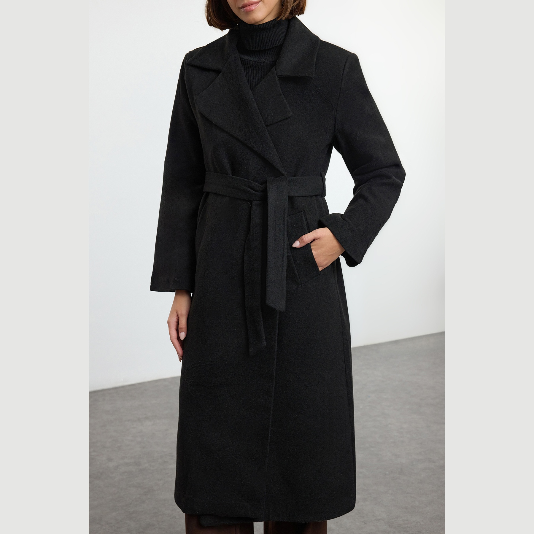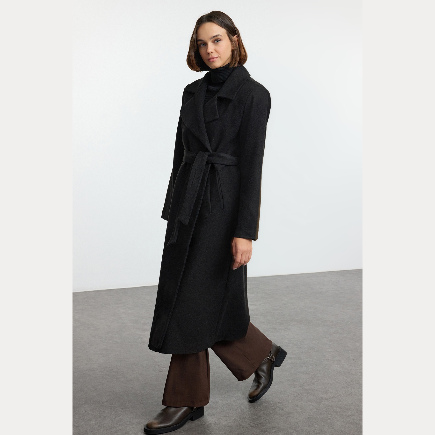 كاب نسائي – أسود بحزام وقصة ماكسي بستايل باردوس (تصميم شتوي أنيق)