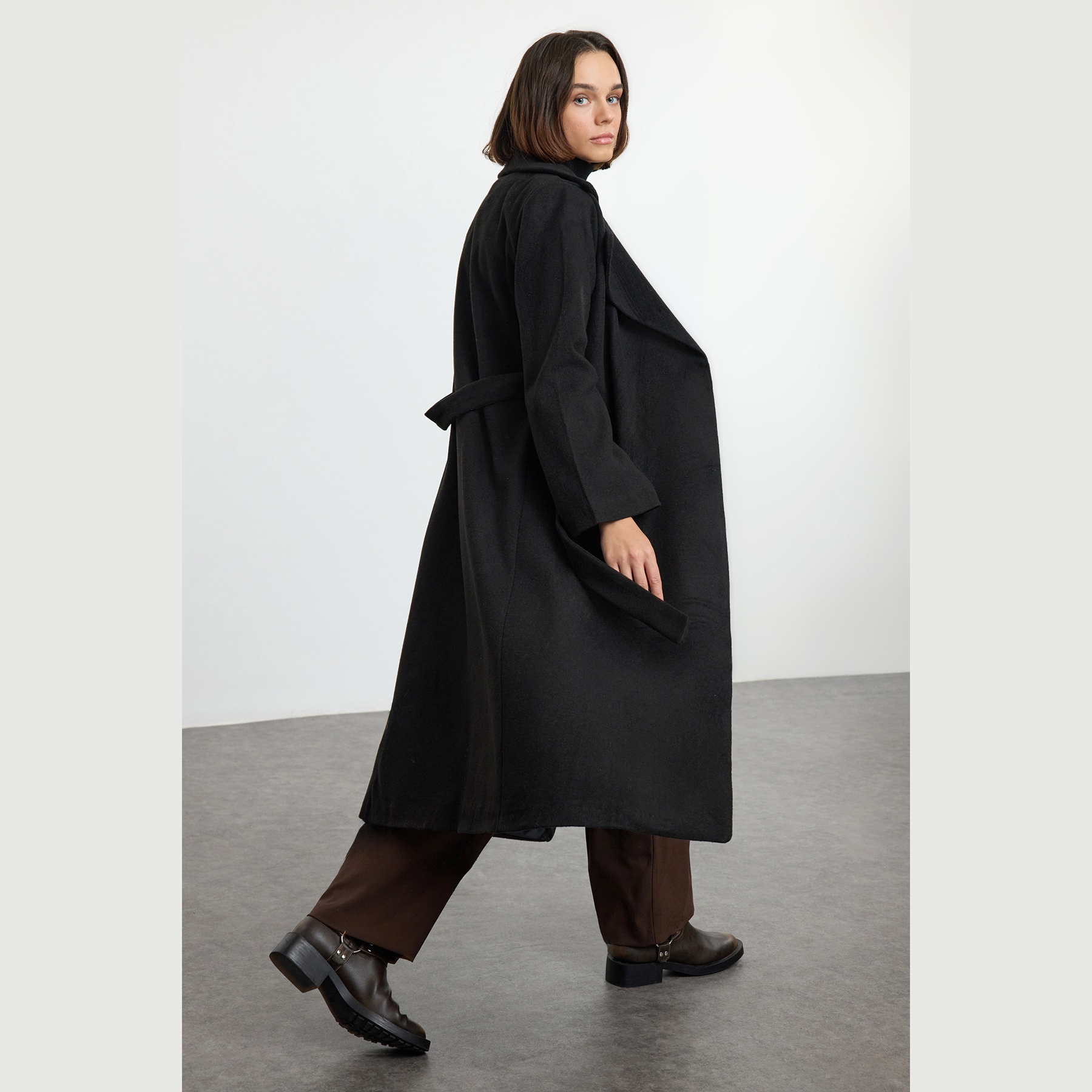 كاب شتوي أنيق بلون أسود كلاسيكي من مجموعة Trendyolmilla – لأناقة شتوية فاخرة بلمسة باردوس أنثوية، يتميز بقصة منتظمة (Regular Fit) وطول ماكسي، مع ياقة كروڤاز مزدوجة، وأكمام طويلة، وإغلاق أمامي مزدوج، بالإضافة إلى حزام خصر قابل للتعديل يمنحك تحكمًا بالشكل، مصنوع من خامة كاشمير صوفي (Kaşe Dokuma) بتركيبة غنية تشمل 36% بوليستر، 23% أكريليك، 18% قطن، 13% صوف، 6% فيسكوز، 4% بولياميد، ومبطن بالكامل، ما يجعله مثاليًا لأيام الشتاء الباردة.