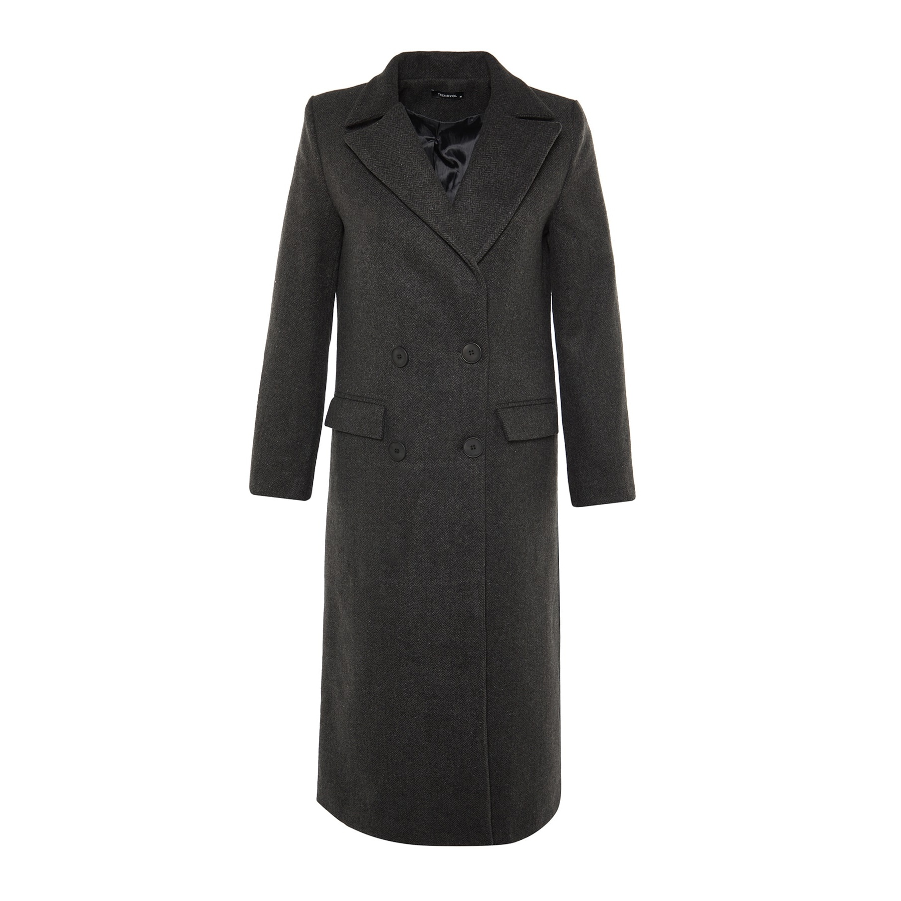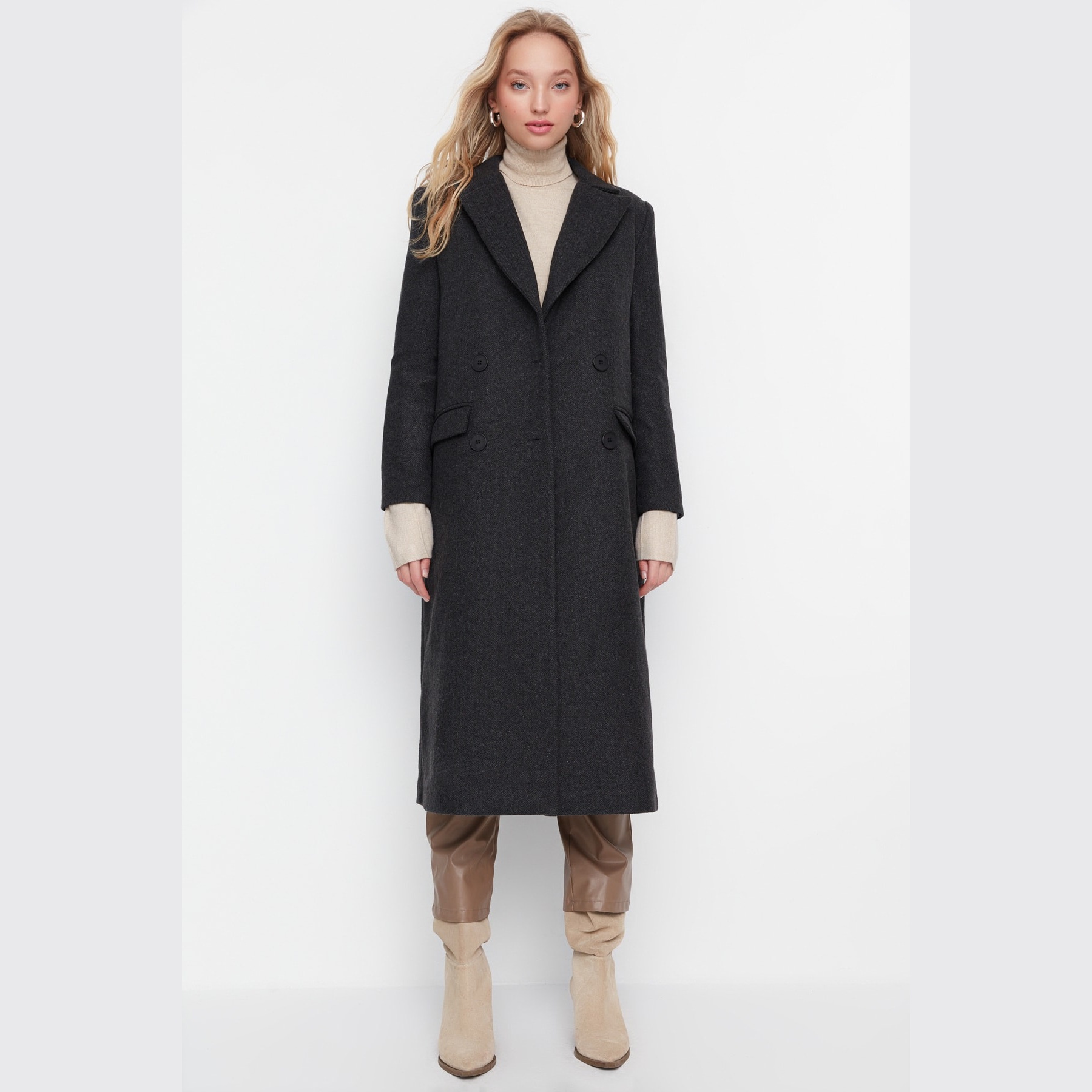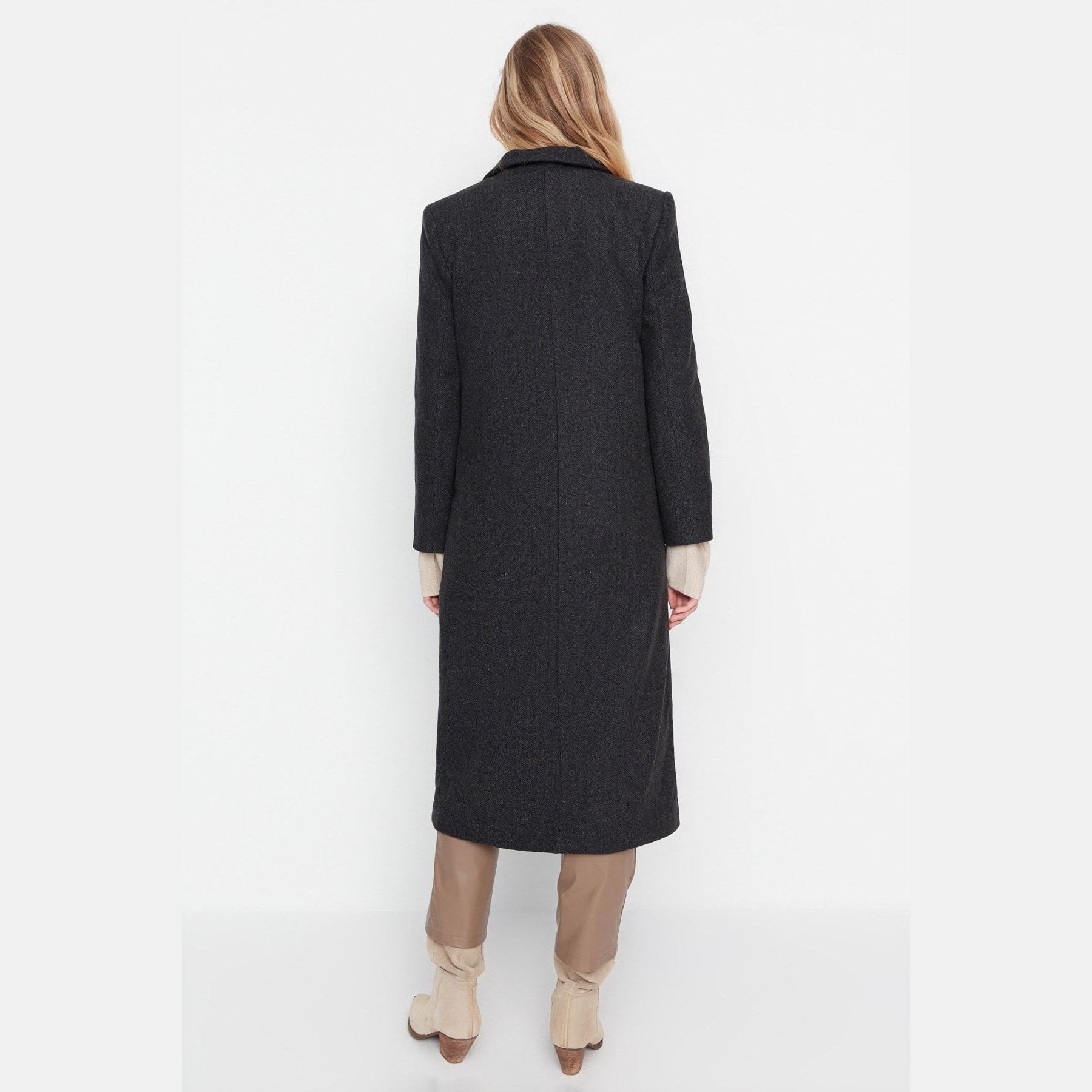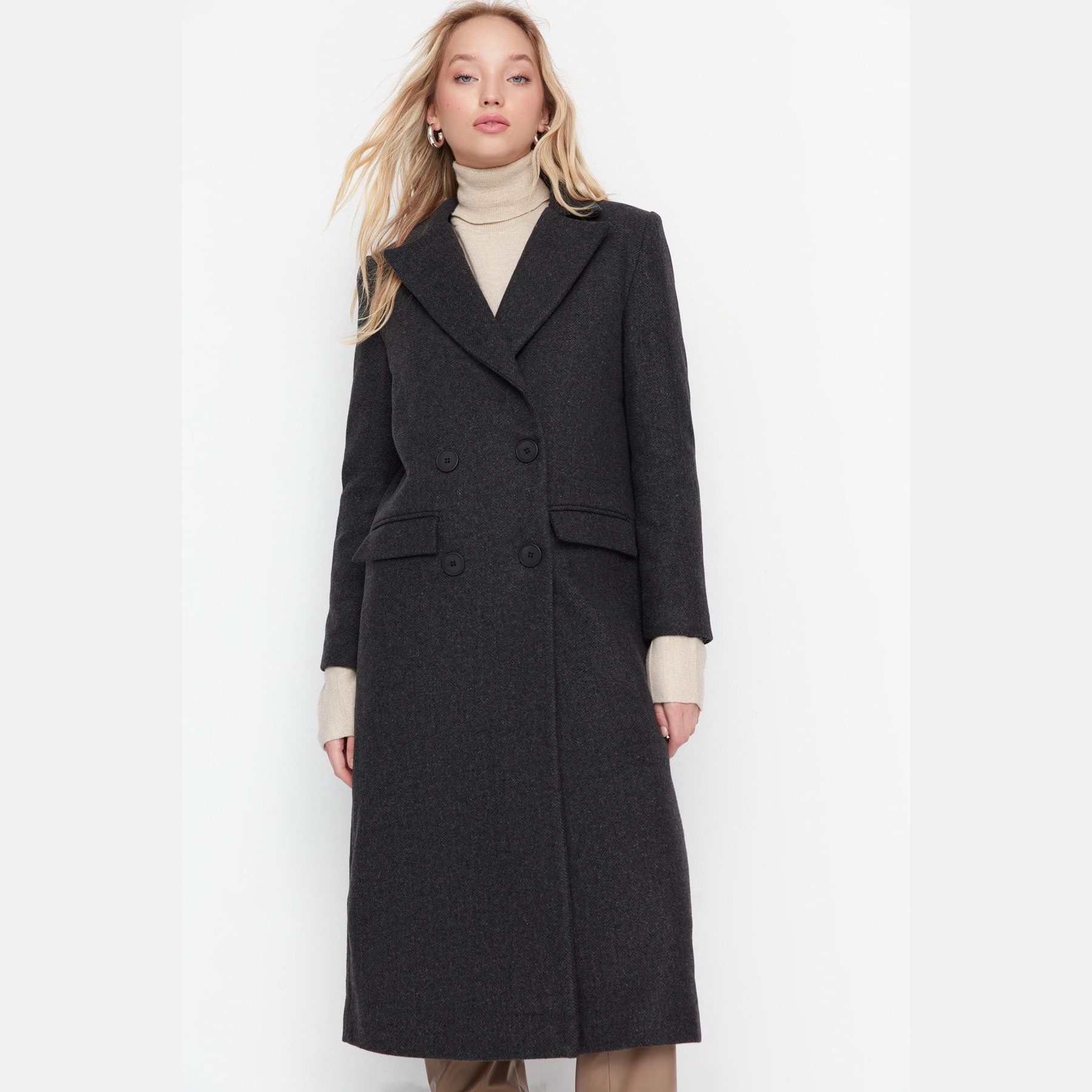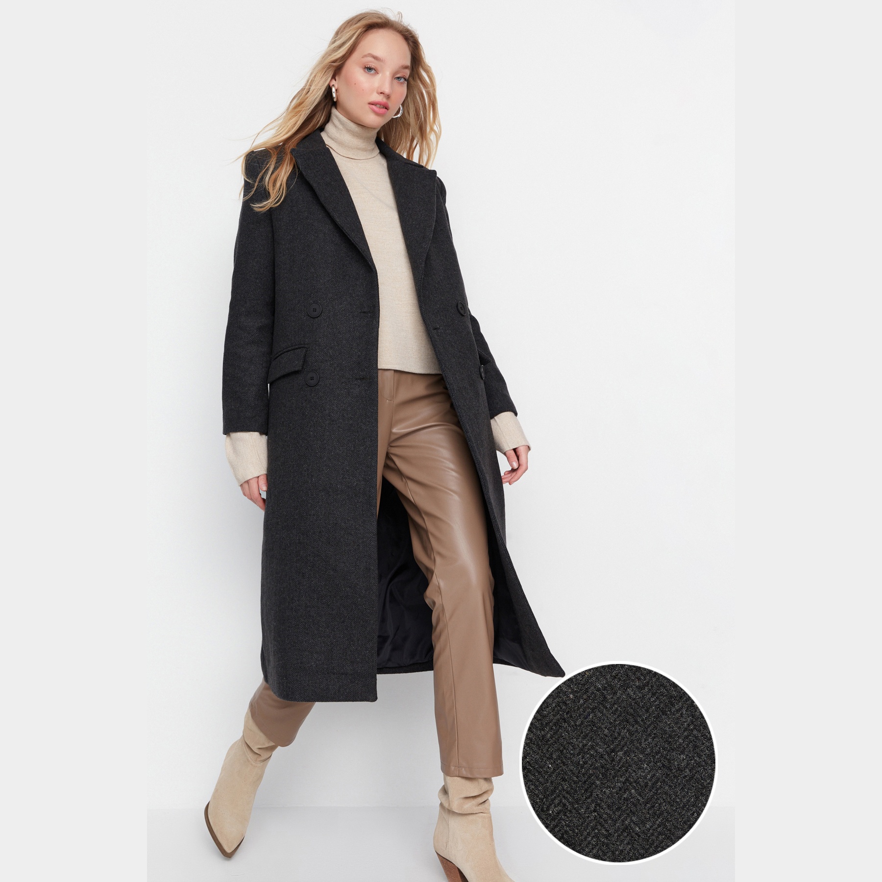 كاب شتوي أنيق بلون أسود بنقشة Balıksırtı (عظم السمكة) من مجموعة Trendyolmilla – لأناقة شتوية بلمسة تراثية أنيقة، يتميز بقصة منتظمة (Regular Fit) وطول عملي، مع ياقة كروڤاز مزدوجة، وأكمام طويلة، وإغلاق أمامي مزدوج، مصنوع من خامة كاشمير صوفي (Kaşe Dokuma) بتركيبة متوازنة تشمل 66% بوليستر، 21% قطن، 8% فيسكوز، 5% بولياميد، ومبطن بالكامل، ما يجعله مثاليًا لأيام الشتاء الباردة.