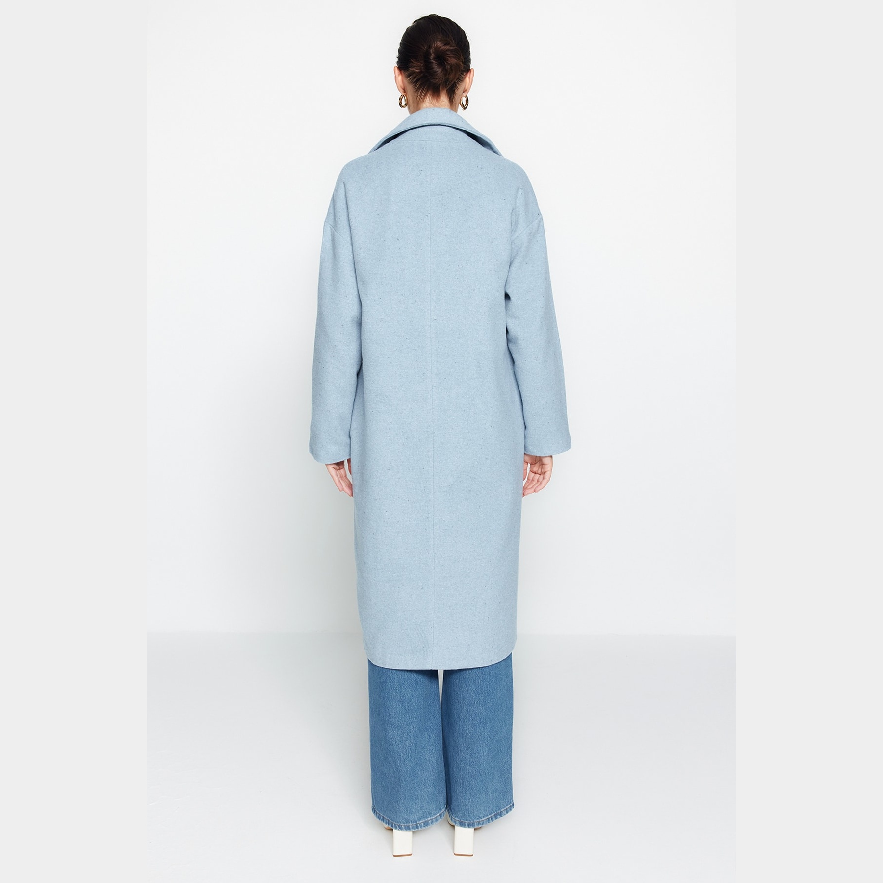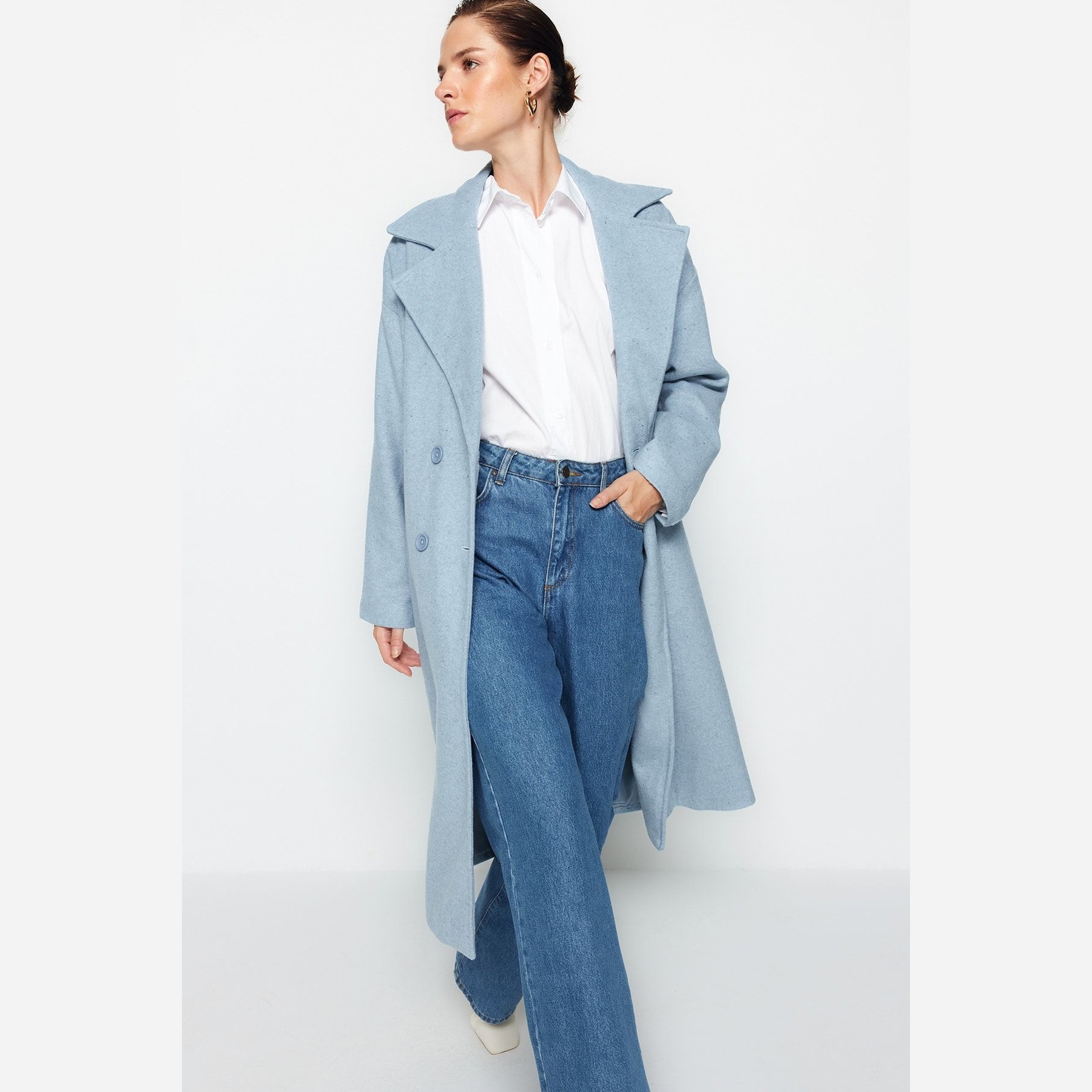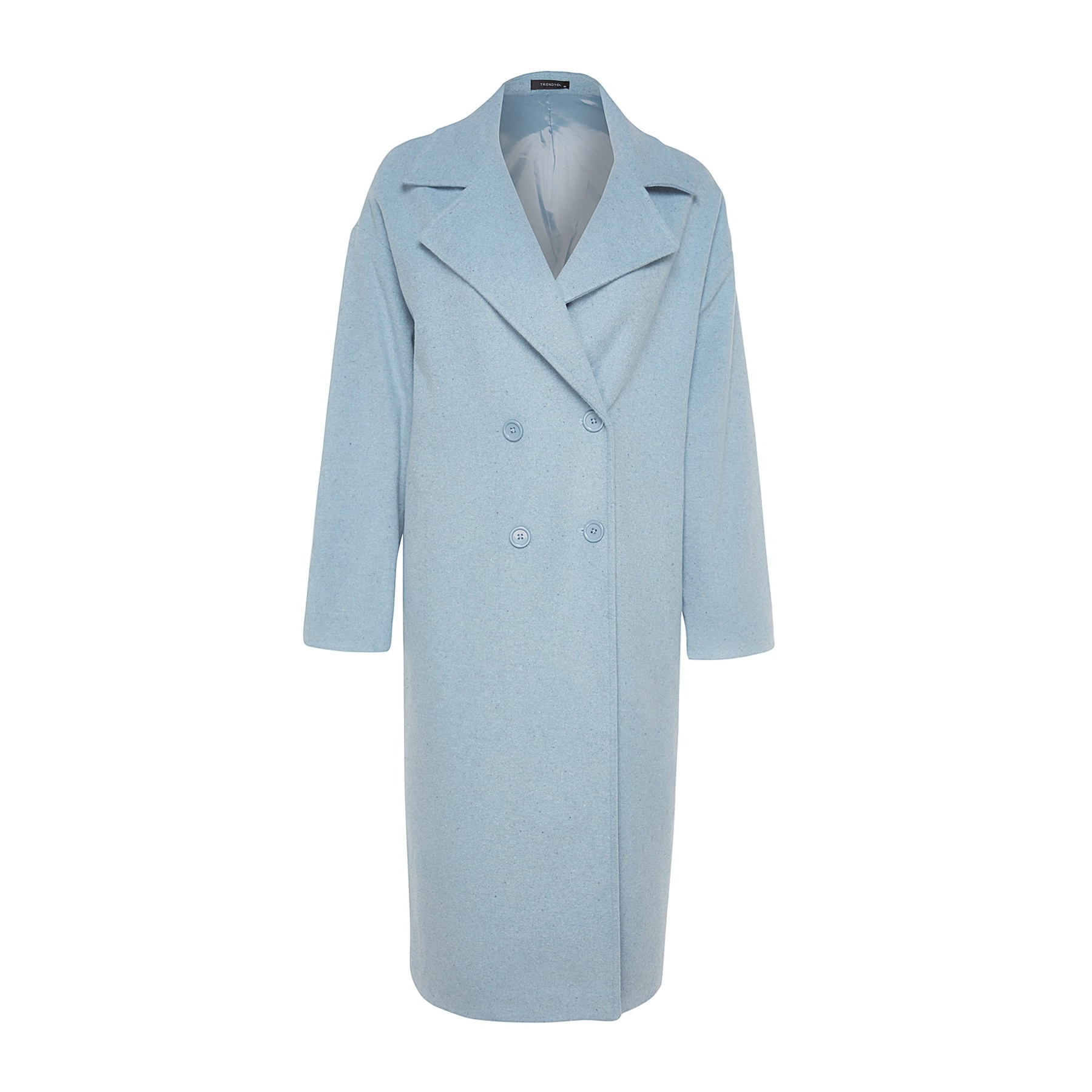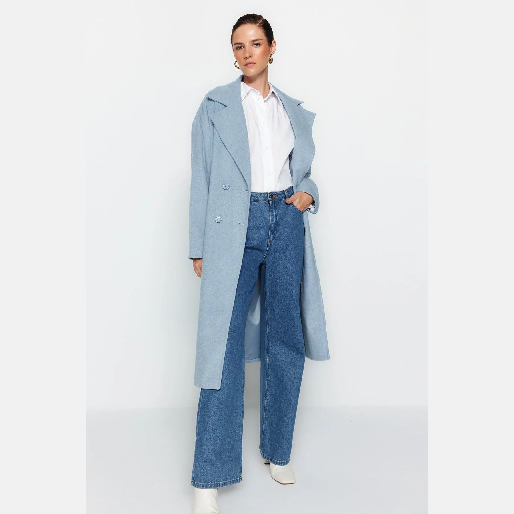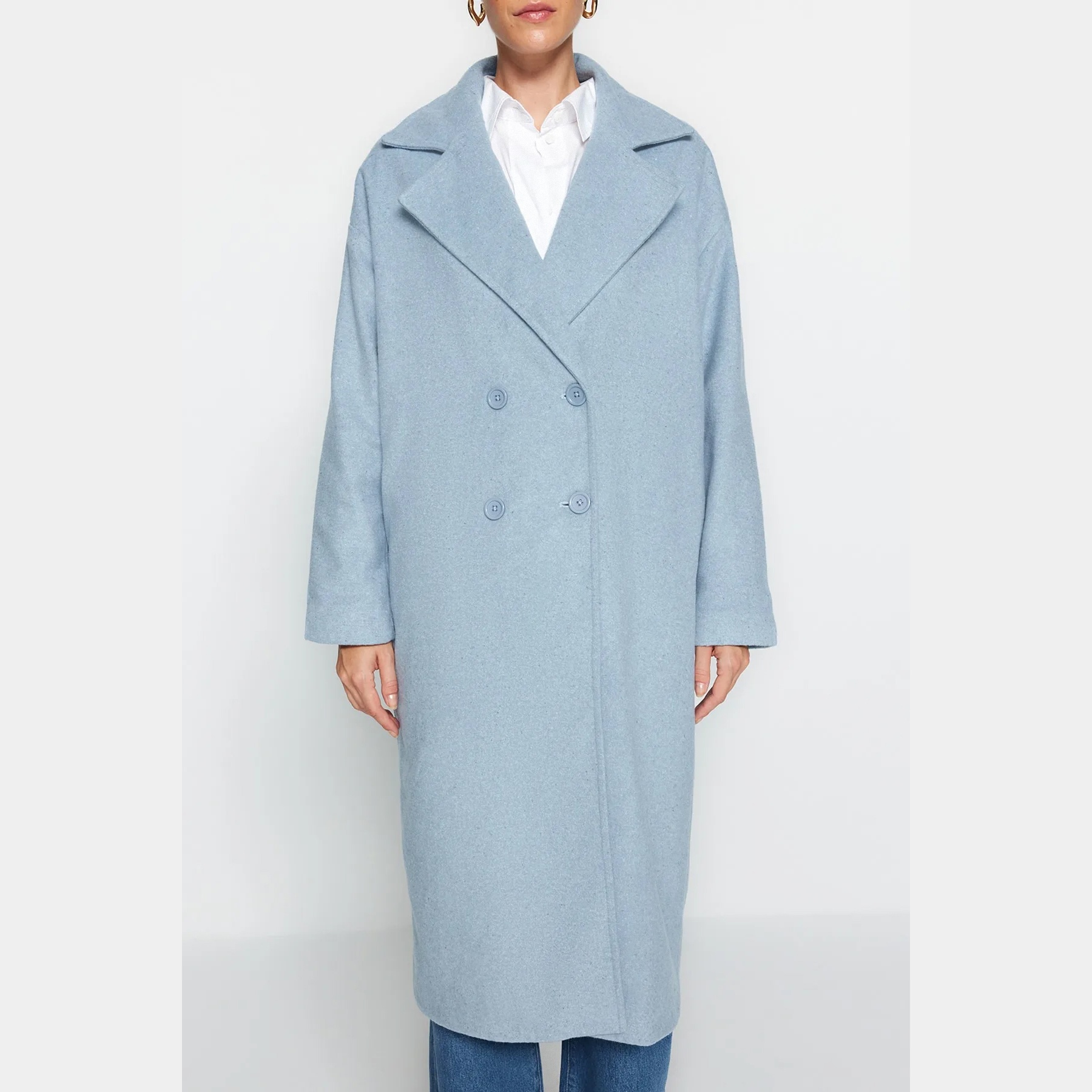 كاب شتوي أنيق بلون أزرق سماوي ناعم من مجموعة Trendyolmilla – لأناقة شتوية بلمسة كلاسيكية واسعة، يتميز بقصة Oversize واسعة وطويلة مع ياقة كروڤاز مزدوجة، وأكمام طويلة، وإغلاق أمامي مزدوج، مصنوع من خامة كاشمير صوفي (Kaşe Dokuma) بتركيبة غنية تشمل 62% بوليستر، 19% أكريليك، 13% صوف، 3% قطن، 3% فيسكوز، ومبطن بالكامل، ما يجعله مثاليًا لأيام الشتاء الباردة.