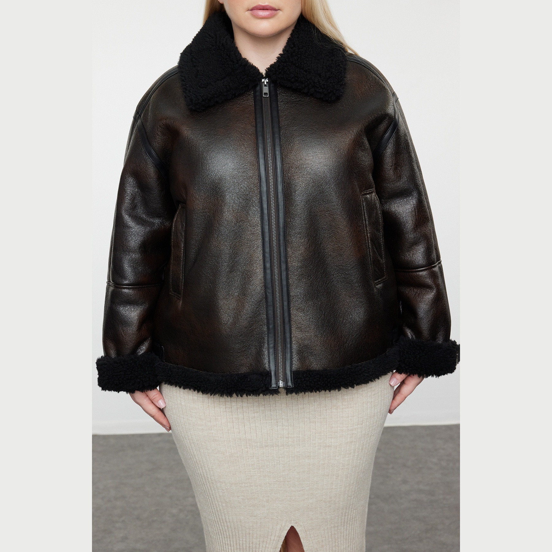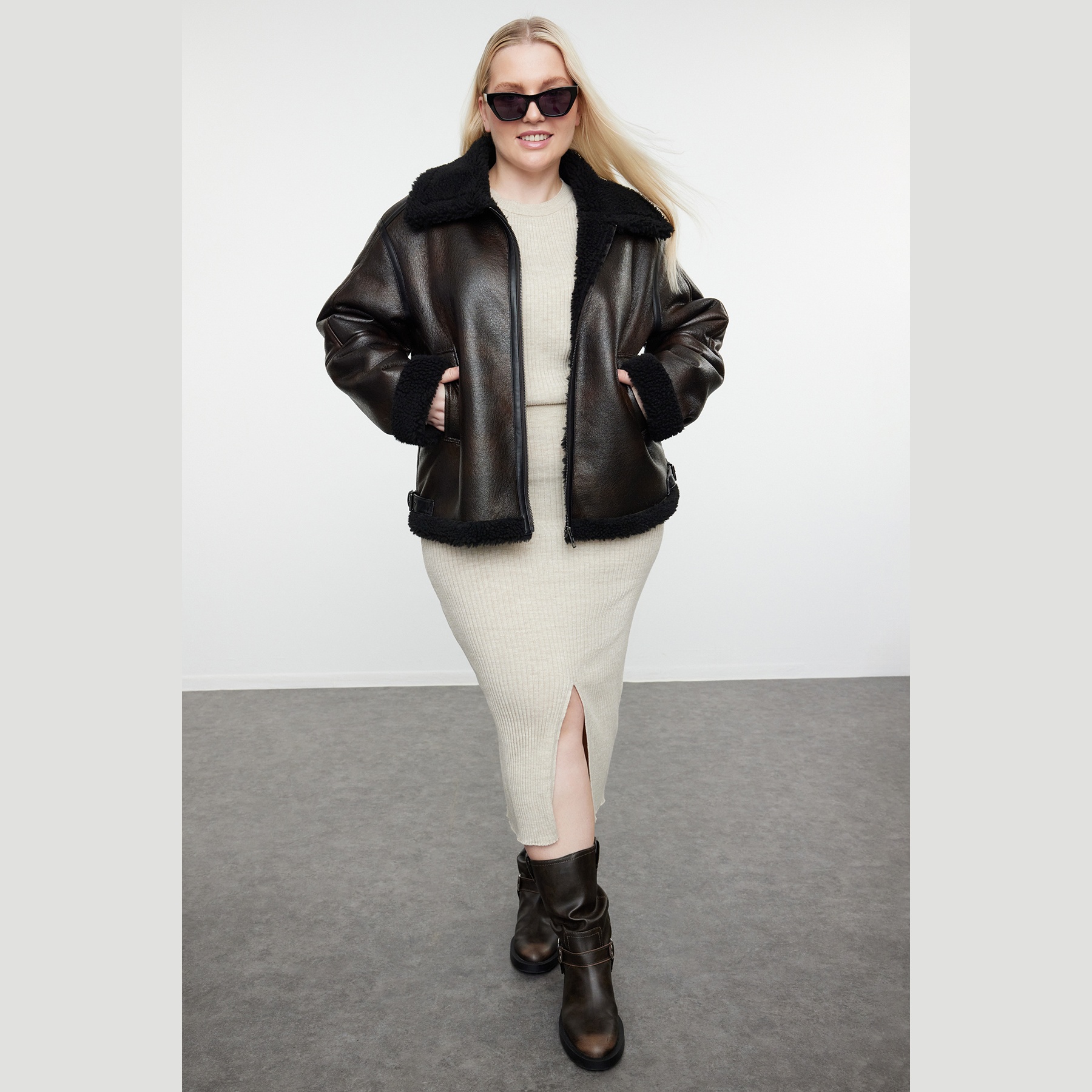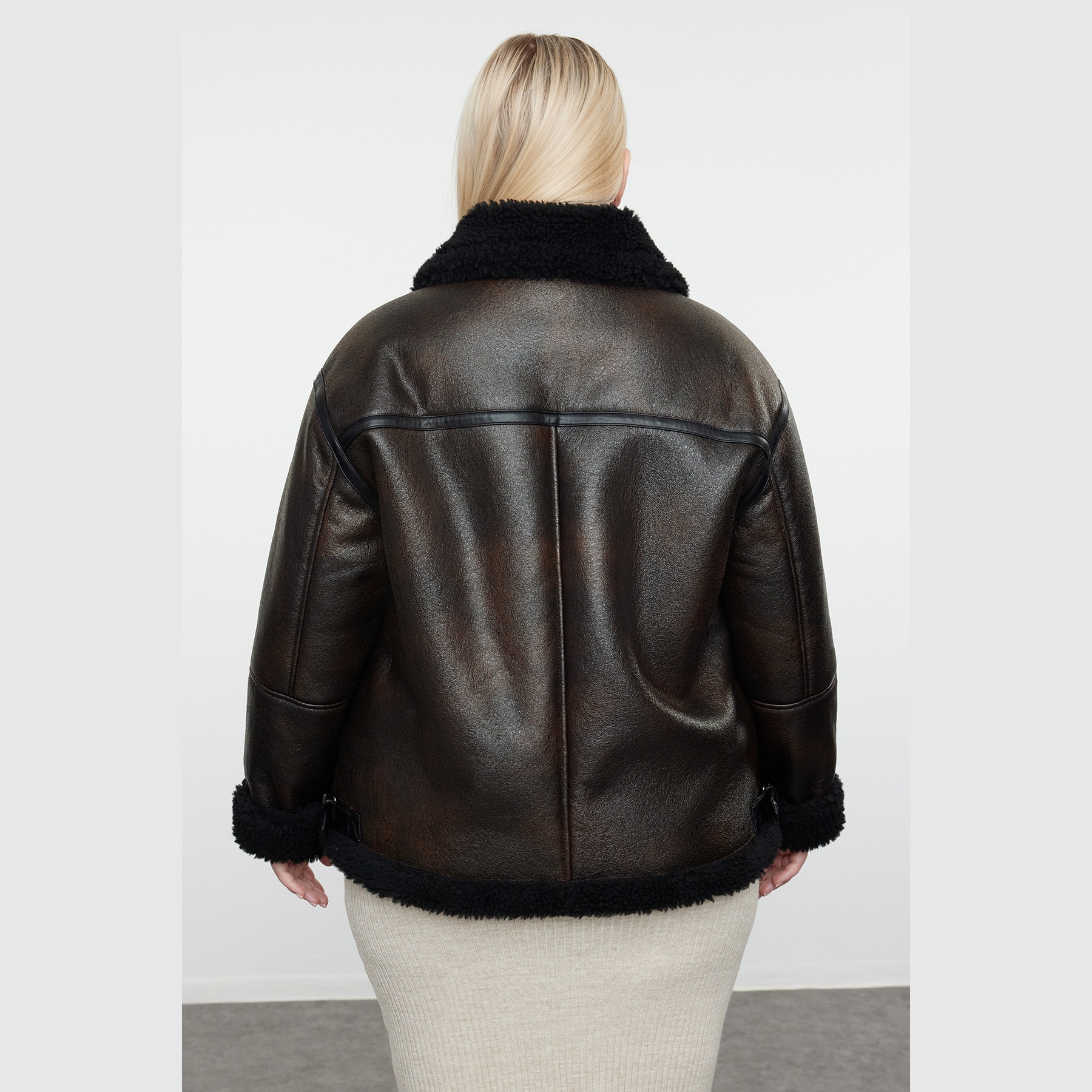 جاكيت شتوي بلون بني دافئ من مجموعة Trendyolmilla Curve – تصميم مخصص للمقاسات الكبيرة بستايل Biker العصري، يتميز بقصة واسعة (Oversize Fit) بطول منتظم، مع ياقة قميص كلاسيكية مزيّنة ببيلوش صناعي ناعم، وأكمام طويلة، وإغلاق أمامي بسحاب، مصنوع من خامة جلد صناعي منسوج بتركيبة 100% بوليستر، غير مبطّن داخليًا، ما يجعله مثاليًا للإطلالات الشتوية اليومية.
