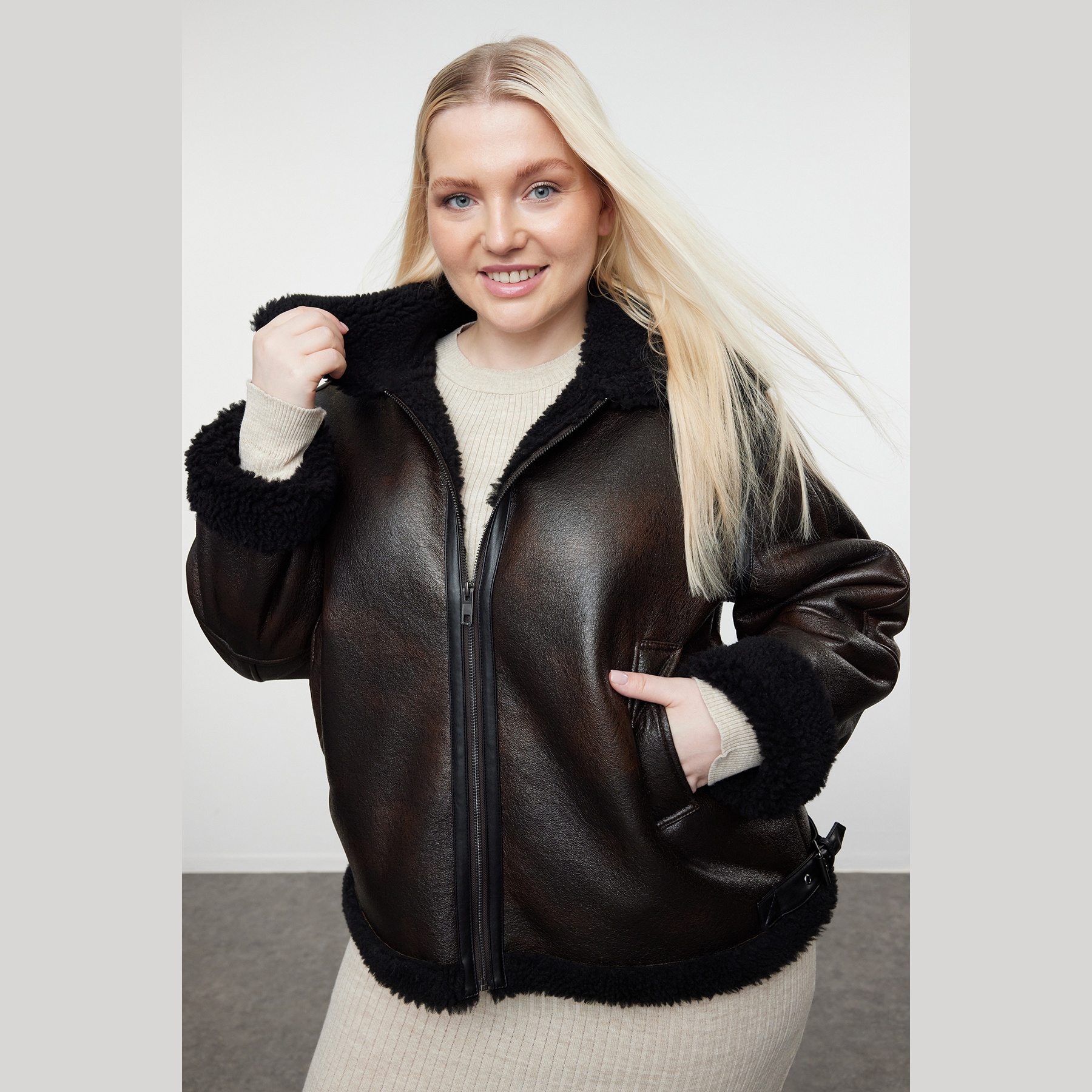 جاكيت نسائي بلس سايز – بني بقصة واسعة وتفاصيل بيلوش بستايل Biker (تصميم عملي وأنيق لفصل الشتاء)