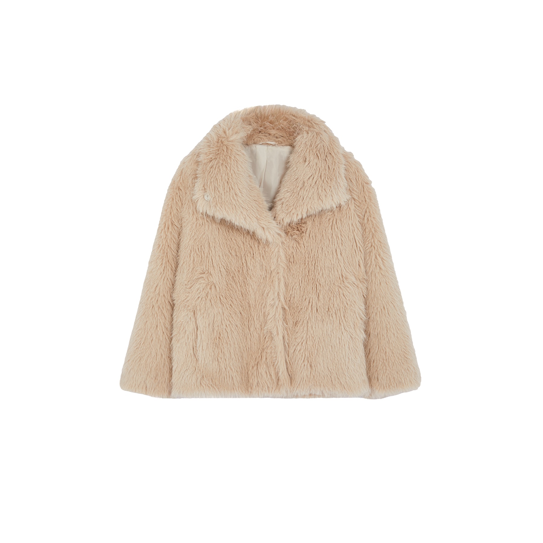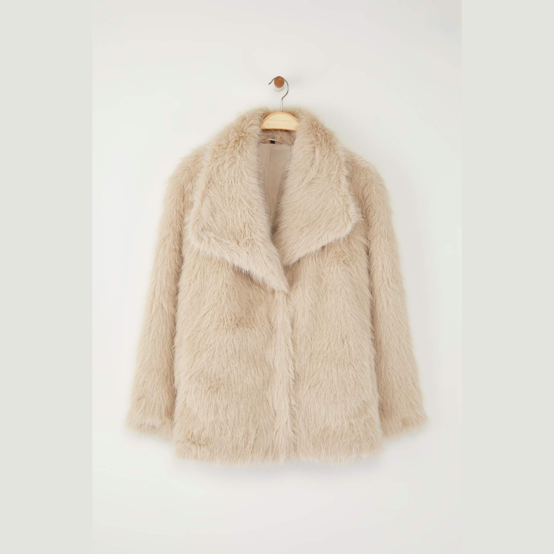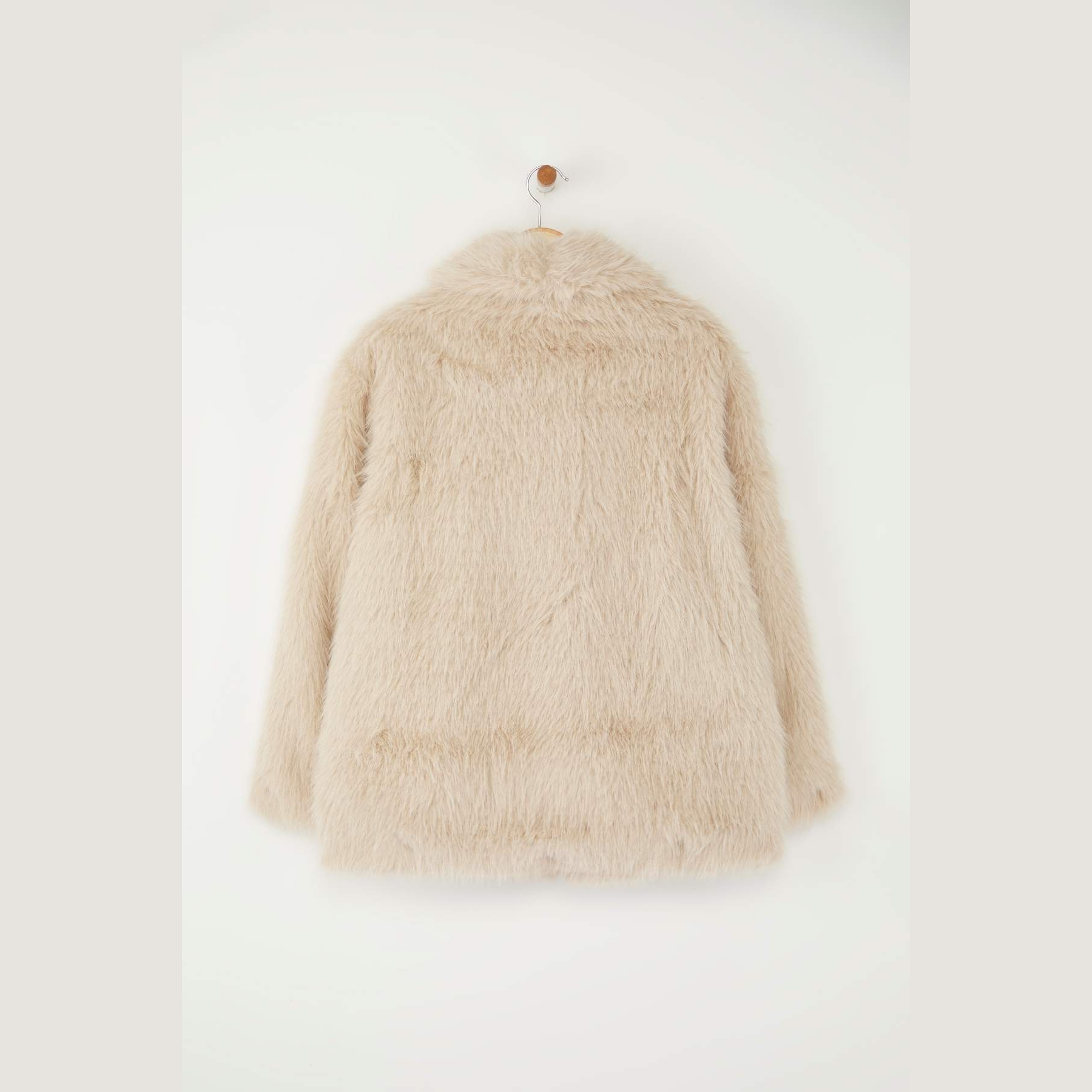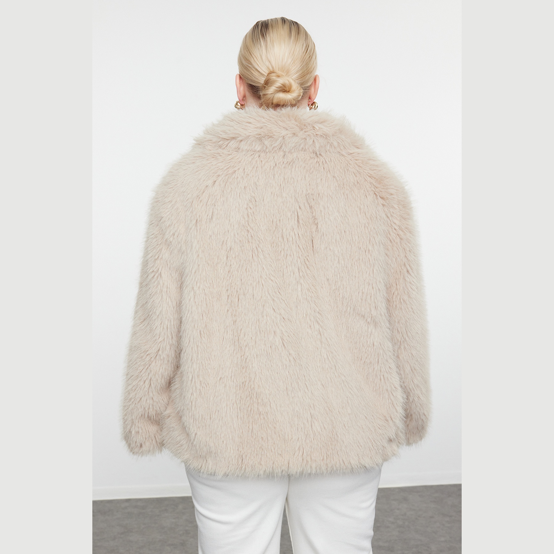 جاكيت نسائي كبير الحجم – بيج بقصة منتظمة من خامة فرو صناعي (دفء وأناقة في تصميم عملي)