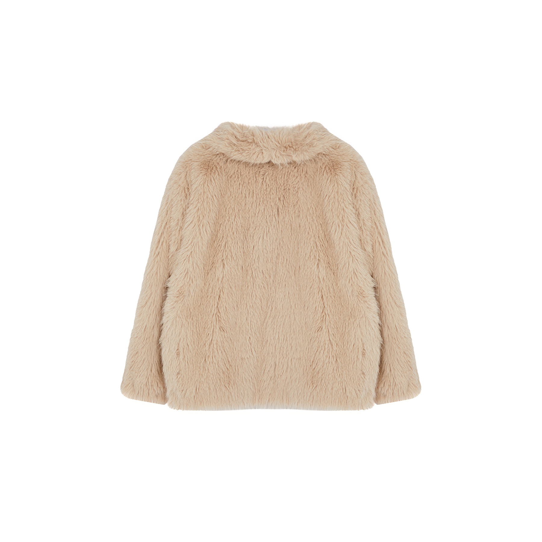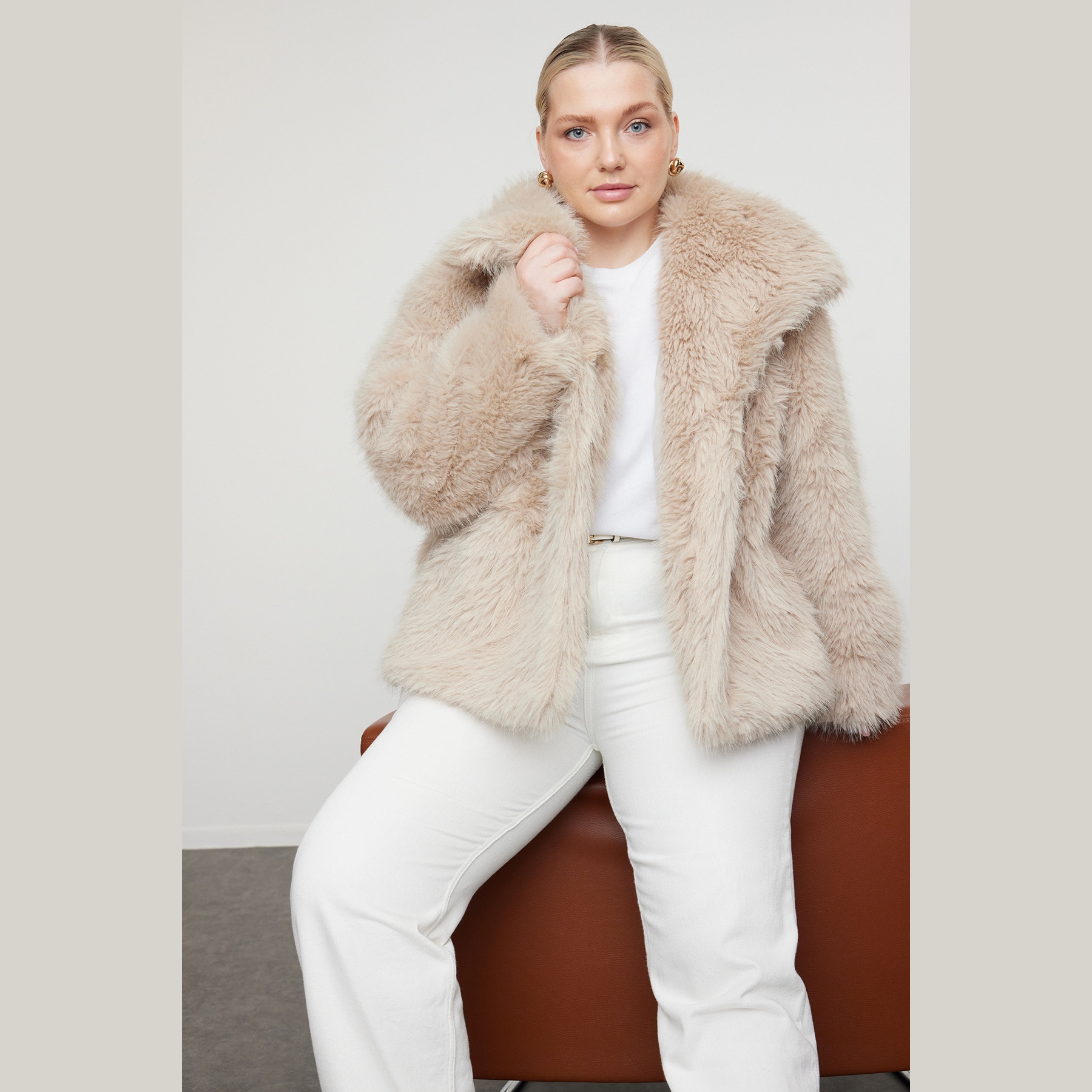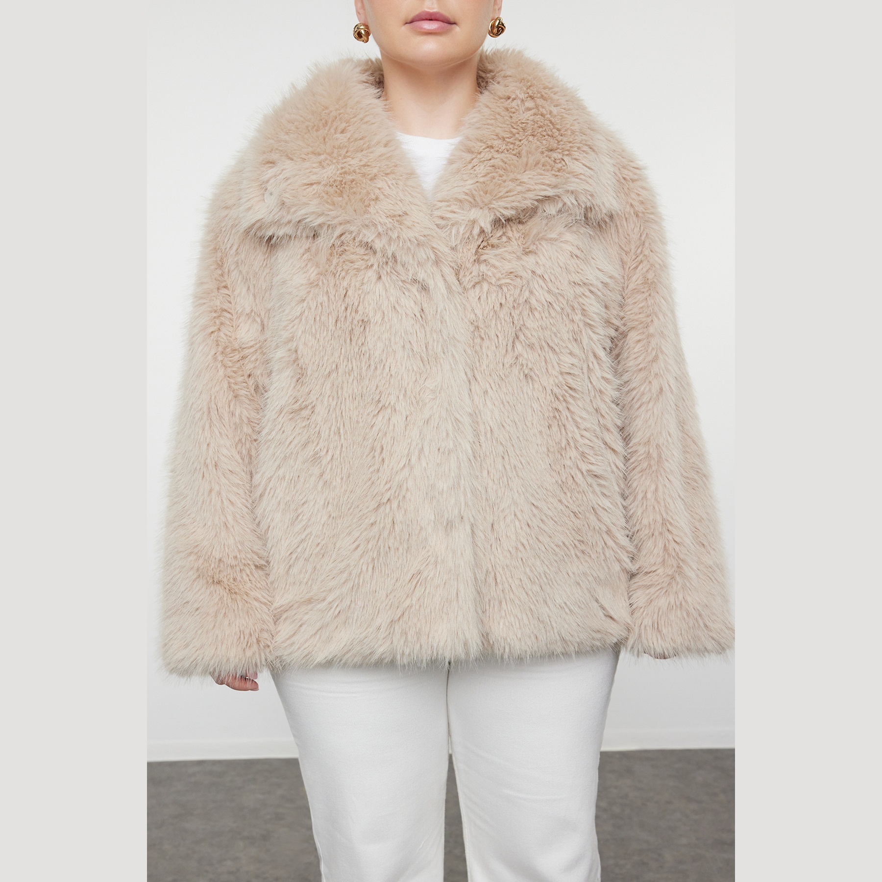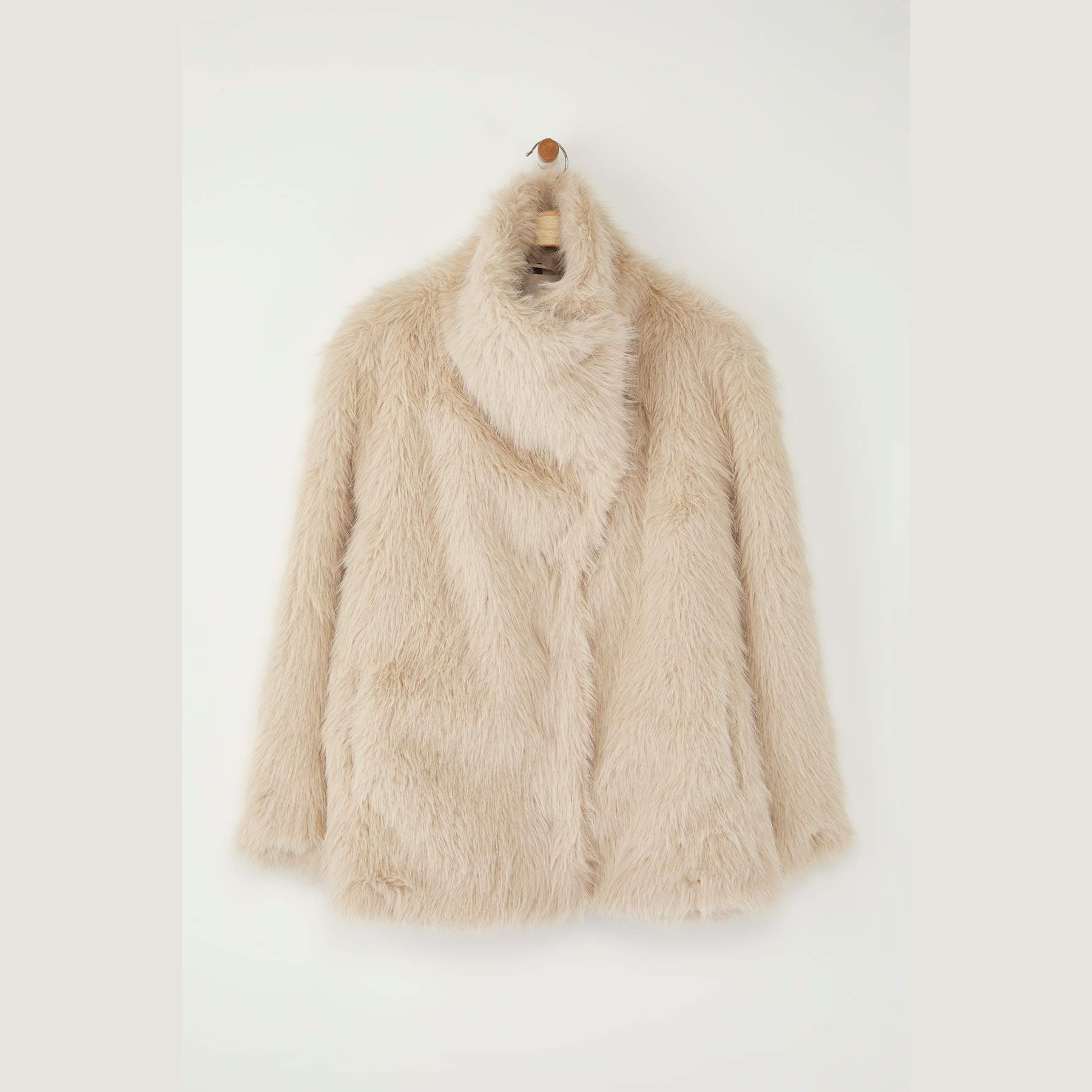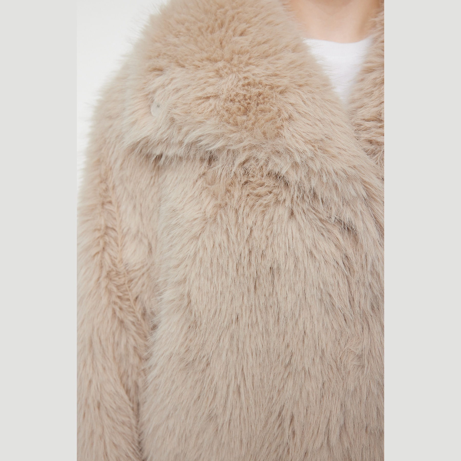 جاكيت نسائي كبير الحجم – بيج بقصة منتظمة من خامة فرو صناعي (دفء وأناقة في تصميم عملي)
