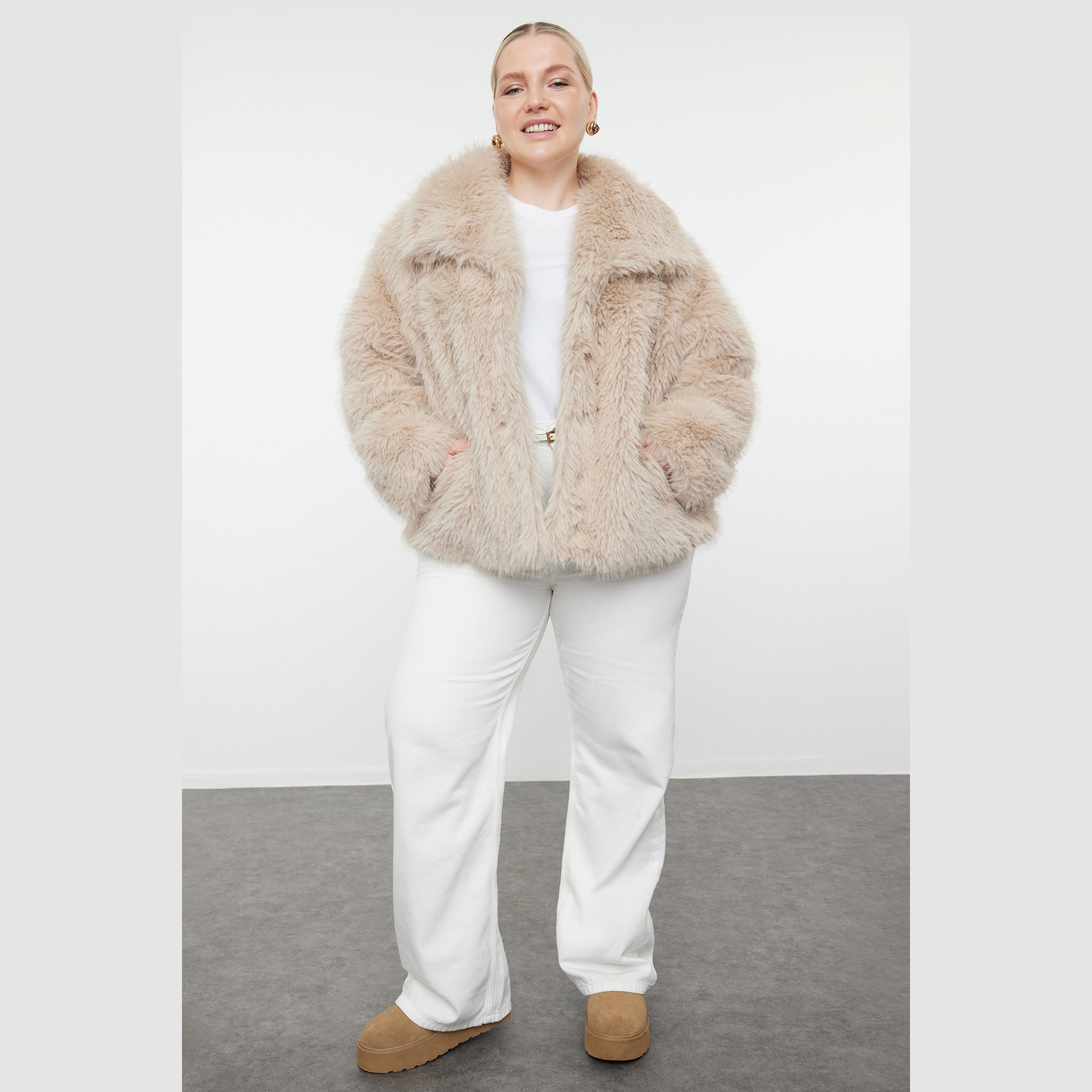 جاكيت شتوي بلون بيج ناعم من مجموعة Trendyolmilla Curve – تصميم مخصص للمقاسات الكبيرة يجمع بين الراحة والدفء بلمسة فرو صناعي أنيقة، يتميز بقصة منتظمة (Regular Fit) بطول عملي، مع ياقة بستايل جاكيت كلاسيكي، وأكمام طويلة، وإغلاق أمامي بسحاب، مصنوع من خامة منسوجة بتركيبة 100% بوليستر، ومبطن بالكامل، ما يجعله مثاليًا لأيام الشتاء الباردة.