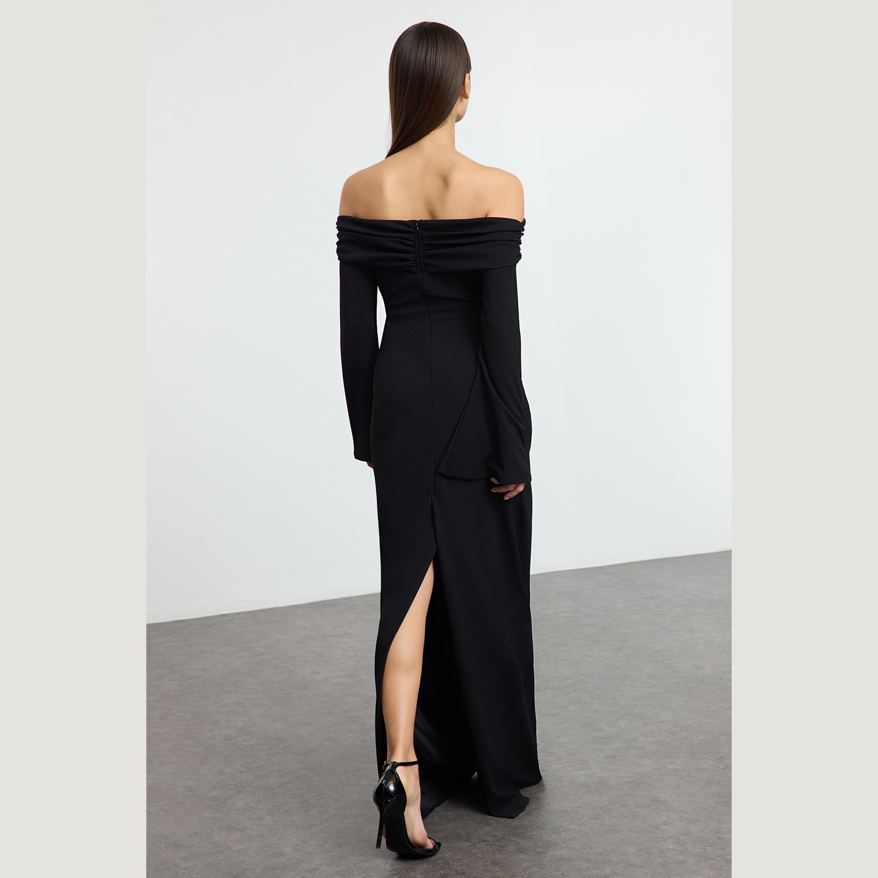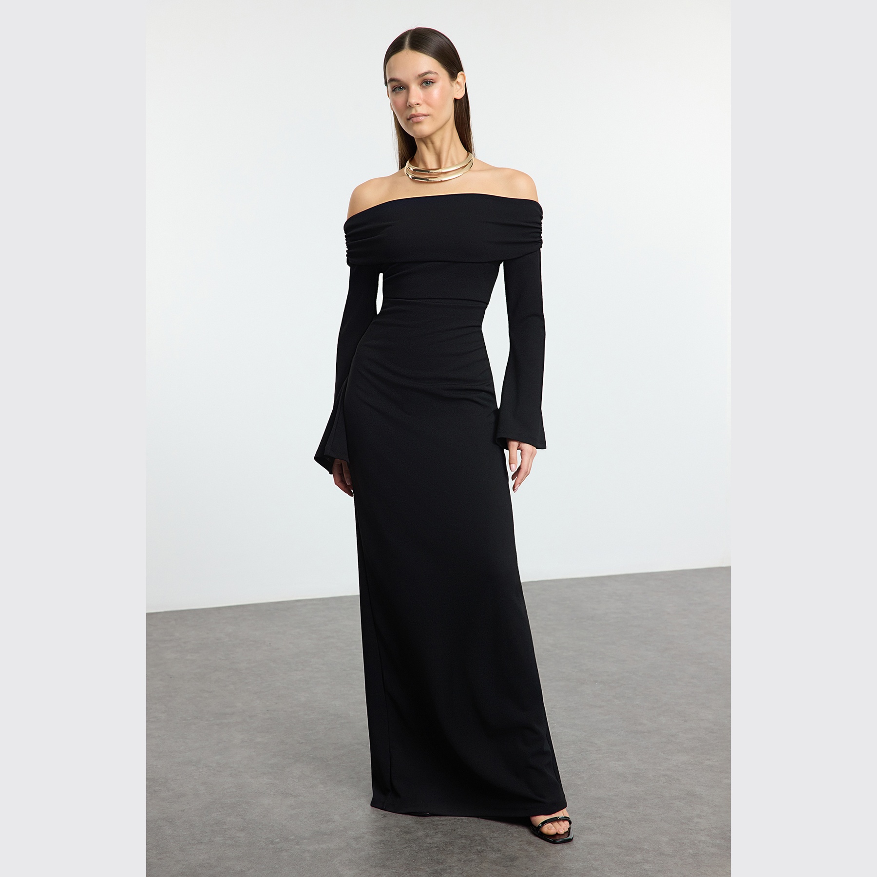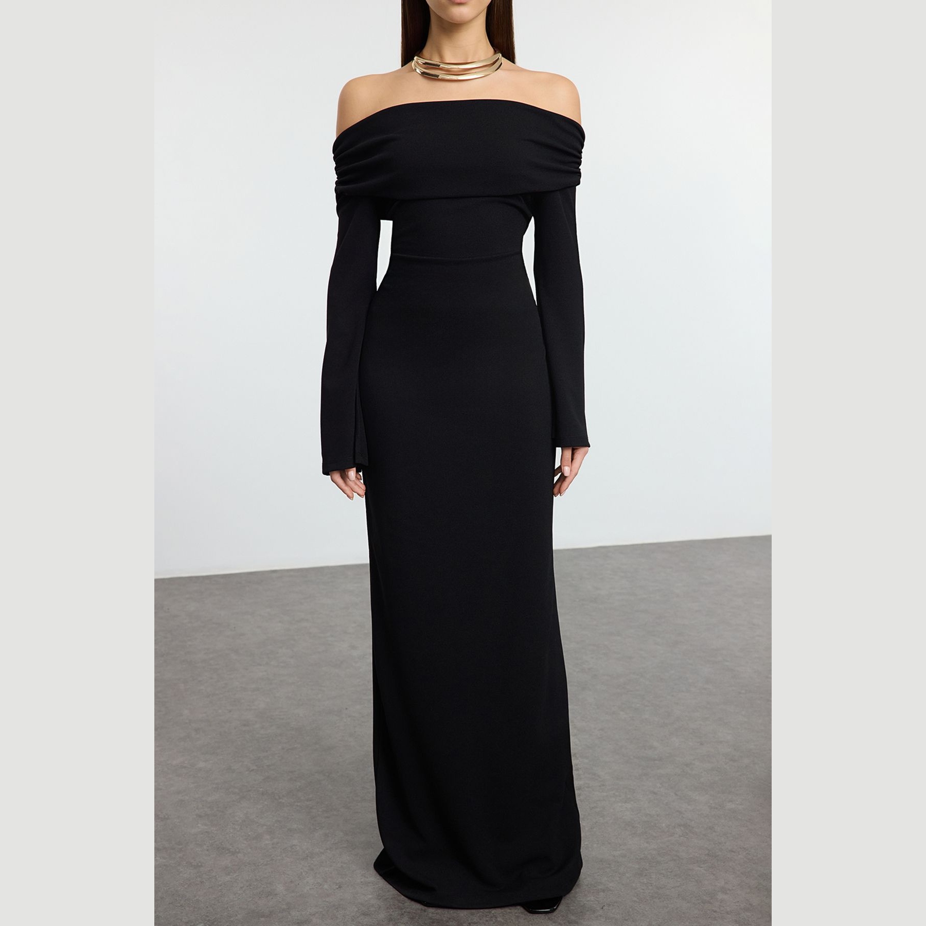 فستان نسائي – أسود طويل بقصة ضيقة وياقة كارمن من خامة تريكو أنيقة (إطلالة ساحرة للمناسبات الخاصة)