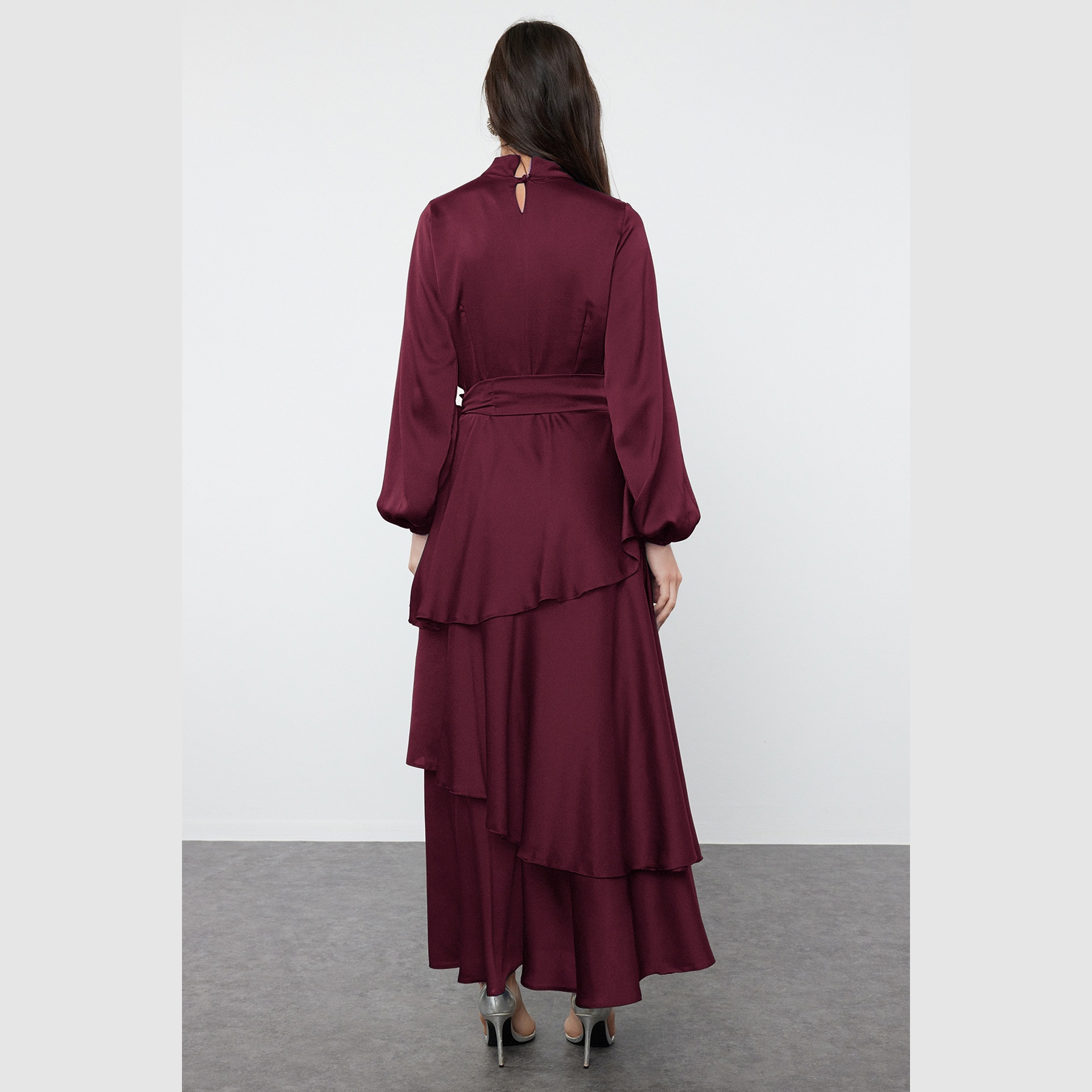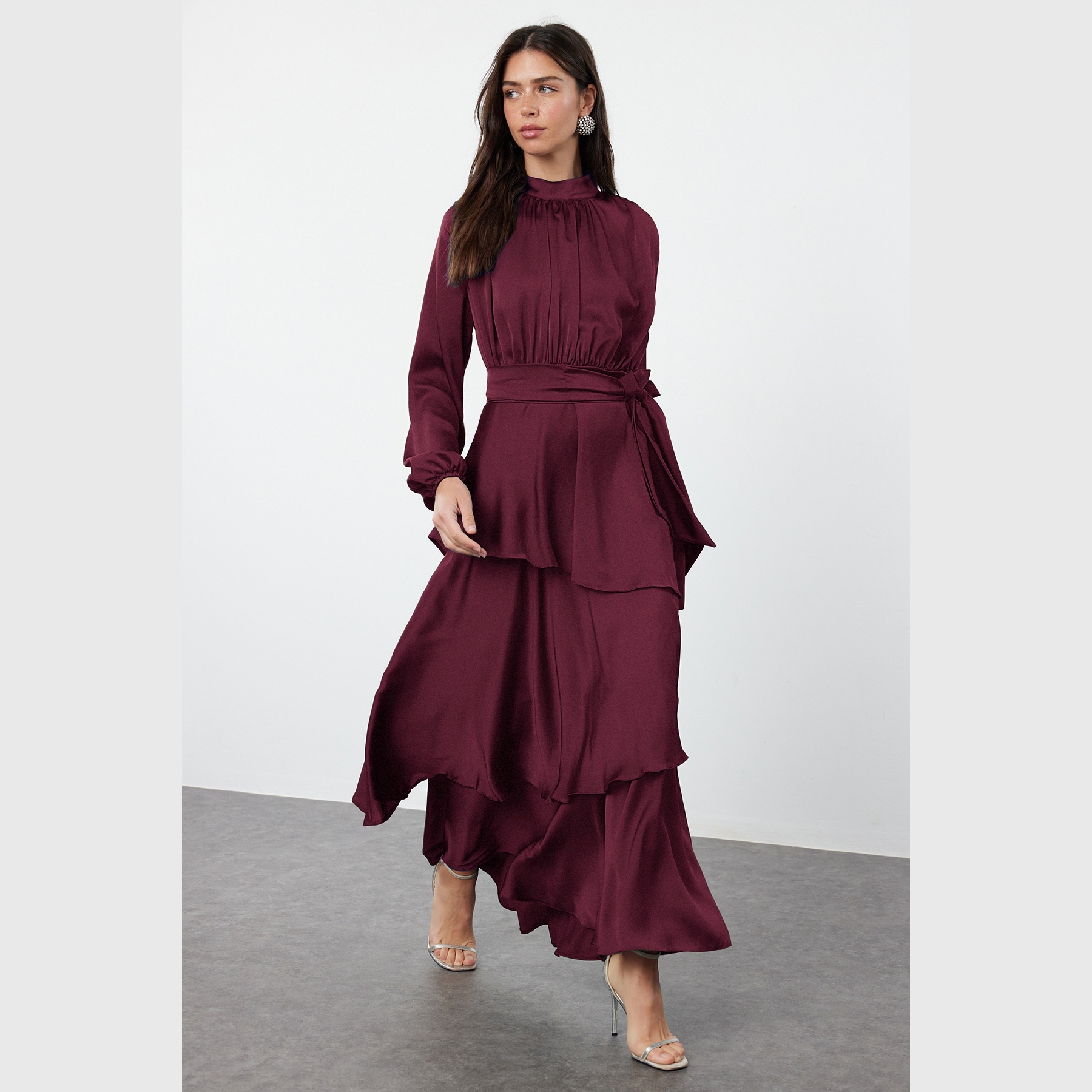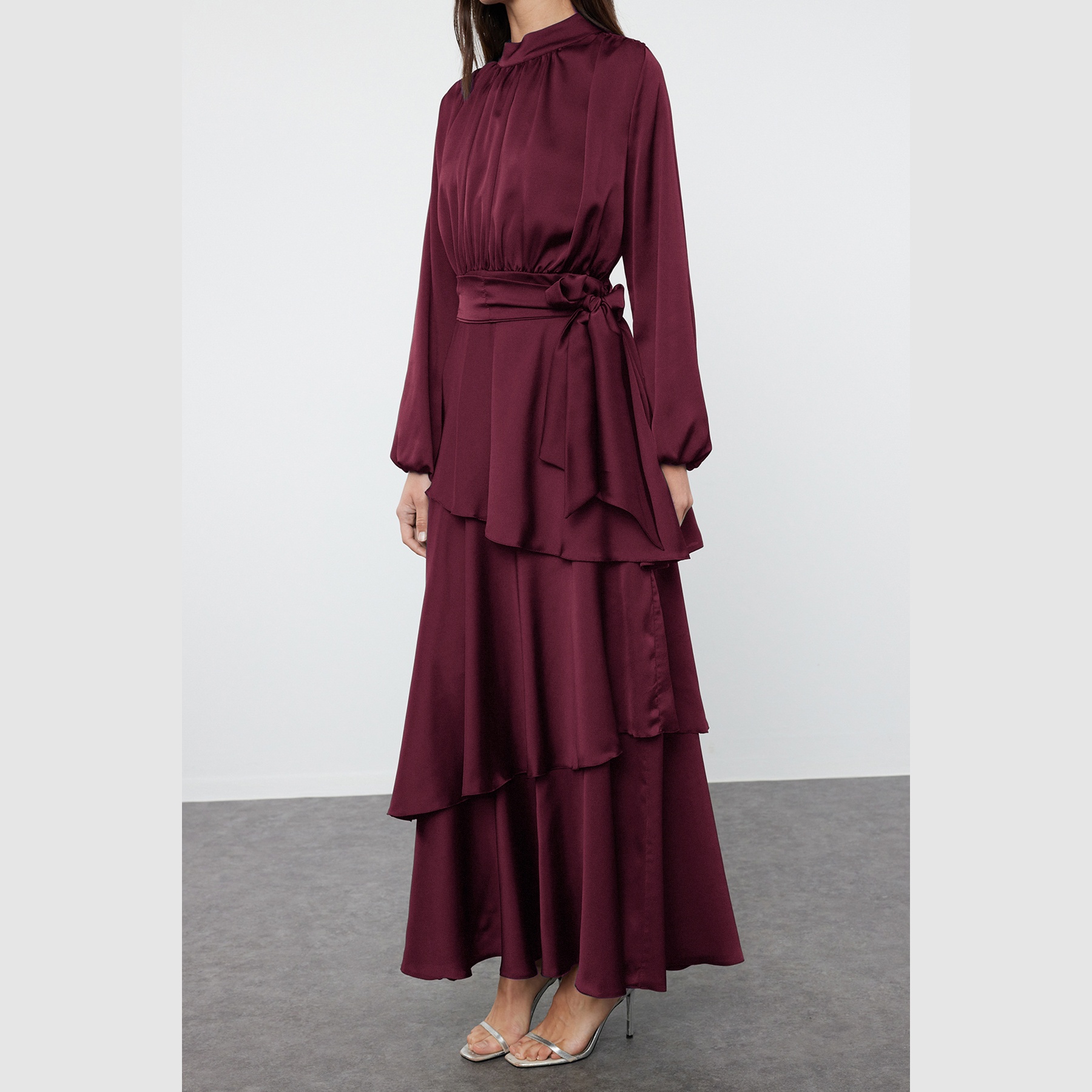 فستان نسائي – بوردو طويل من خامة ساتان بطبقات ناعمة (أناقة محتشمة بلمسة فاخرة)