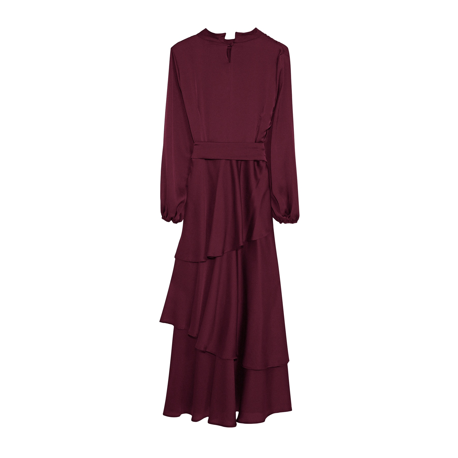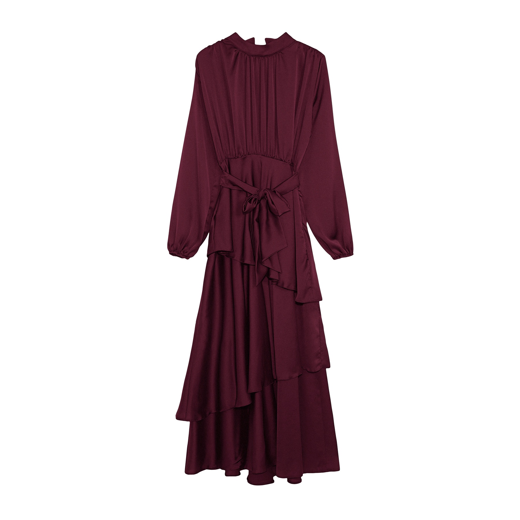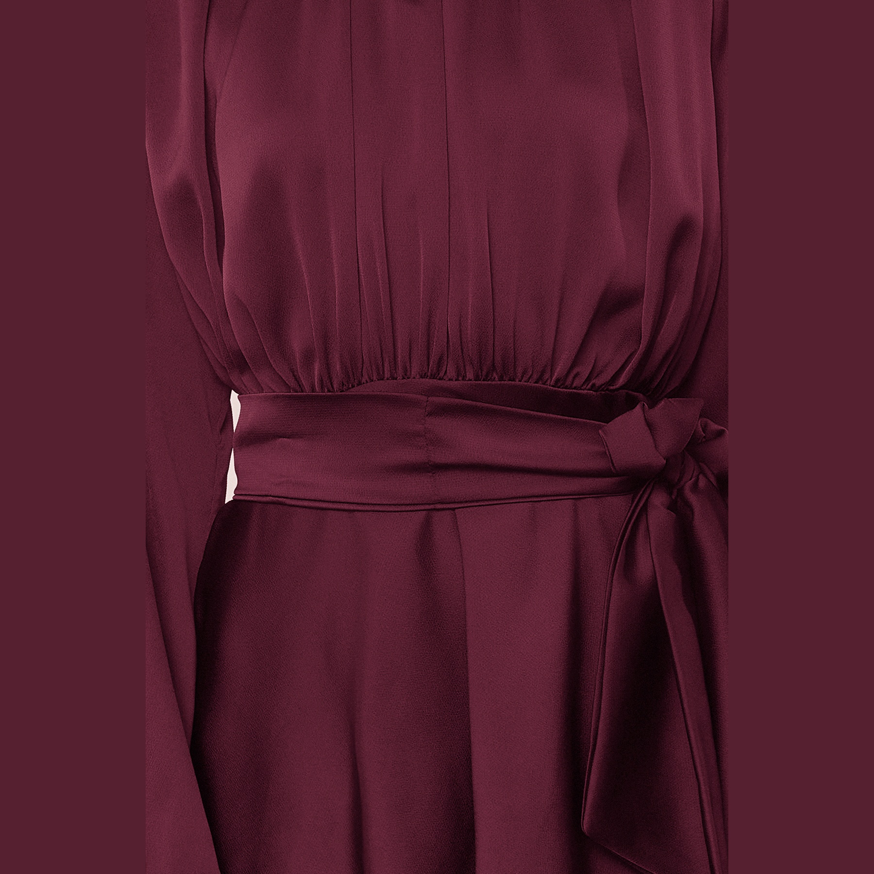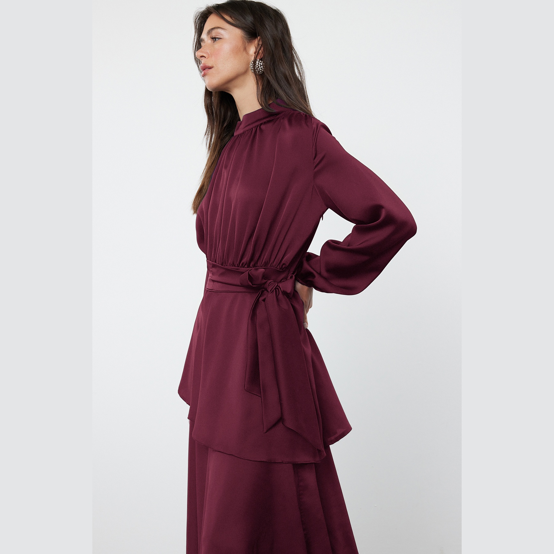 فستان نسائي – بوردو طويل من خامة ساتان بطبقات ناعمة (أناقة محتشمة بلمسة فاخرة)