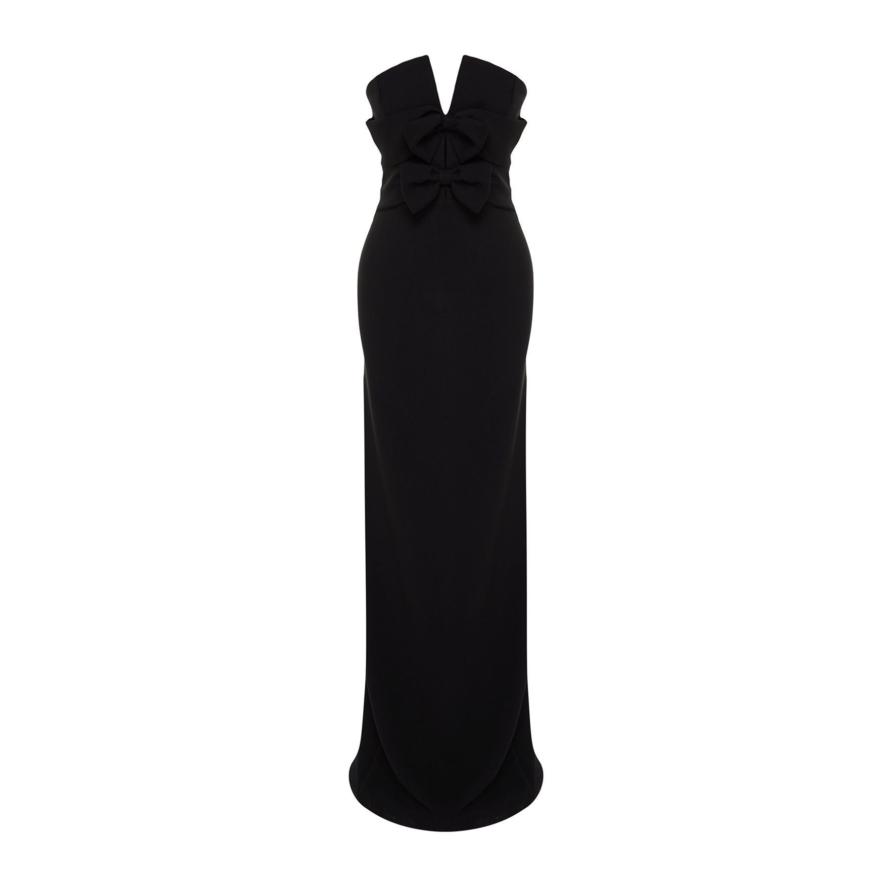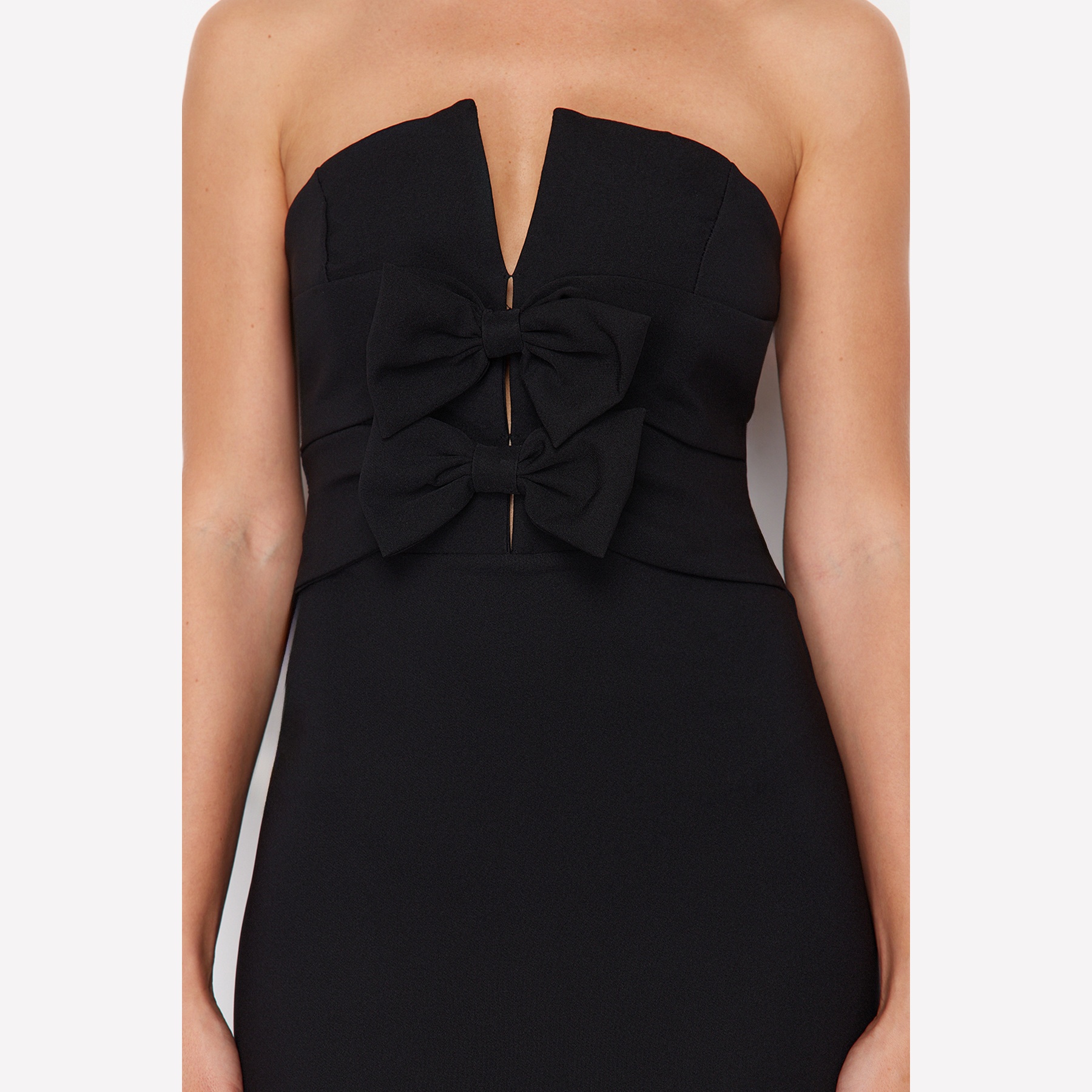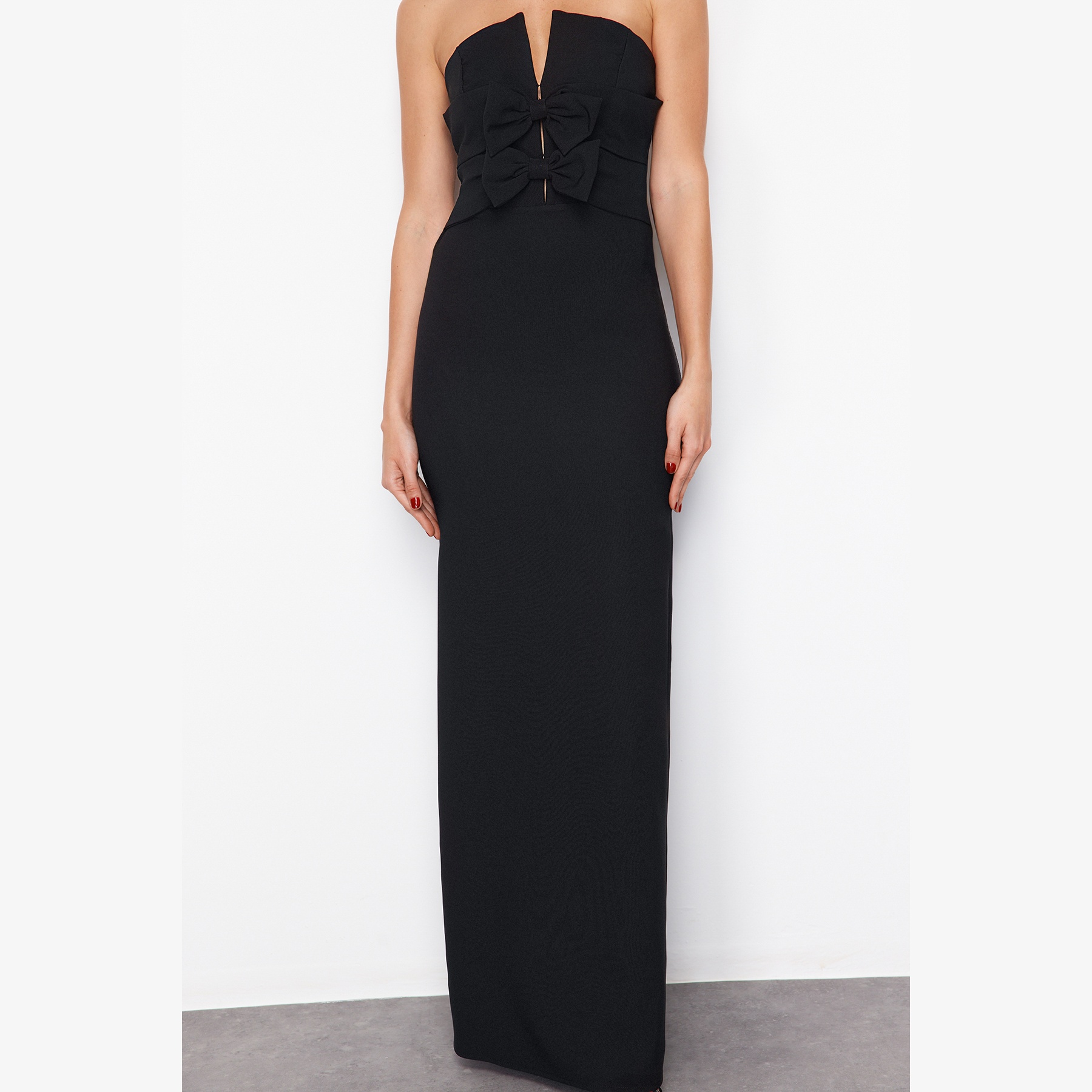 فستان نسائي – أسود طويل بقصة ضيقة وتفصيلة فيونكة من خامة دوكوم (إطلالة أنثوية بلمسة كلاسيكية)