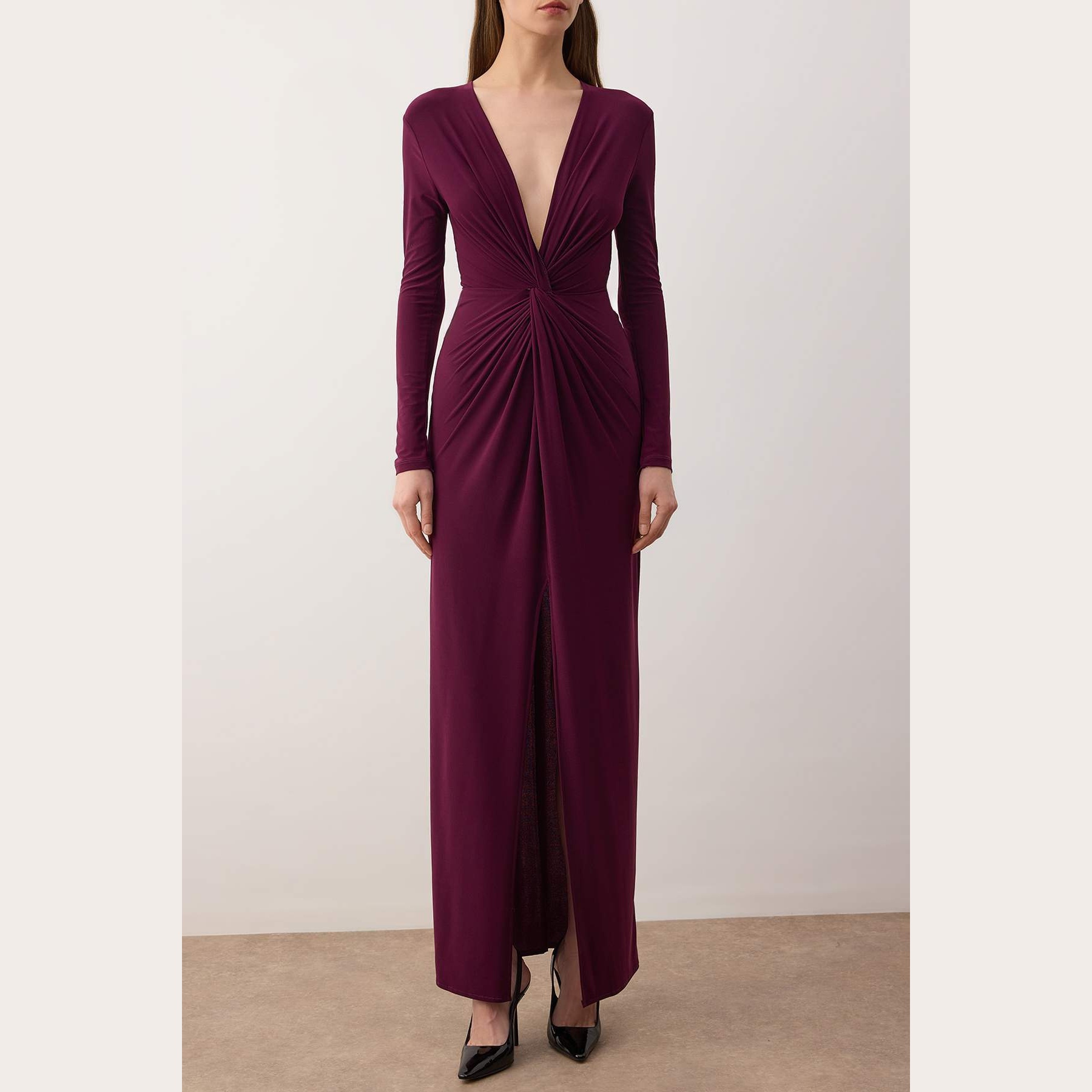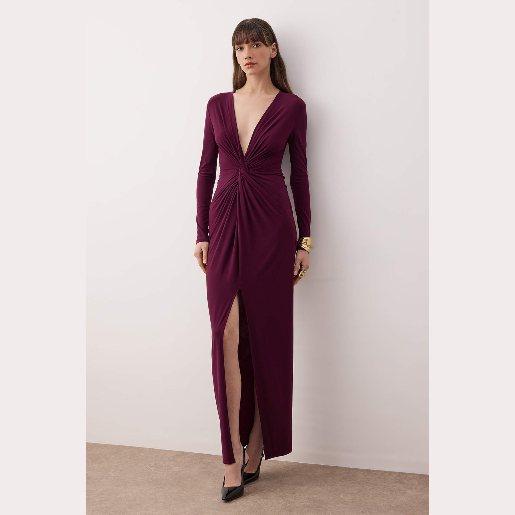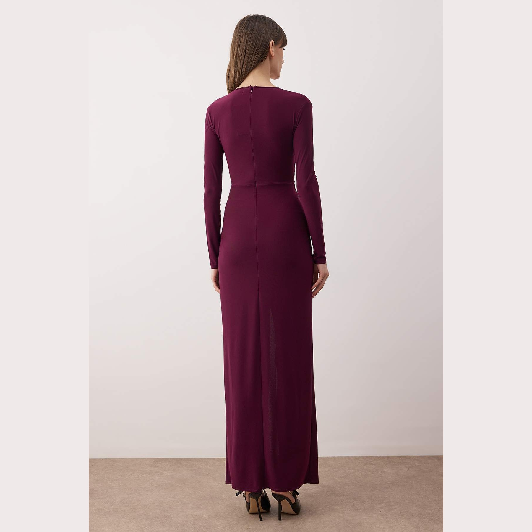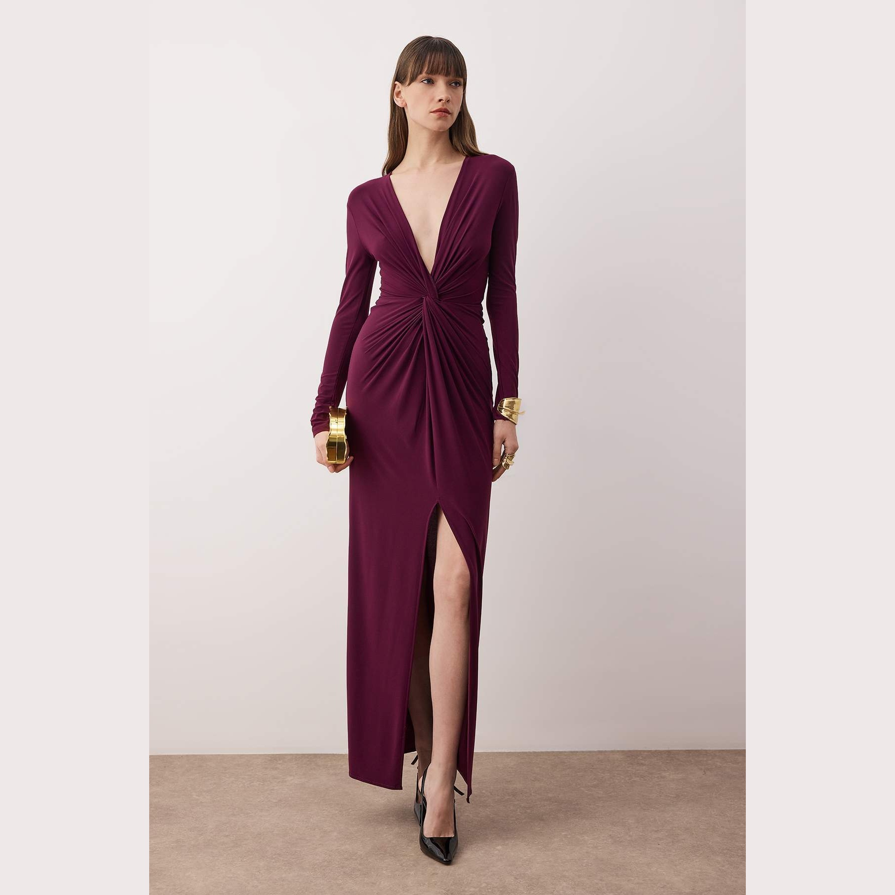 فستان نسائي – بوردو طويل بياقة كروڤاز من خامة تريكو أنيقة (إطلالة راقية للمناسبات الخاصة)